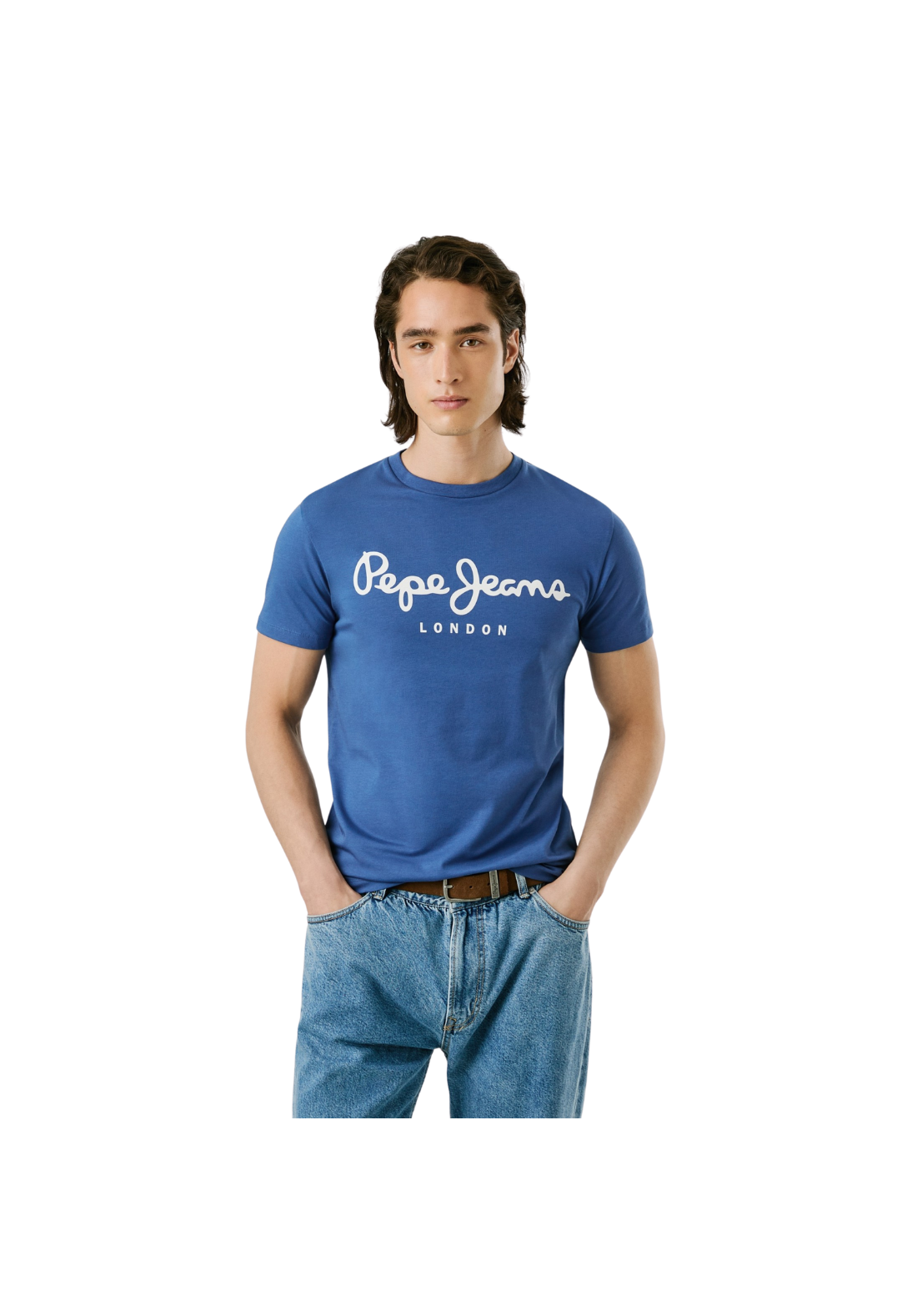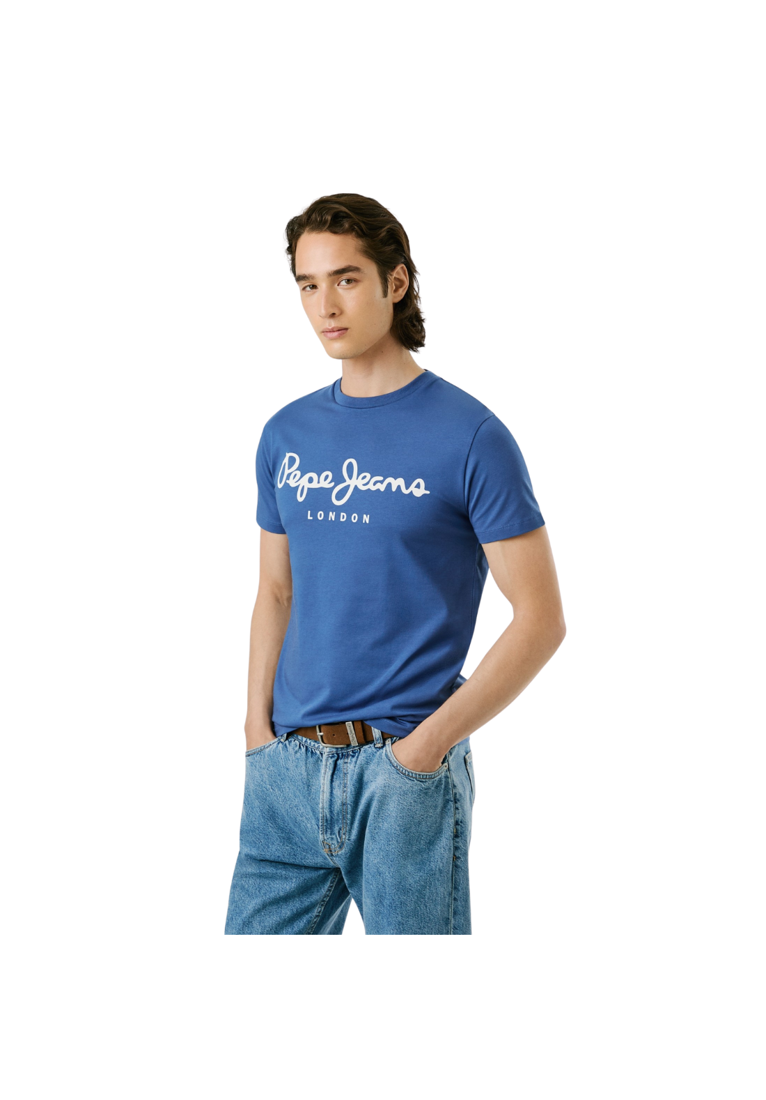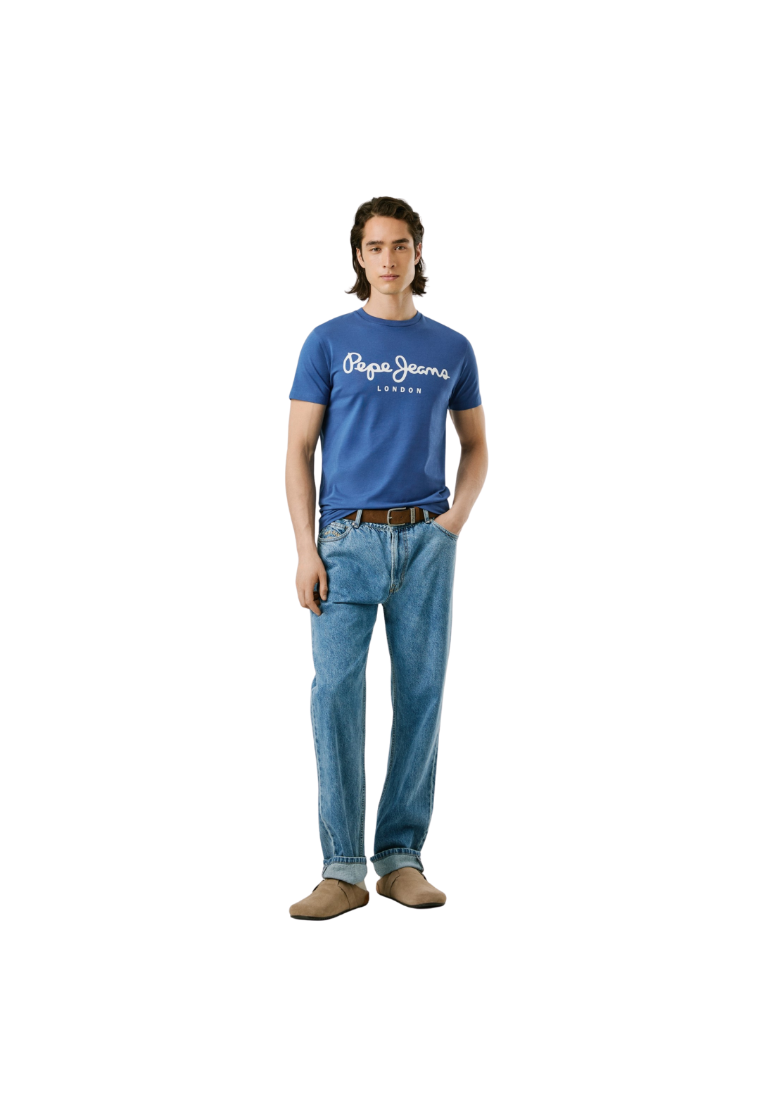 Camiseta en tejido elástico, de manga corta y cuello redondo con detalle canalé. Viene con maxi logo PEPEJEANS estampado en el pecho y el acabado es de doble pespunte en mangas y bajo.