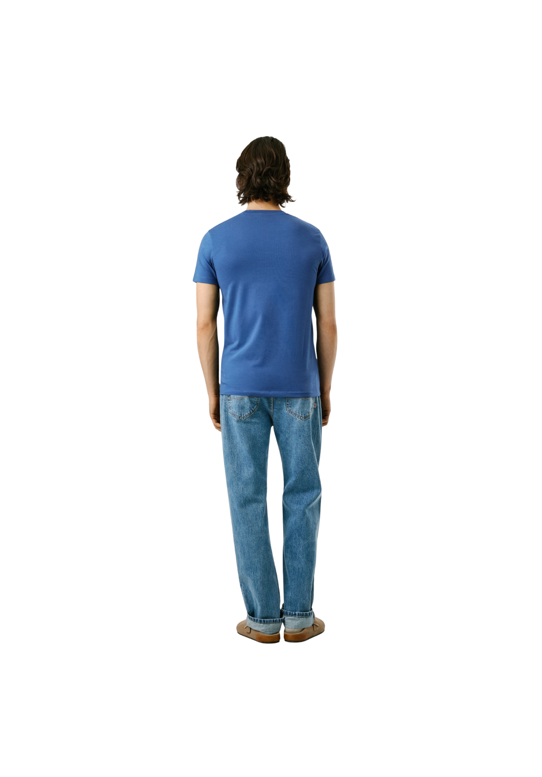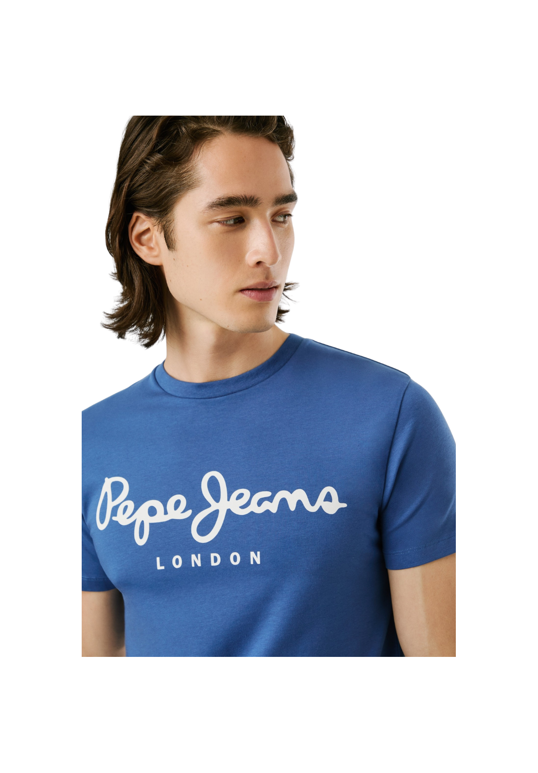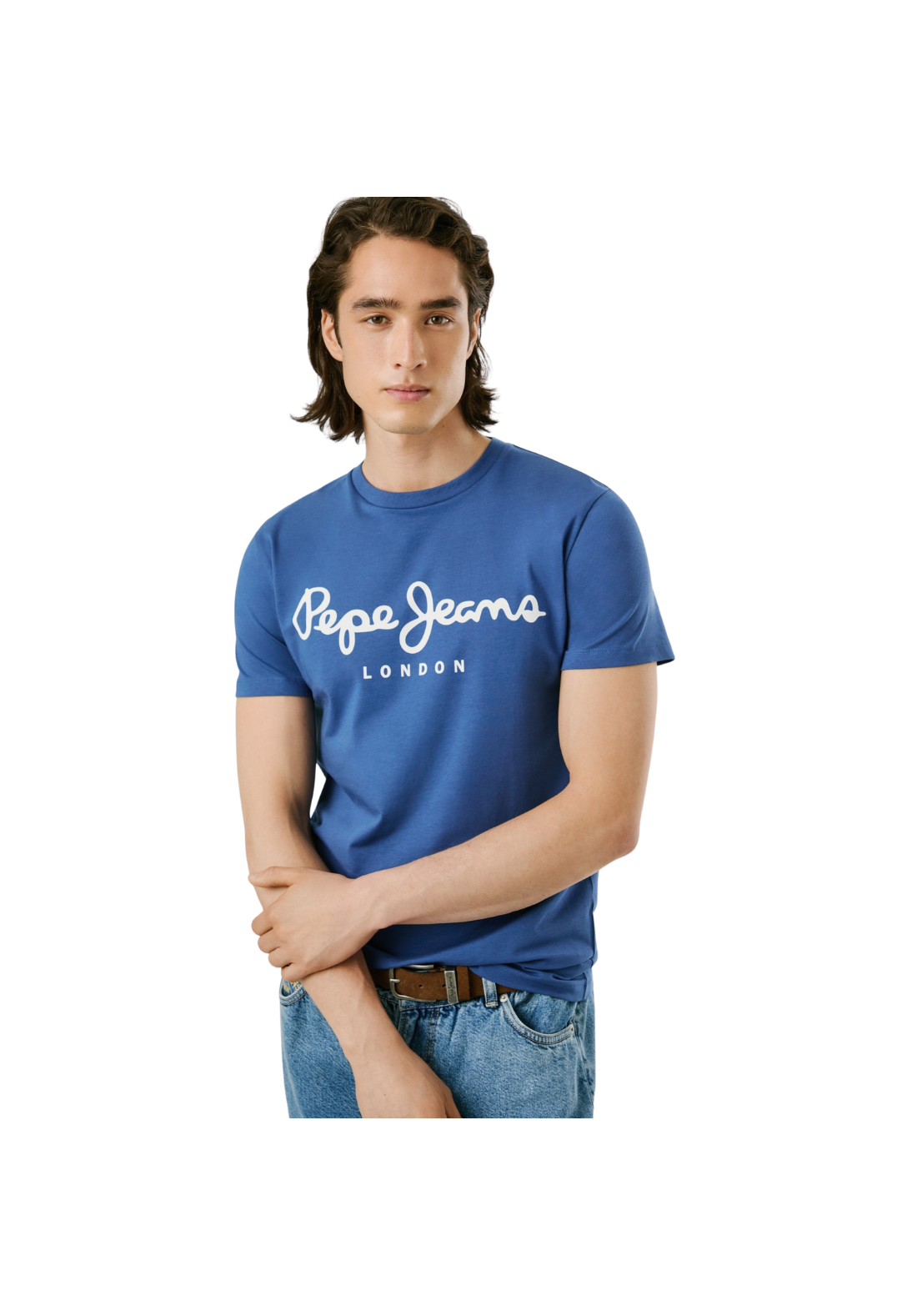 Camiseta en tejido elástico, de manga corta y cuello redondo con detalle canalé. Viene con maxi logo PEPEJEANS estampado en el pecho y el acabado es de doble pespunte en mangas y bajo.