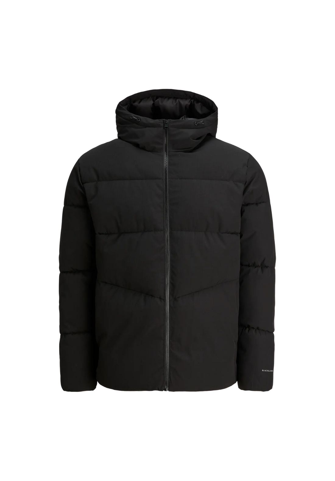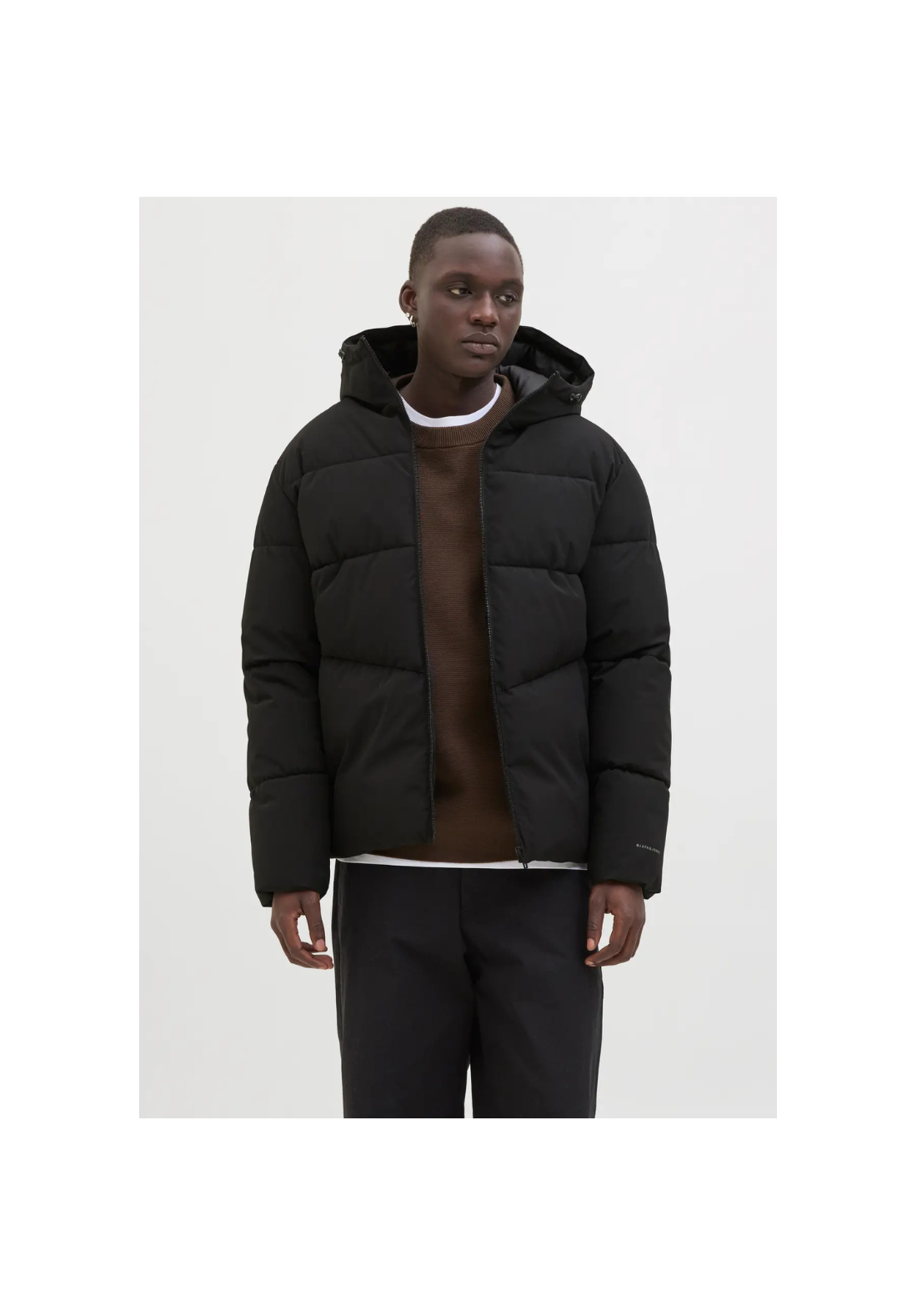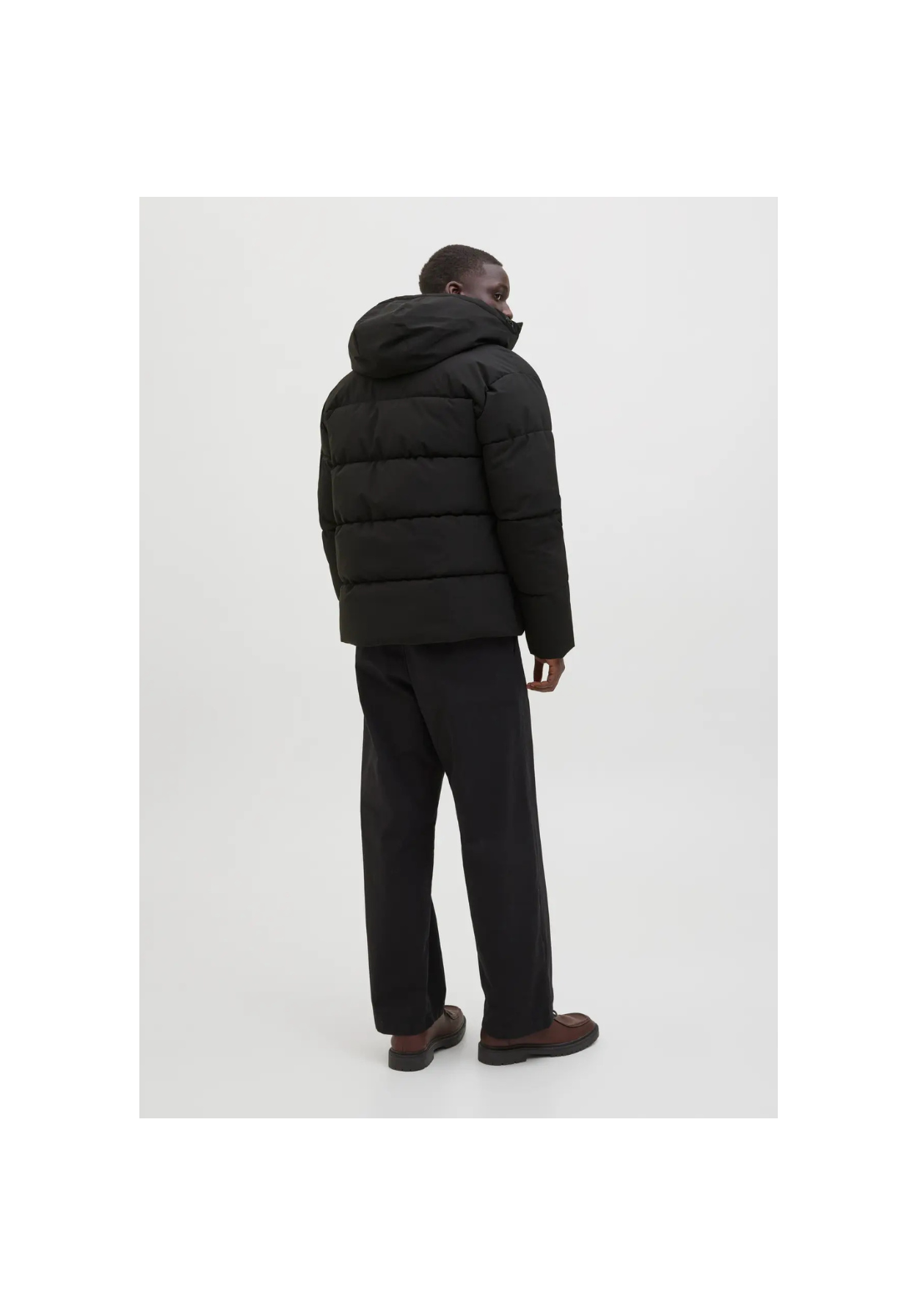 Chaqueta corta acolchada, con capucha con cordón ajustable. El cierre es con cremallera y tiene bolsillos laterales.