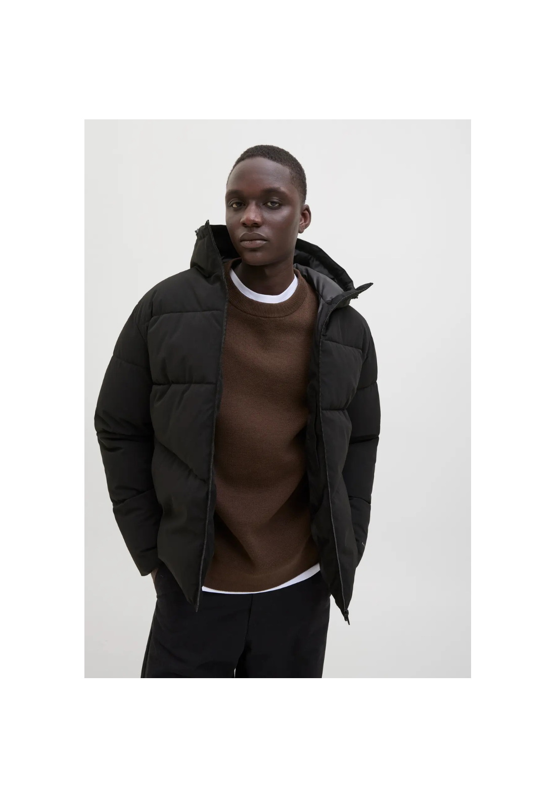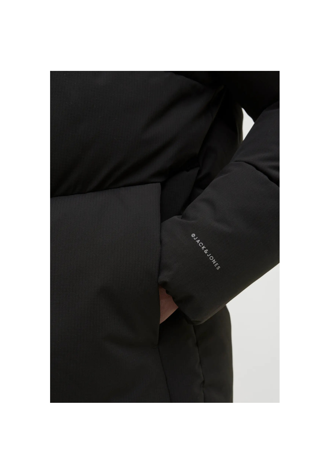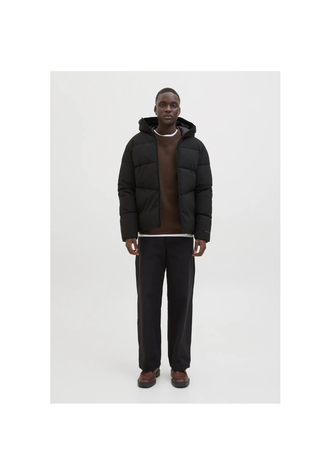 Chaqueta corta acolchada, con capucha con cordón ajustable. El cierre es con cremallera y tiene bolsillos laterales.