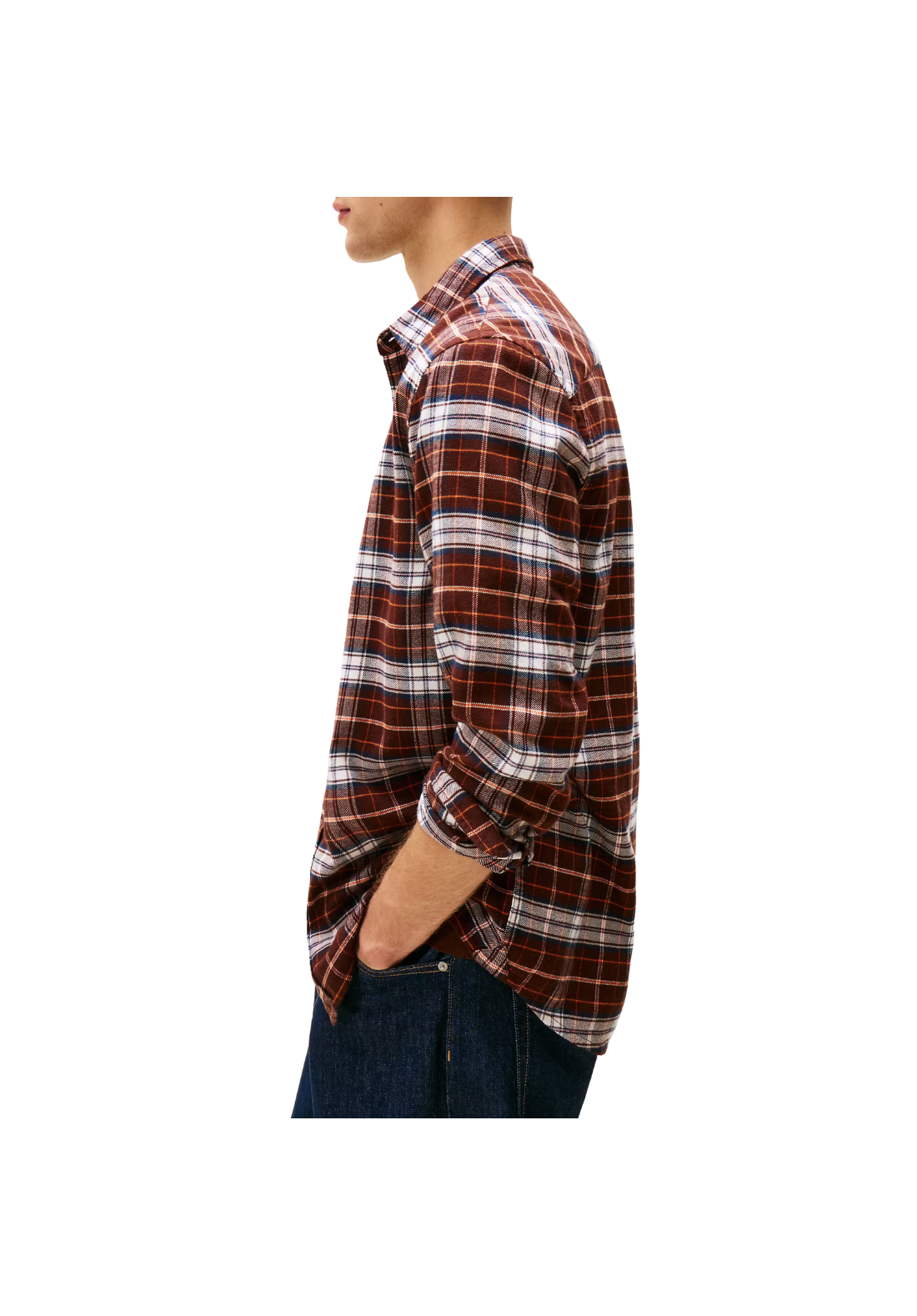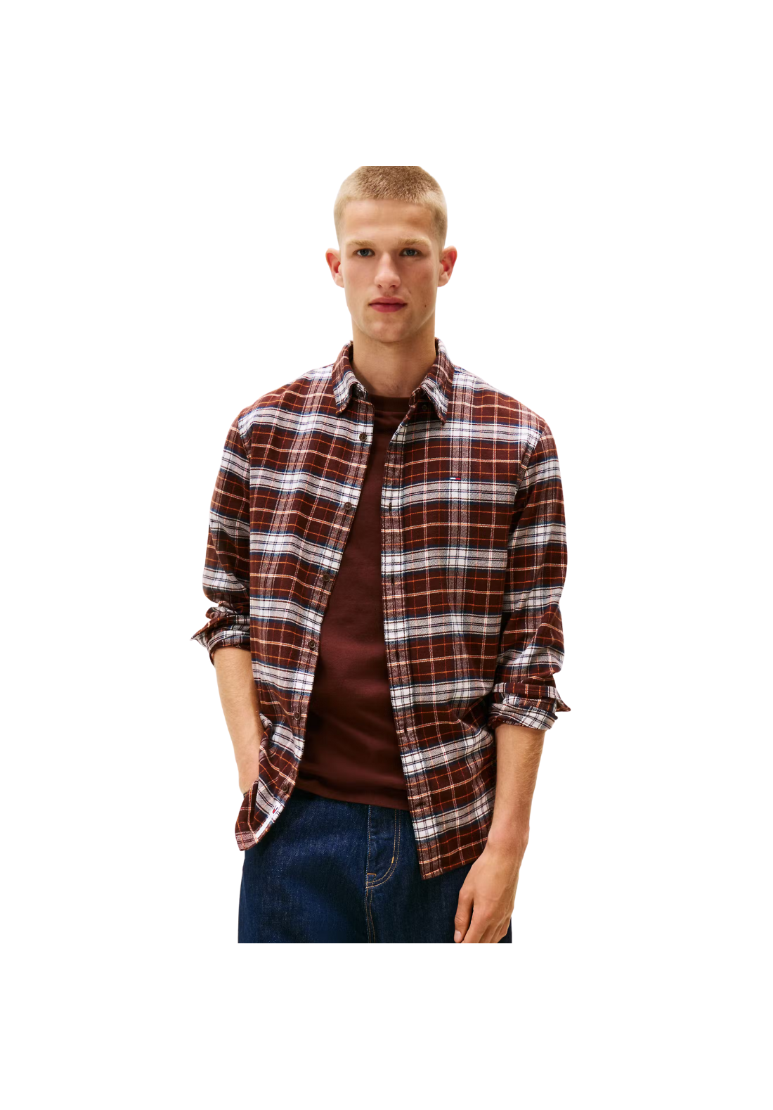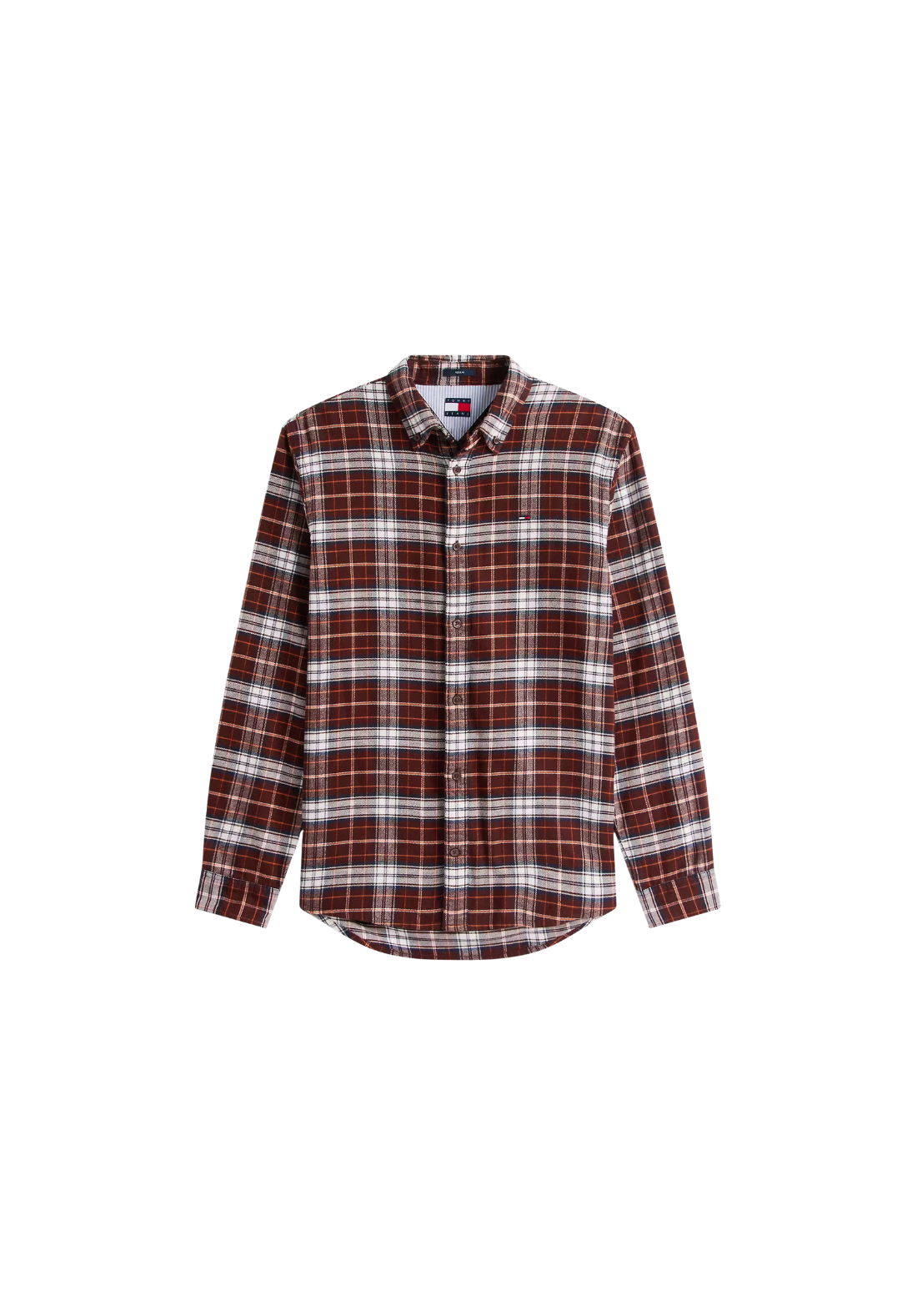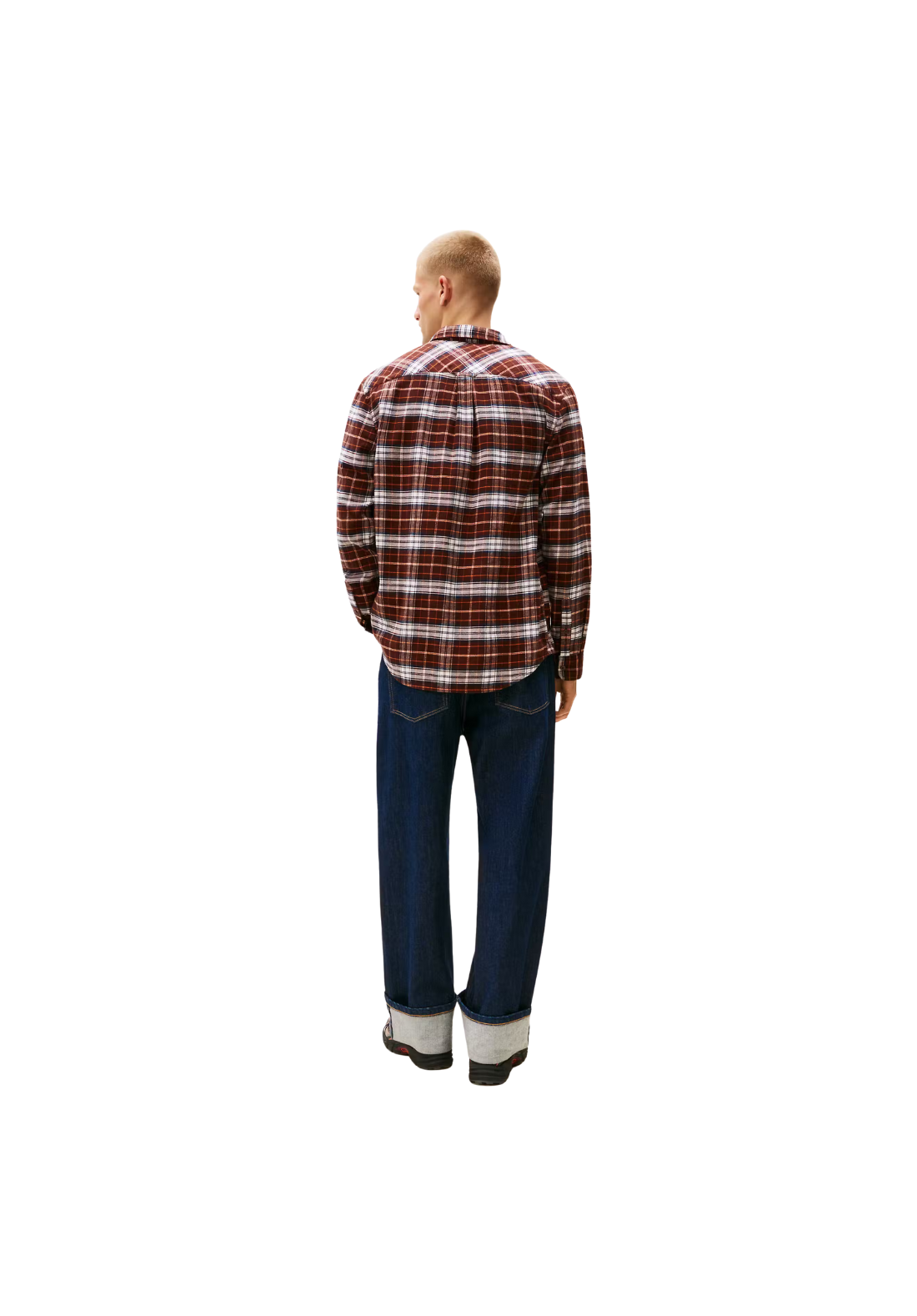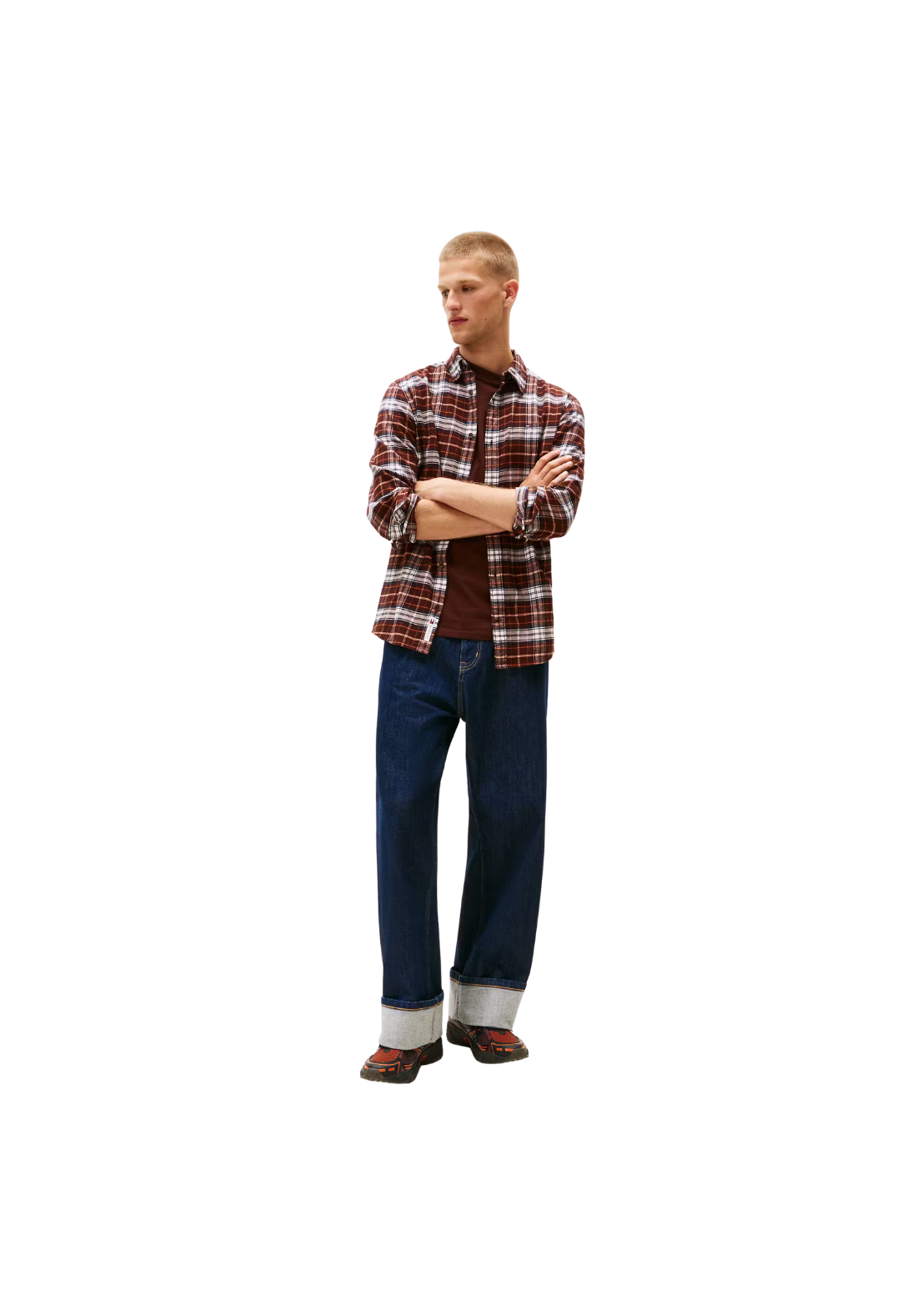 Camisa de cuadros, con cuello camisero y cierre frontal de botones.