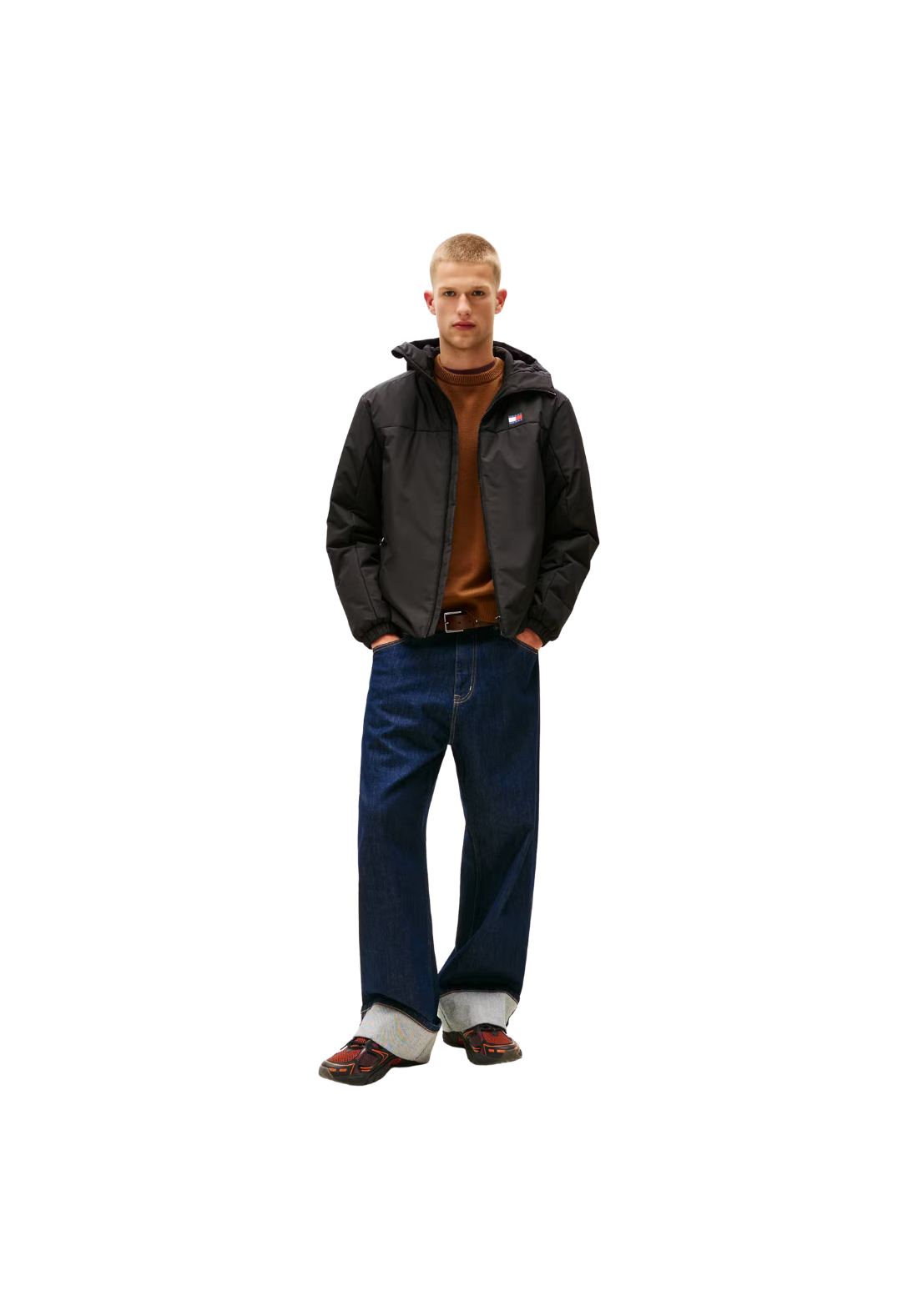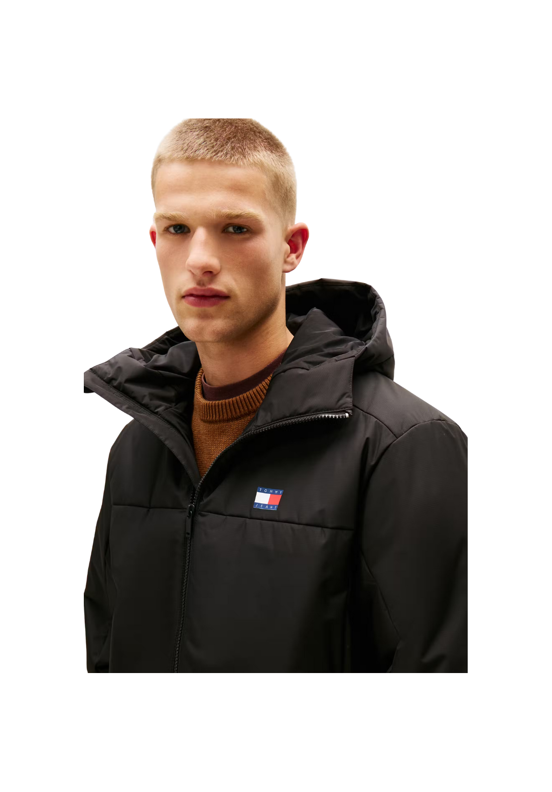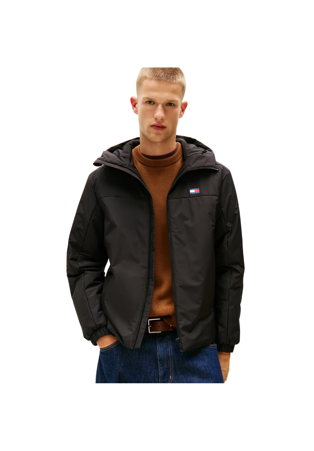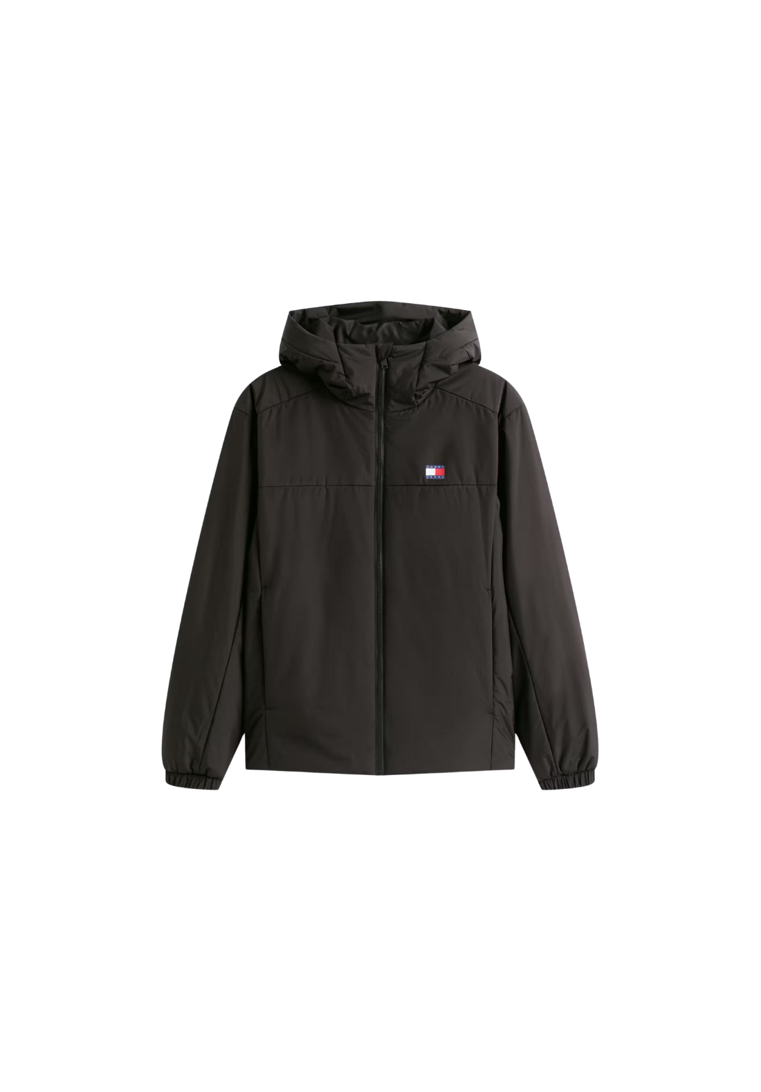 Chaqueta corta, con cierre frontal de cremallera y capucha.