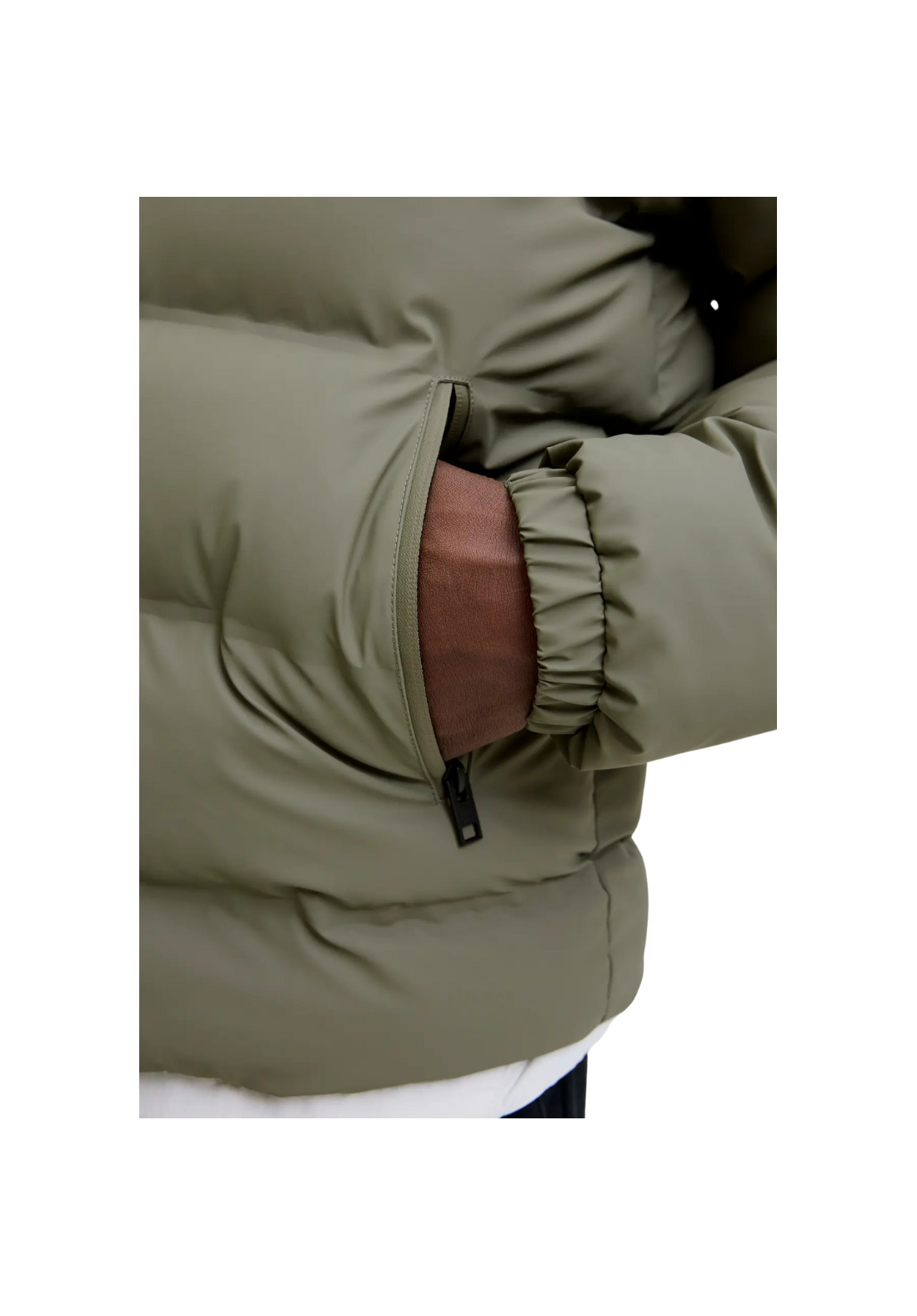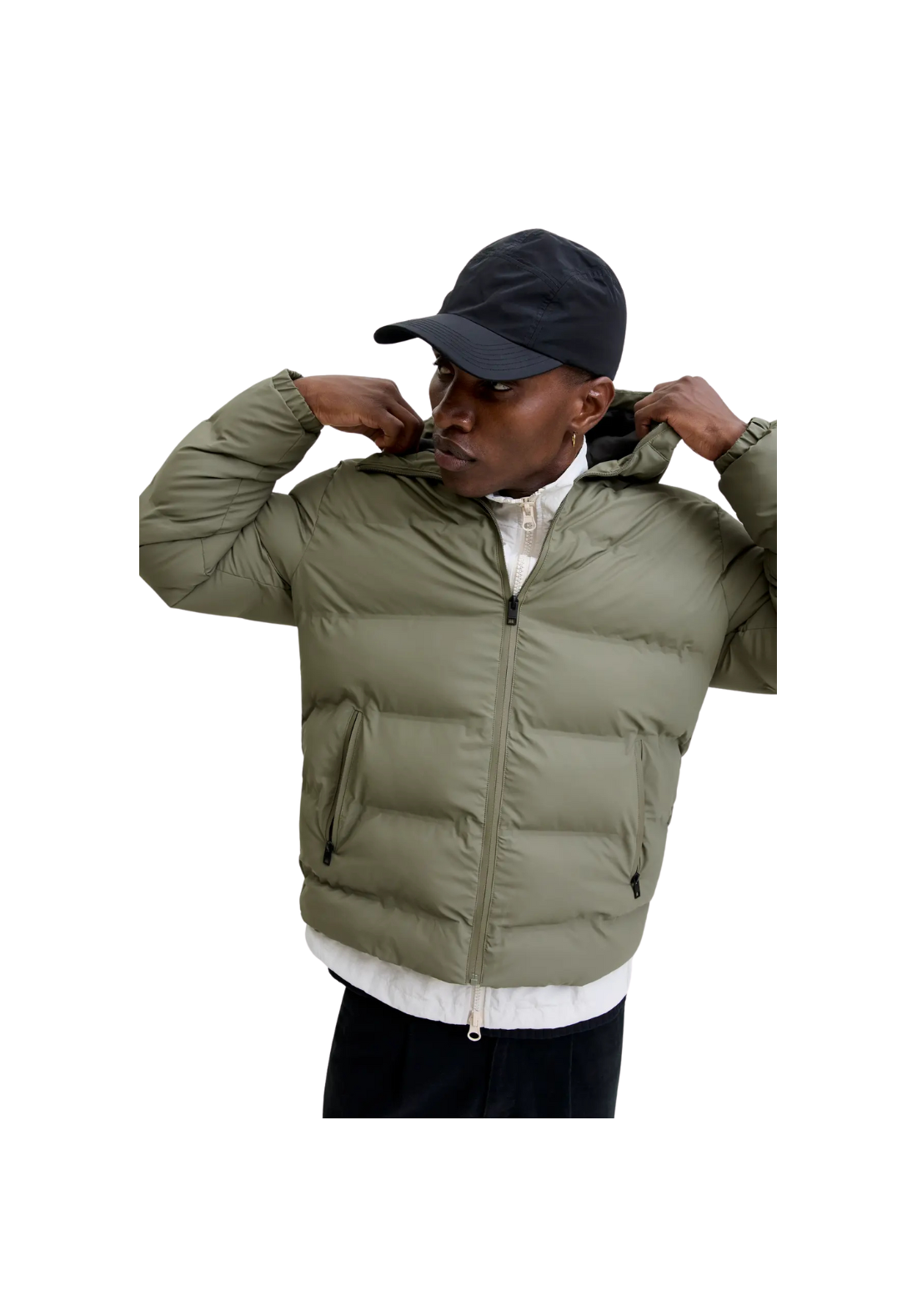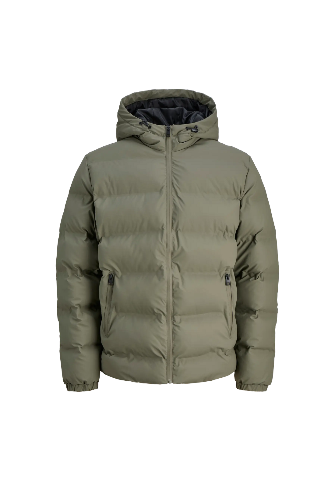 Abrigo corto acolchado, con capucha y cordón ajustable. Cierre frontal de cremallera y bolsillos delanteros también con cremallera.