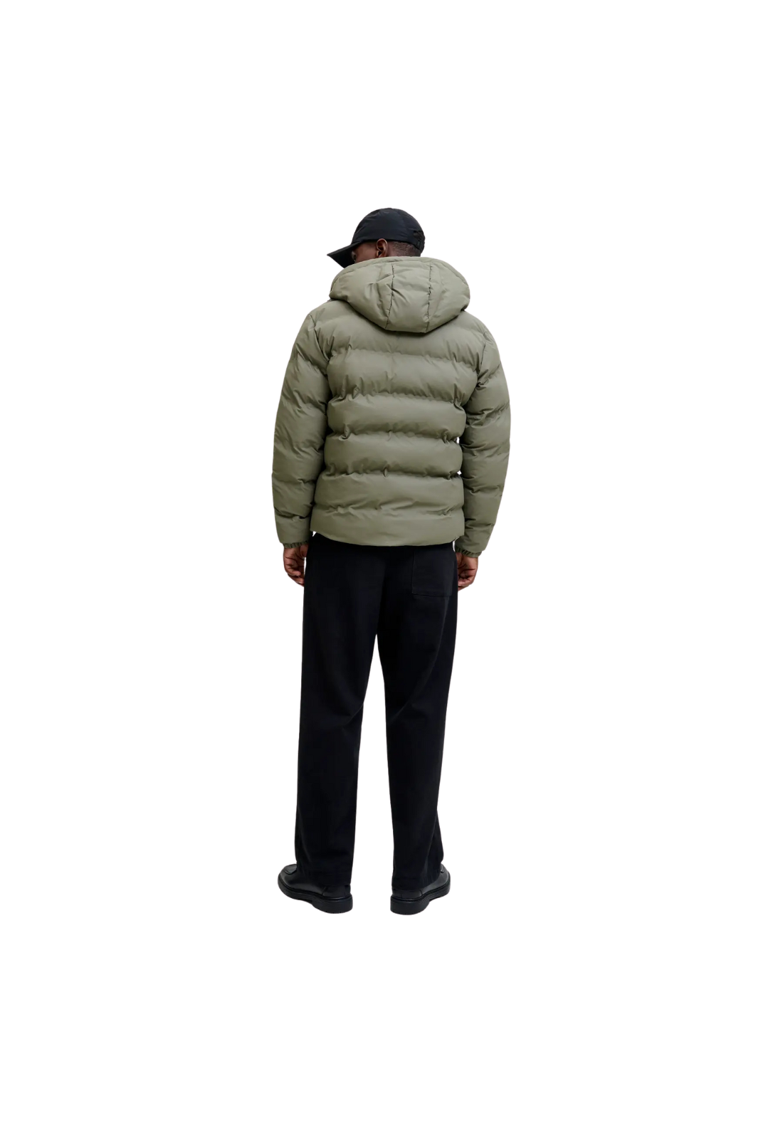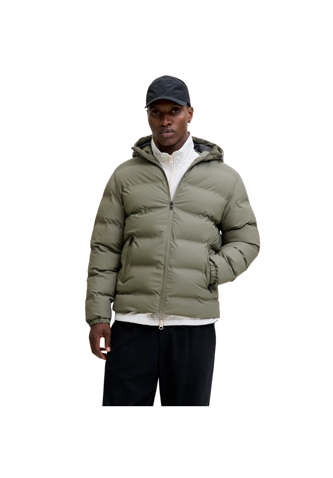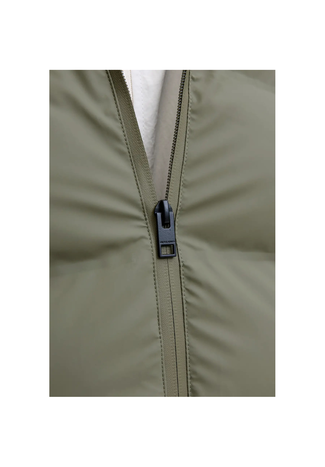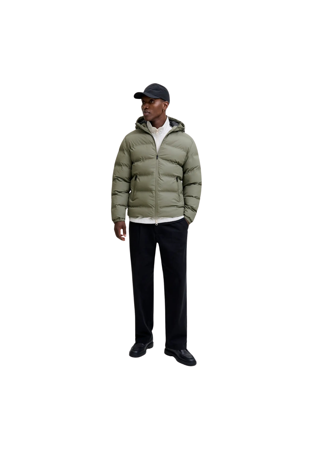 Abrigo corto acolchado, con capucha y cordón ajustable. Cierre frontal de cremallera y bolsillos delanteros también con cremallera.
