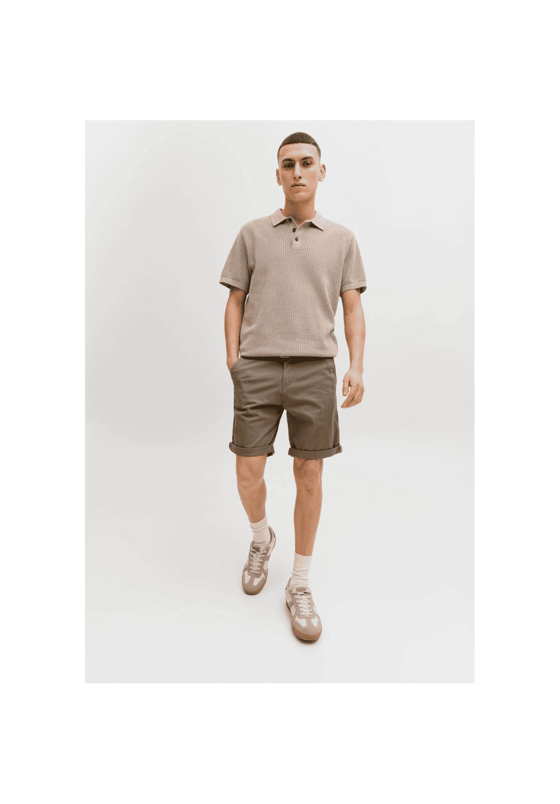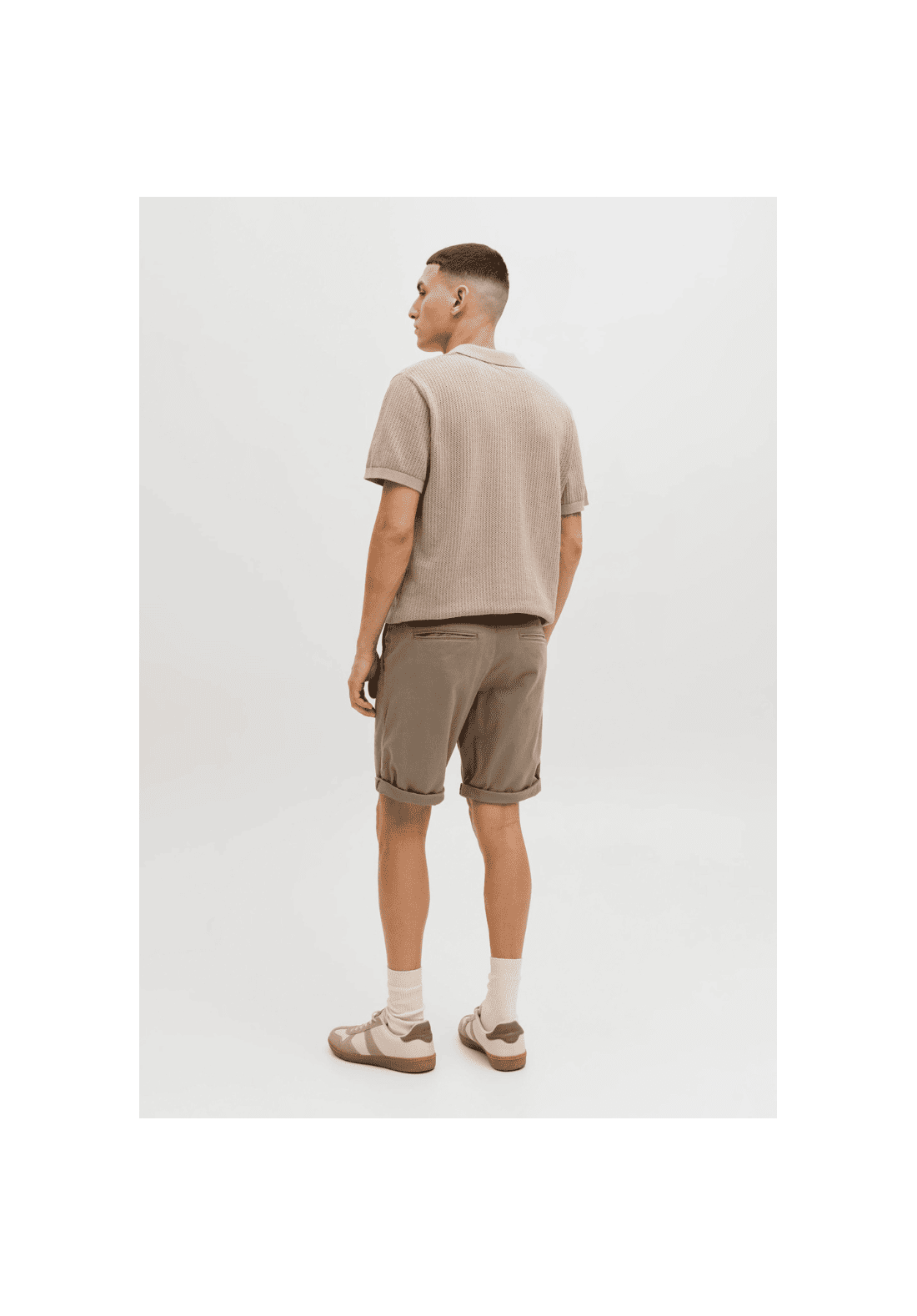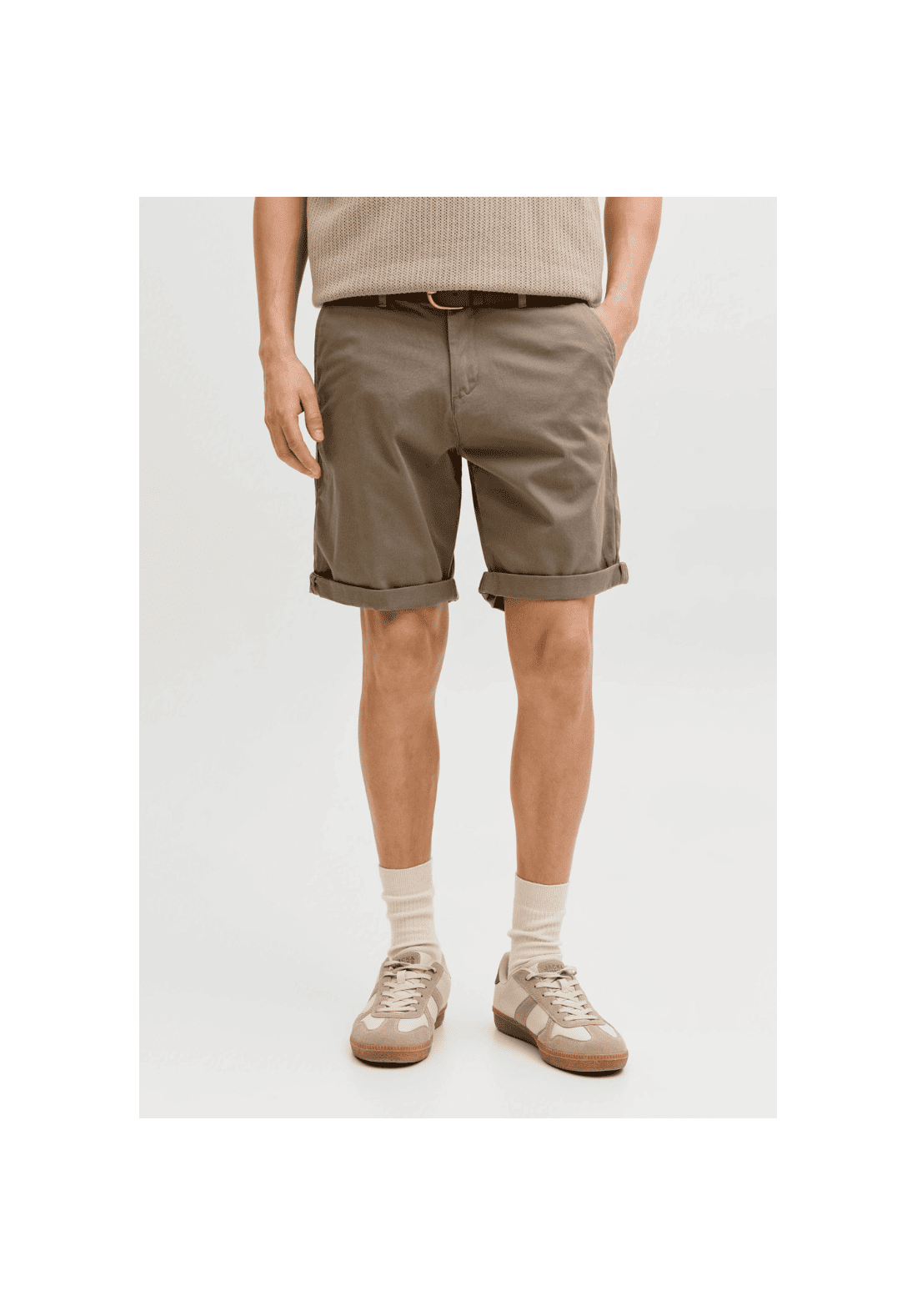 Shorts chinos con bragueta con cremallera. Tiro normal y largo medio a muslo.