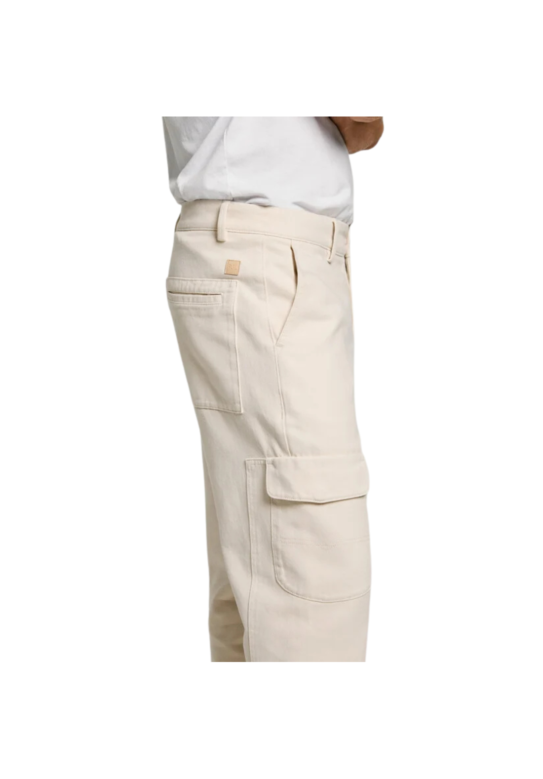 Pantalón cargo en tejido de lona elástica. Tiene bolsillos italianos y bolsillos de parche laterales y traseros con solapa. El cierre es con cremallera y botón.