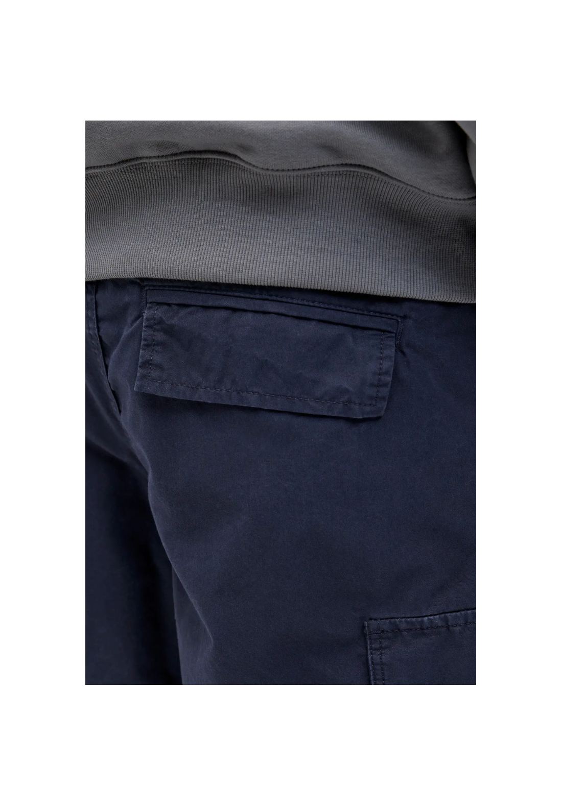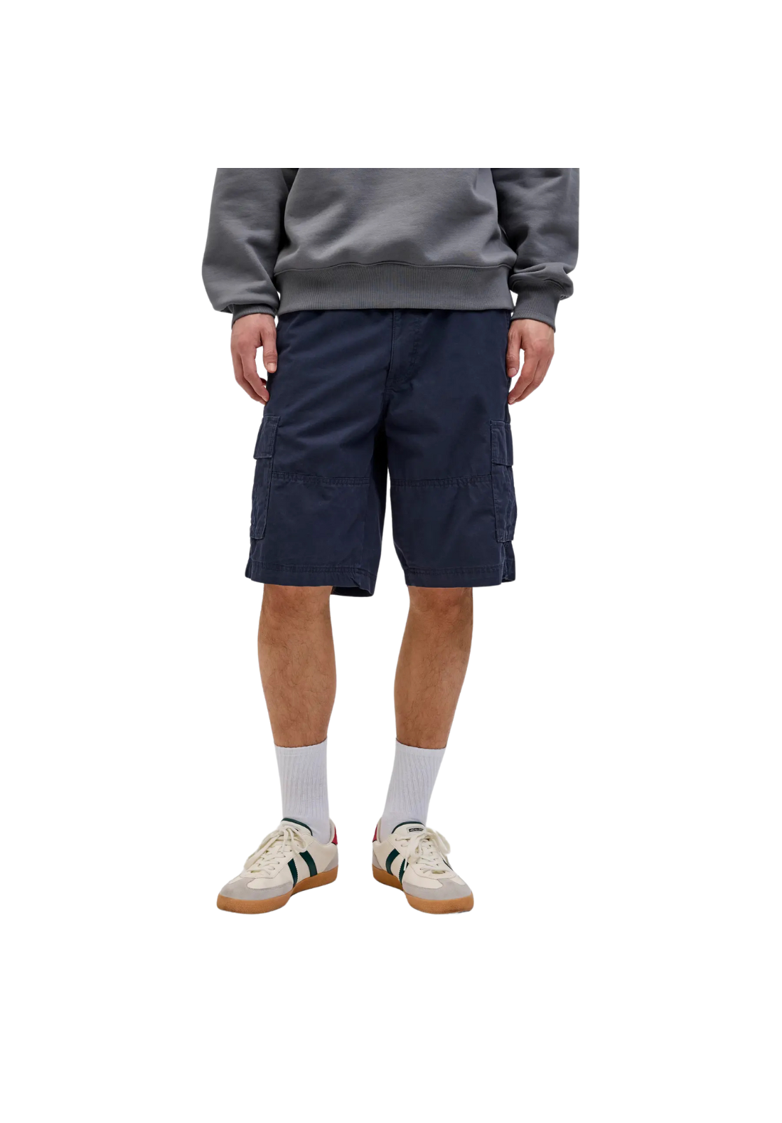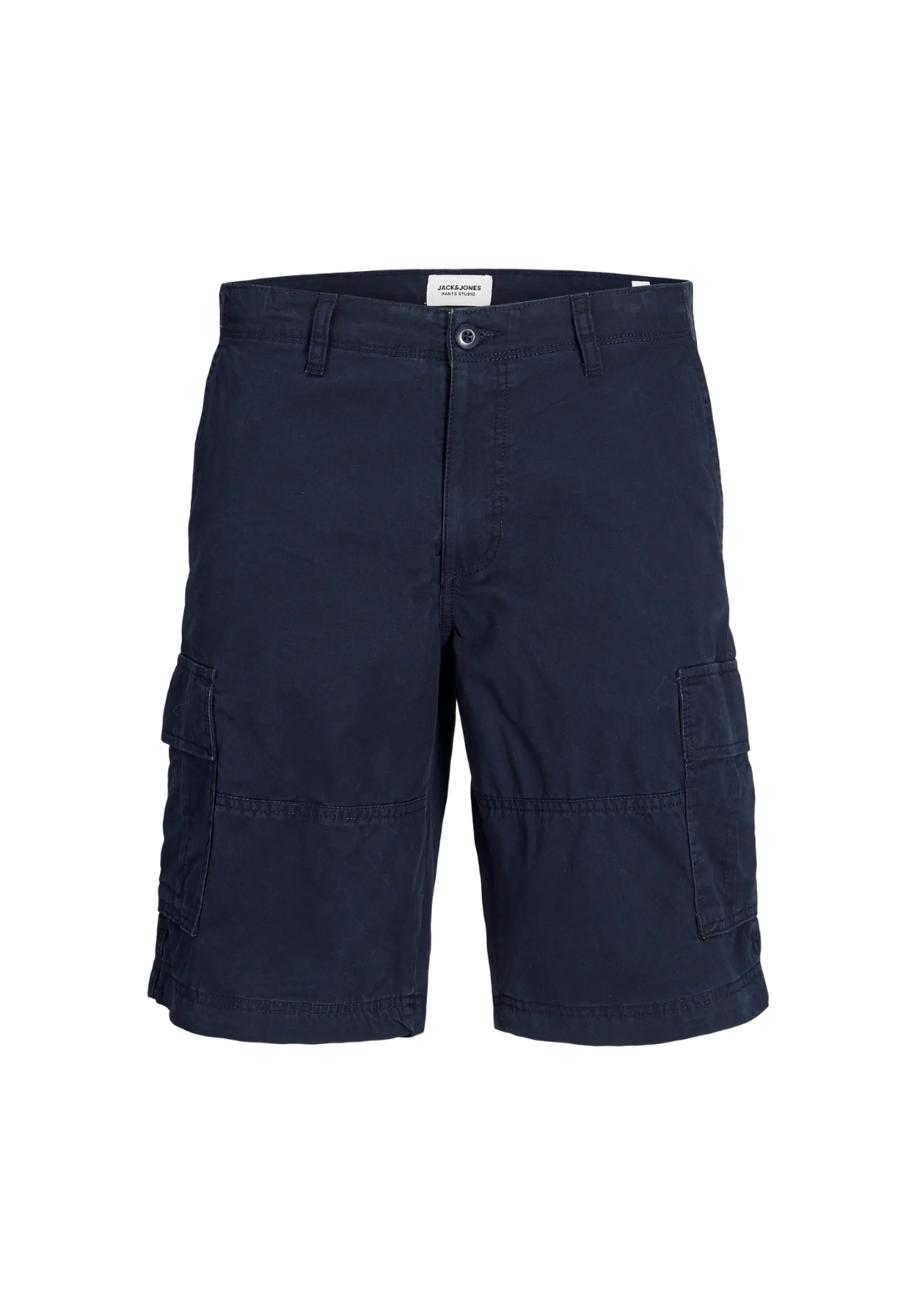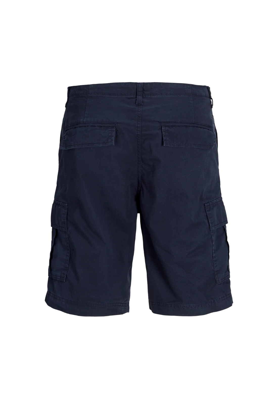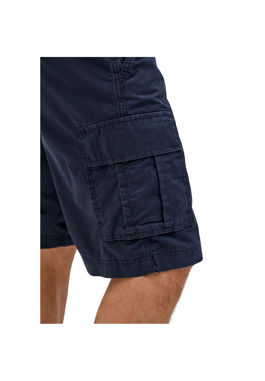 Pantalón corto estilo cargo con dos bolsillos laterales, dos bolsillos traseros y dos bolsillos con solapa en la parte externa de la pierna. El cierre es con cremallera y botón.