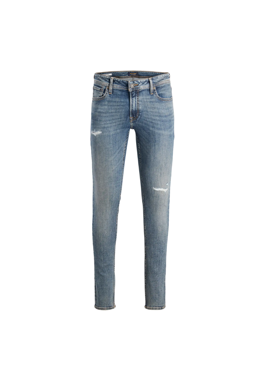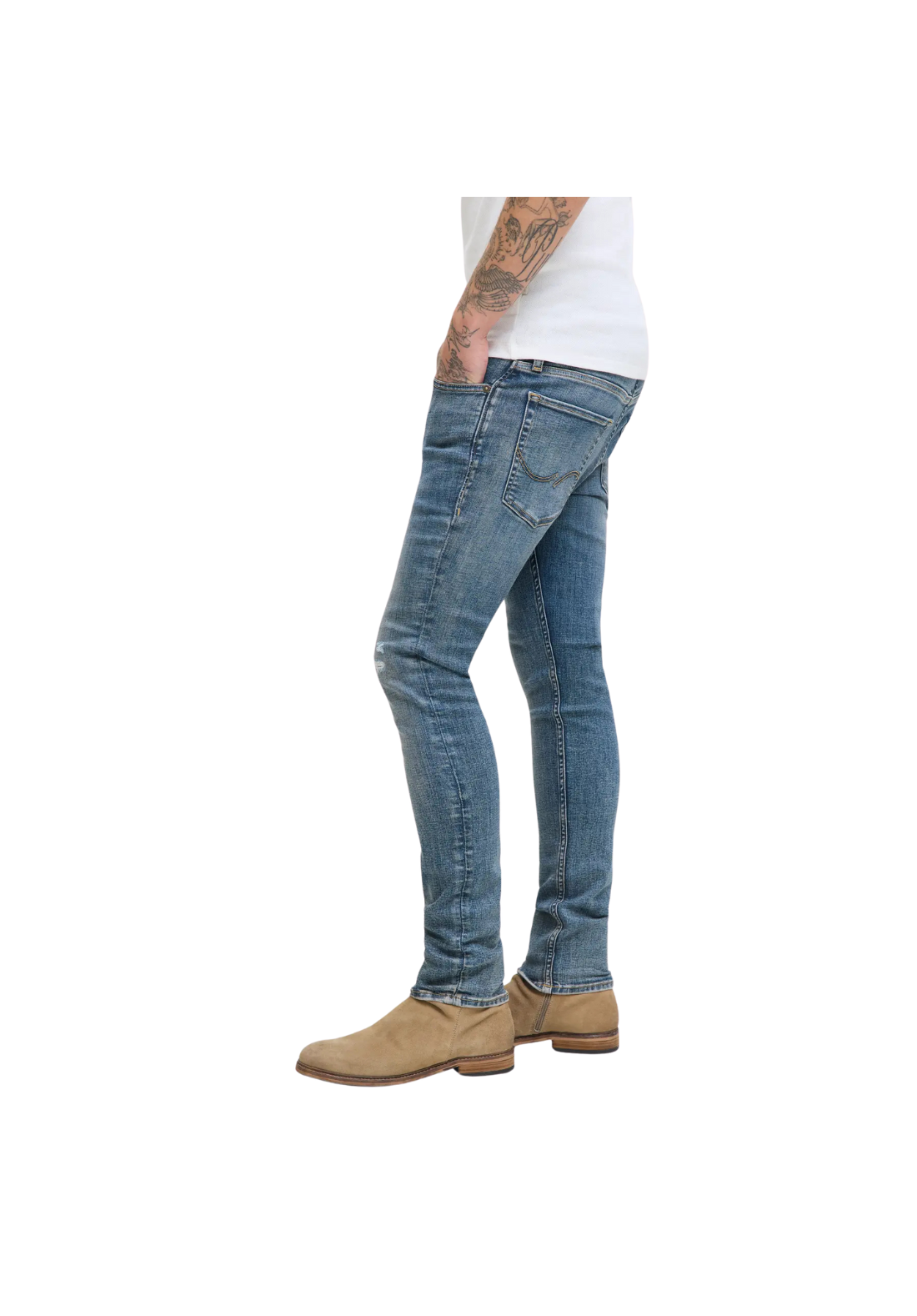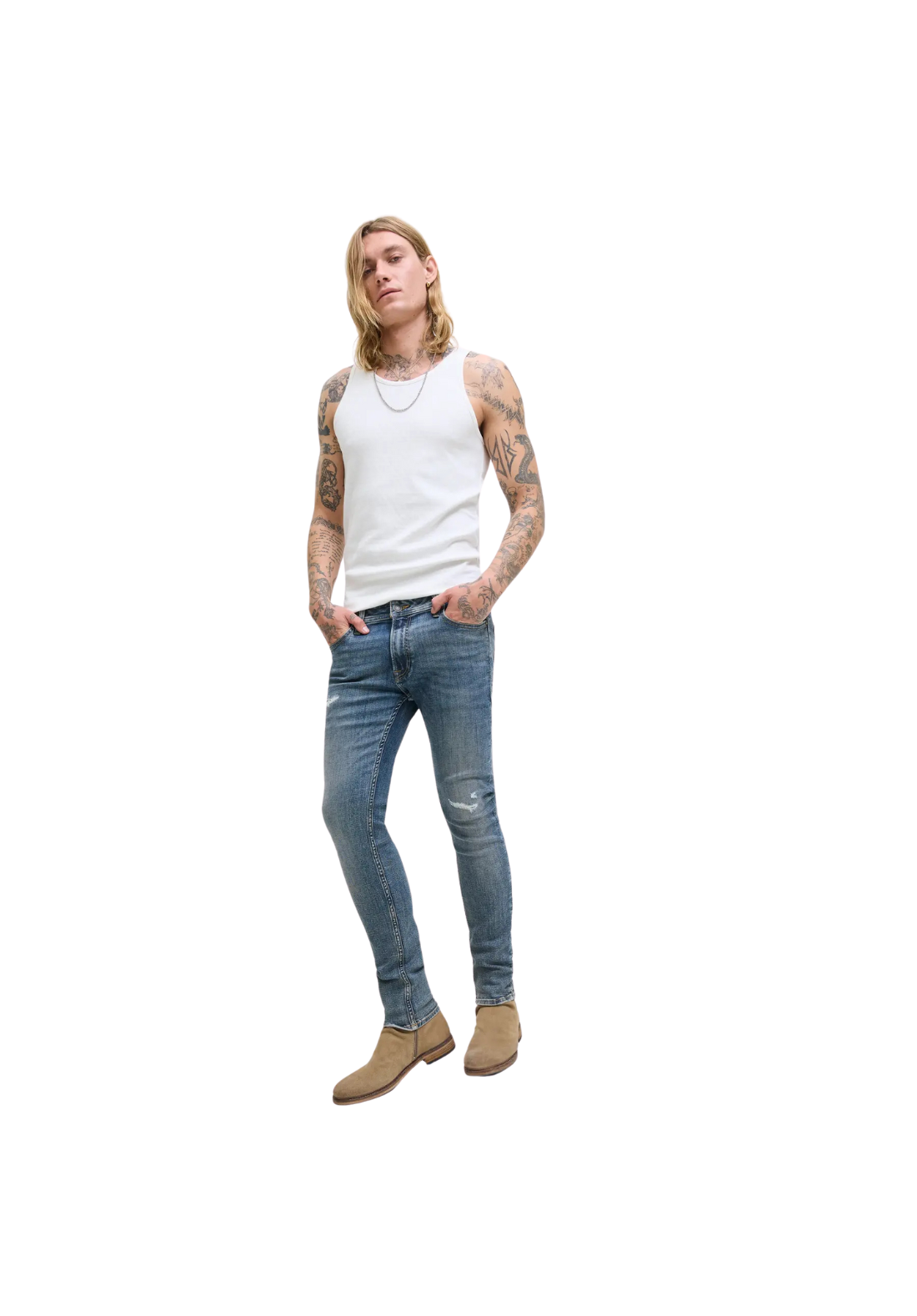 Vaqueros ajustados con cierre de botón y cremallera. Tiene 5 bolsillos y es de tiro bajo.