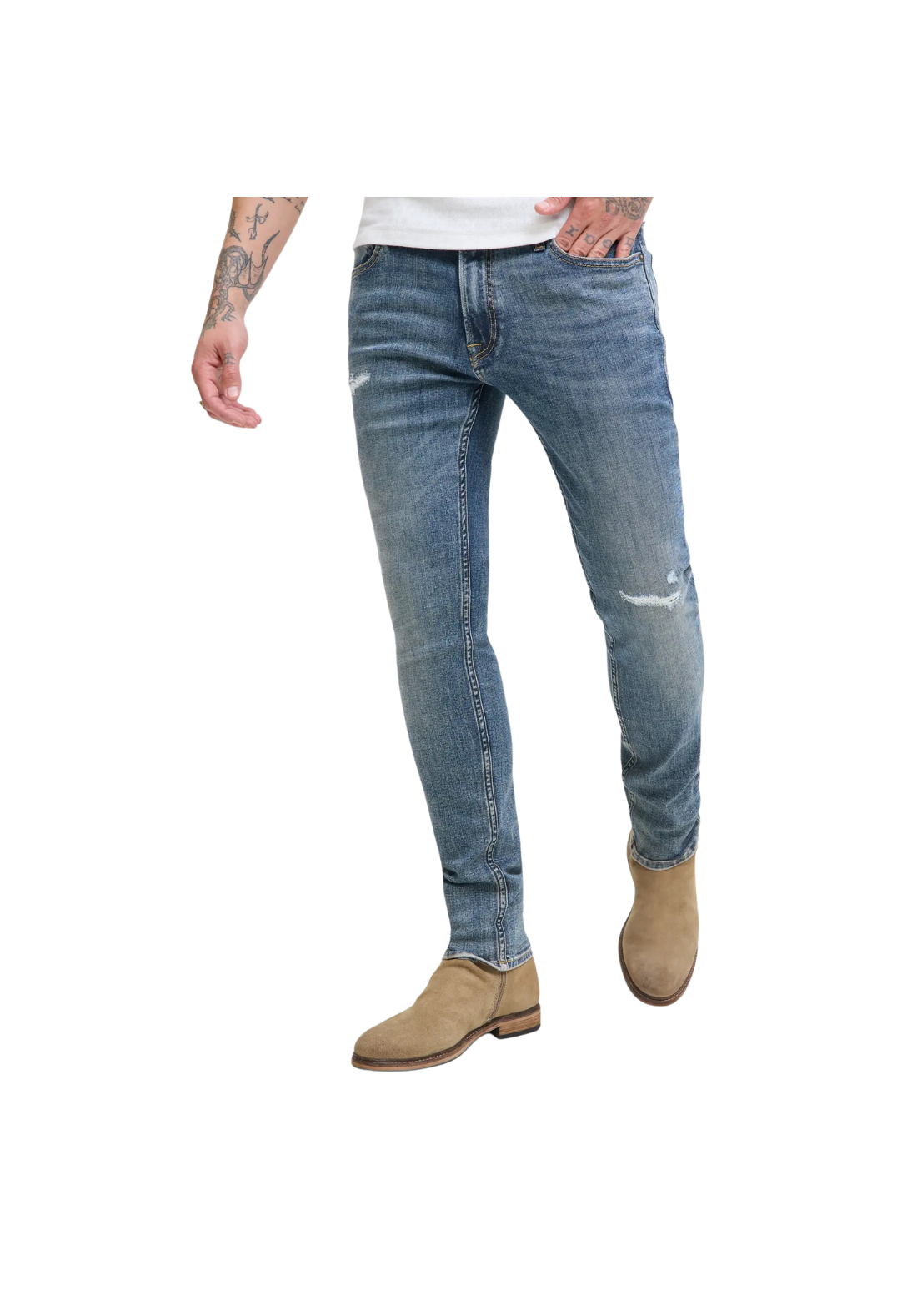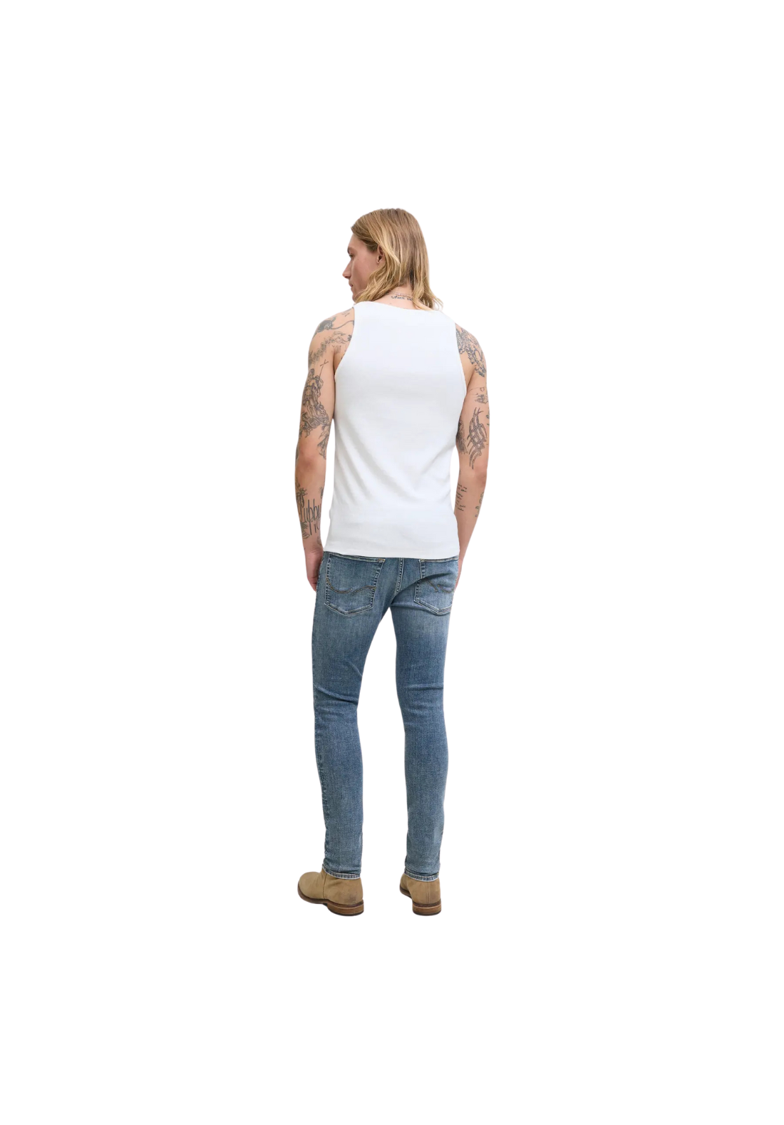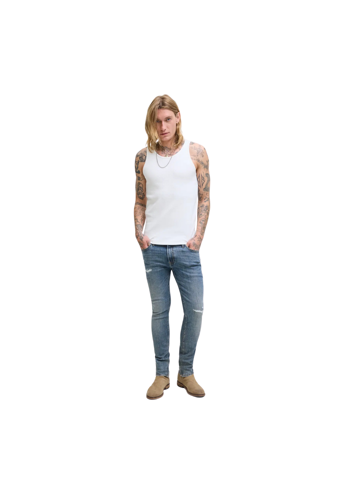 Vaqueros ajustados con cierre de botón y cremallera. Tiene 5 bolsillos y es de tiro bajo.