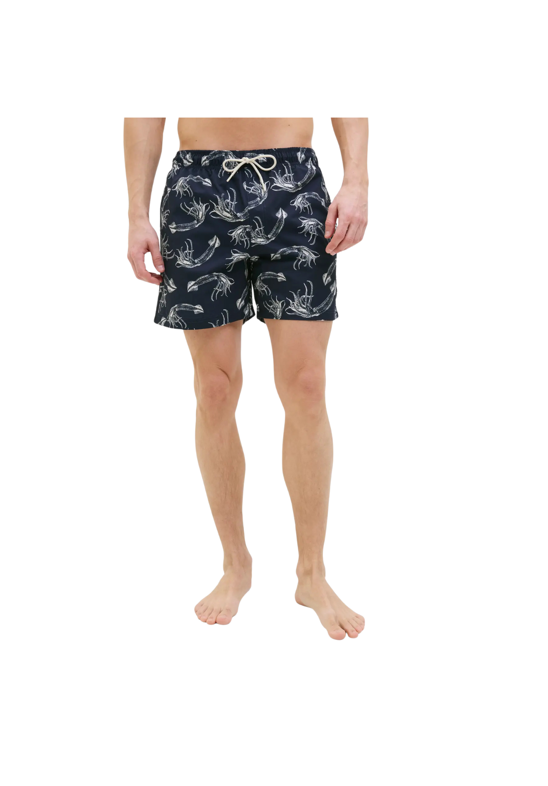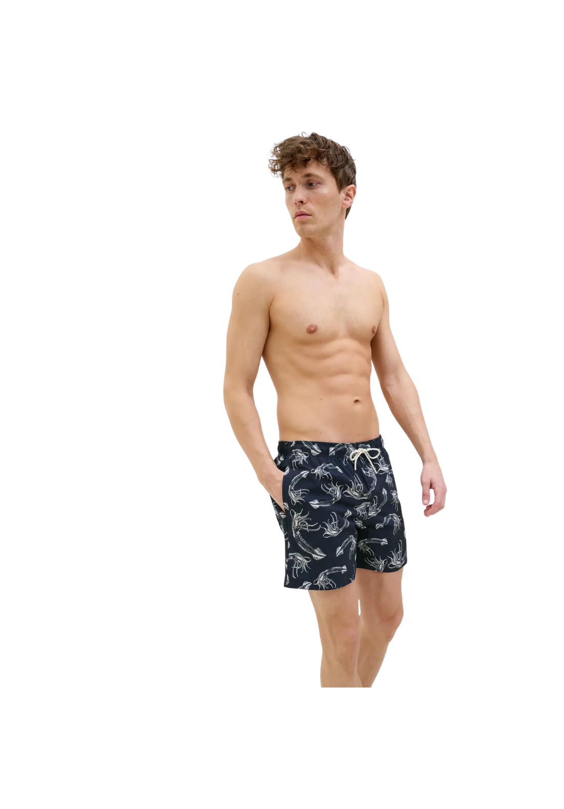 Bañador corto con dos bolsillos delanteros verticales y uno trasero horizontal. Es de talle medio y tiene cordón ajustable a la cintura. La cinturilla es elástica