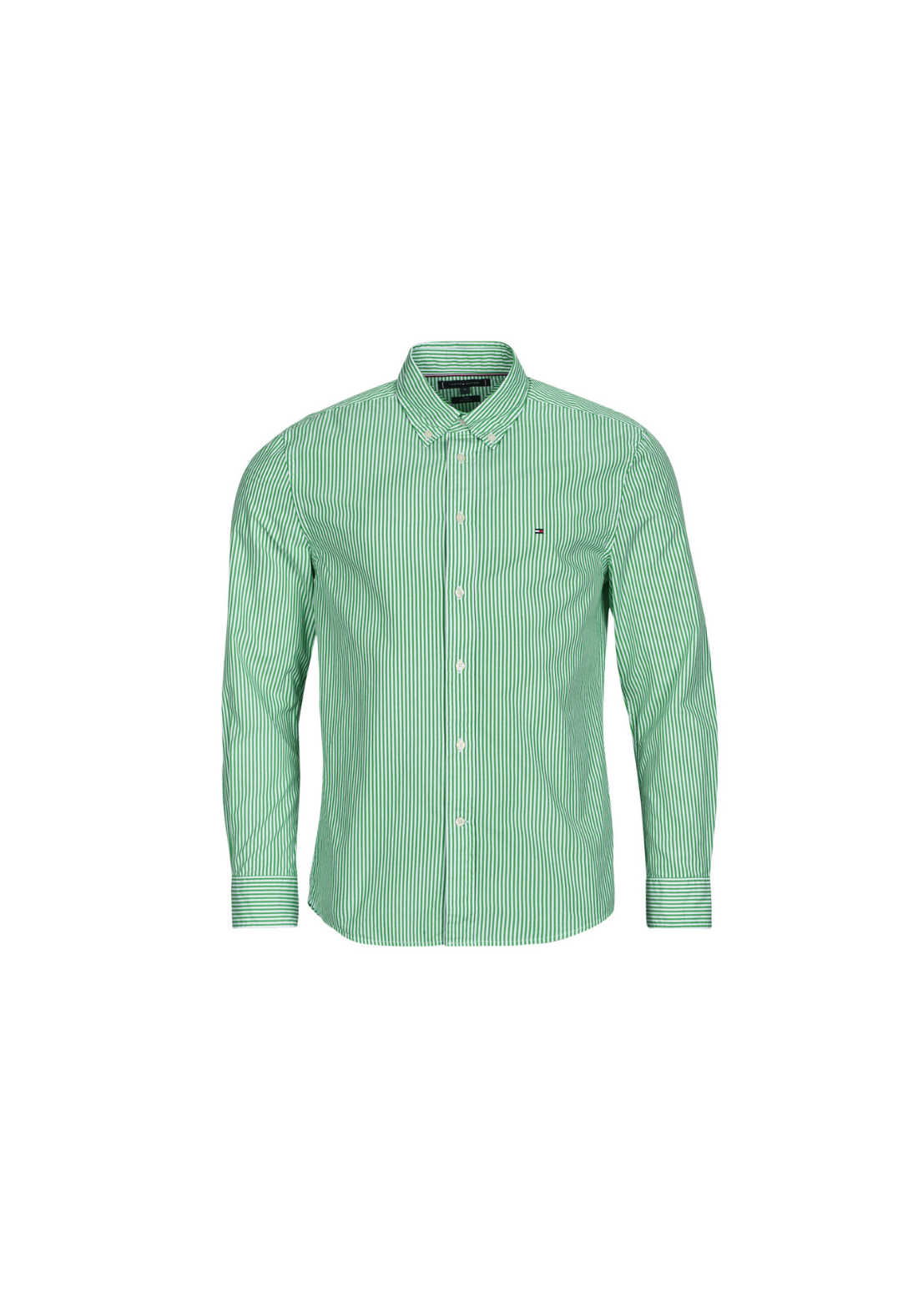 Camisa de cuello clásico con botones. Diseño integral de rayas verticales. Puños redondeados con dos botones.