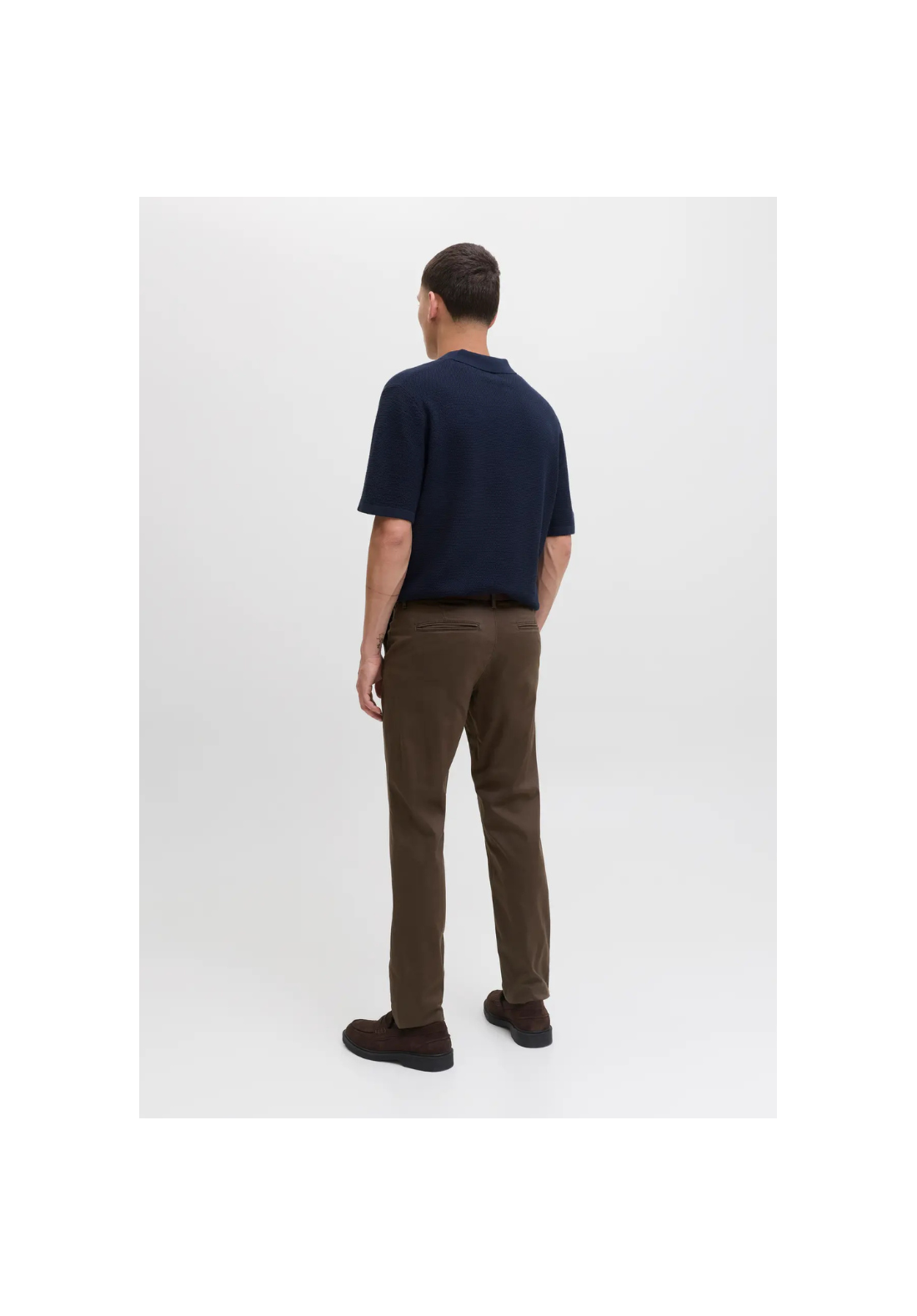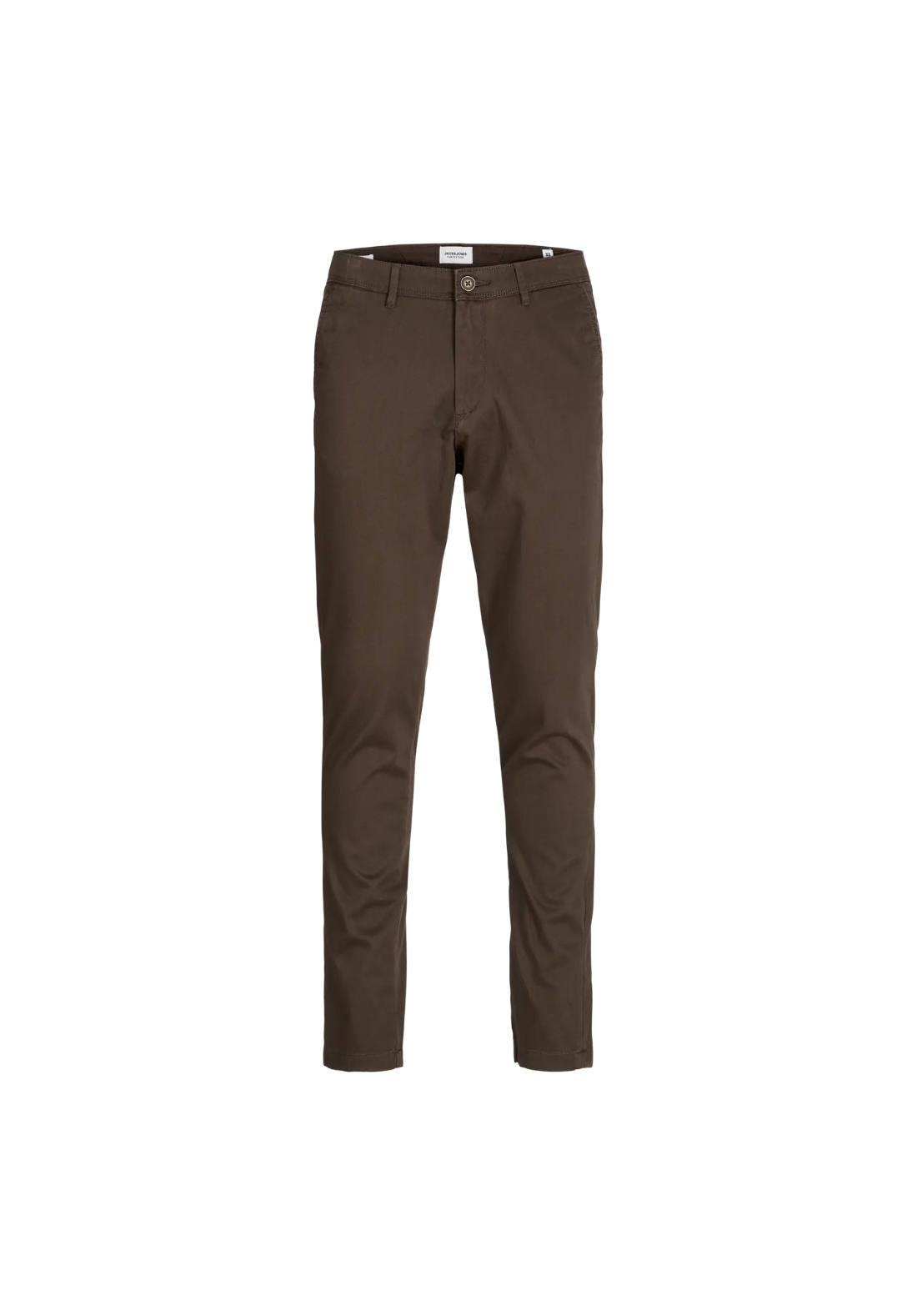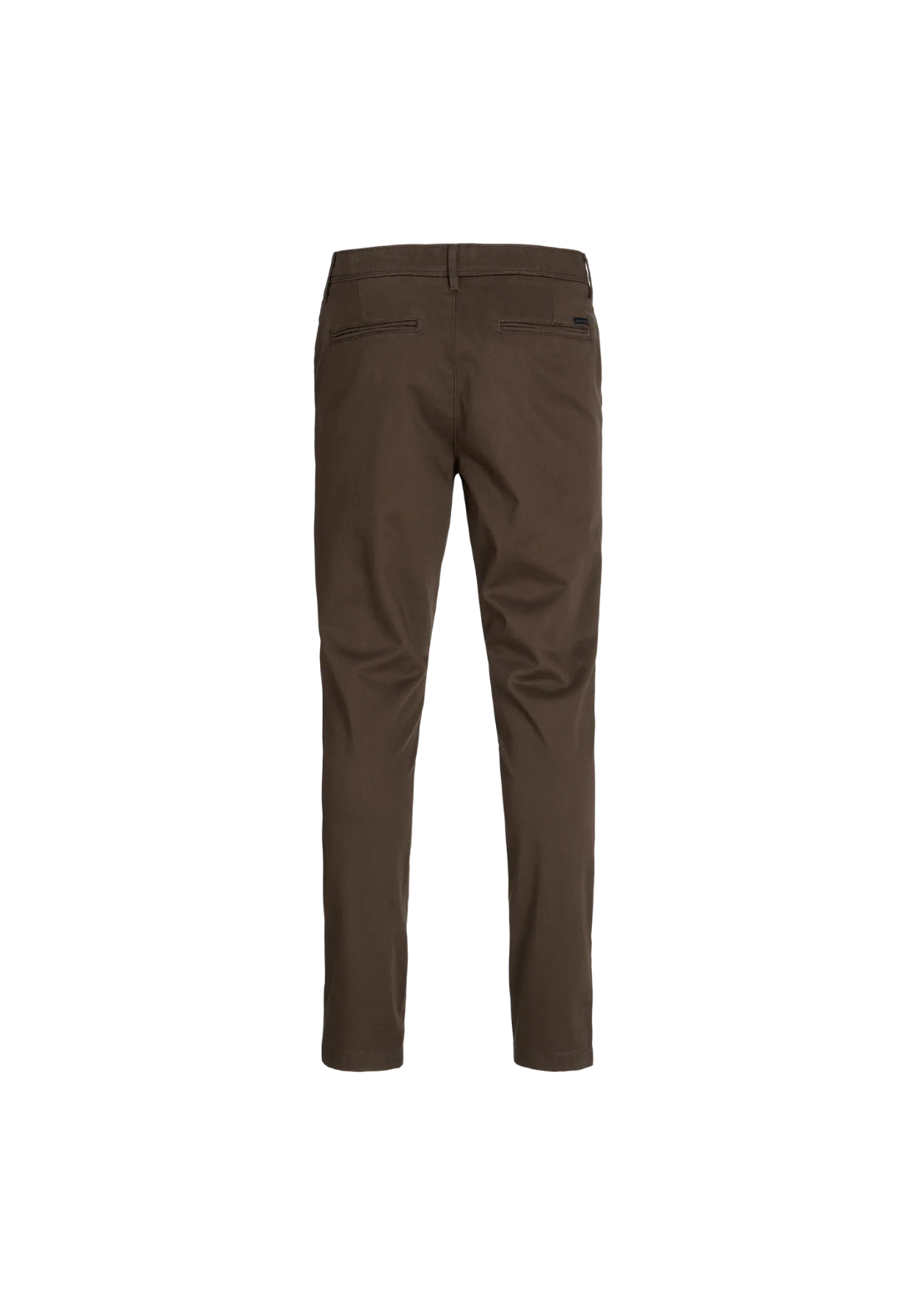 Pantalón chino con cierre de cremallera. Tiene bolsillos delanteros laterales y bolsillos traseros. Es de tiro bajo.