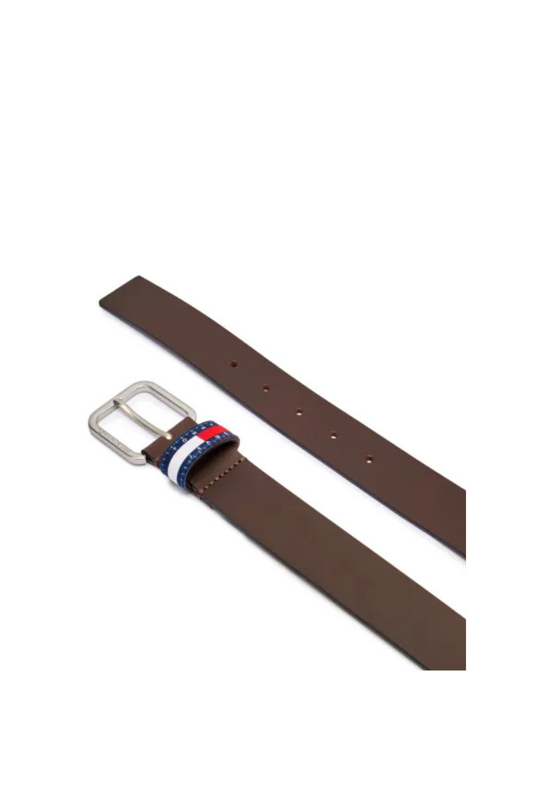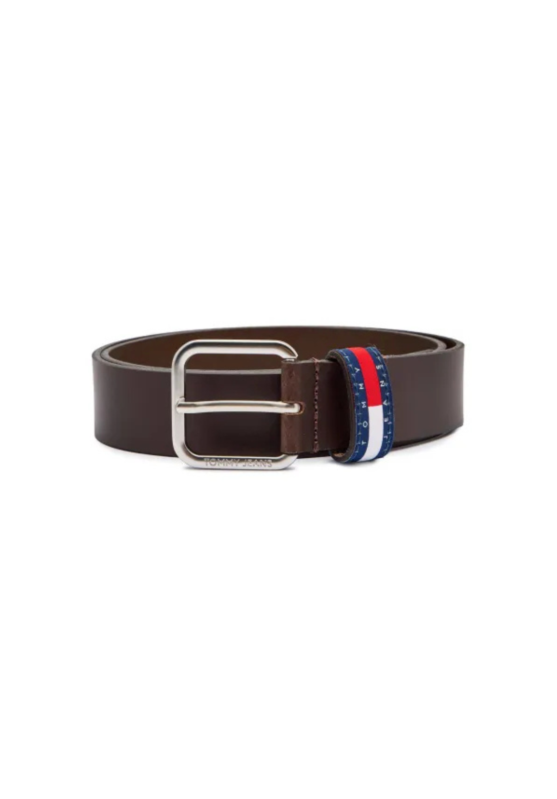Cinturón de piel con un llamativo logo en la trabilla como toque distintivo. La hebilla es metálica y cuadrada.