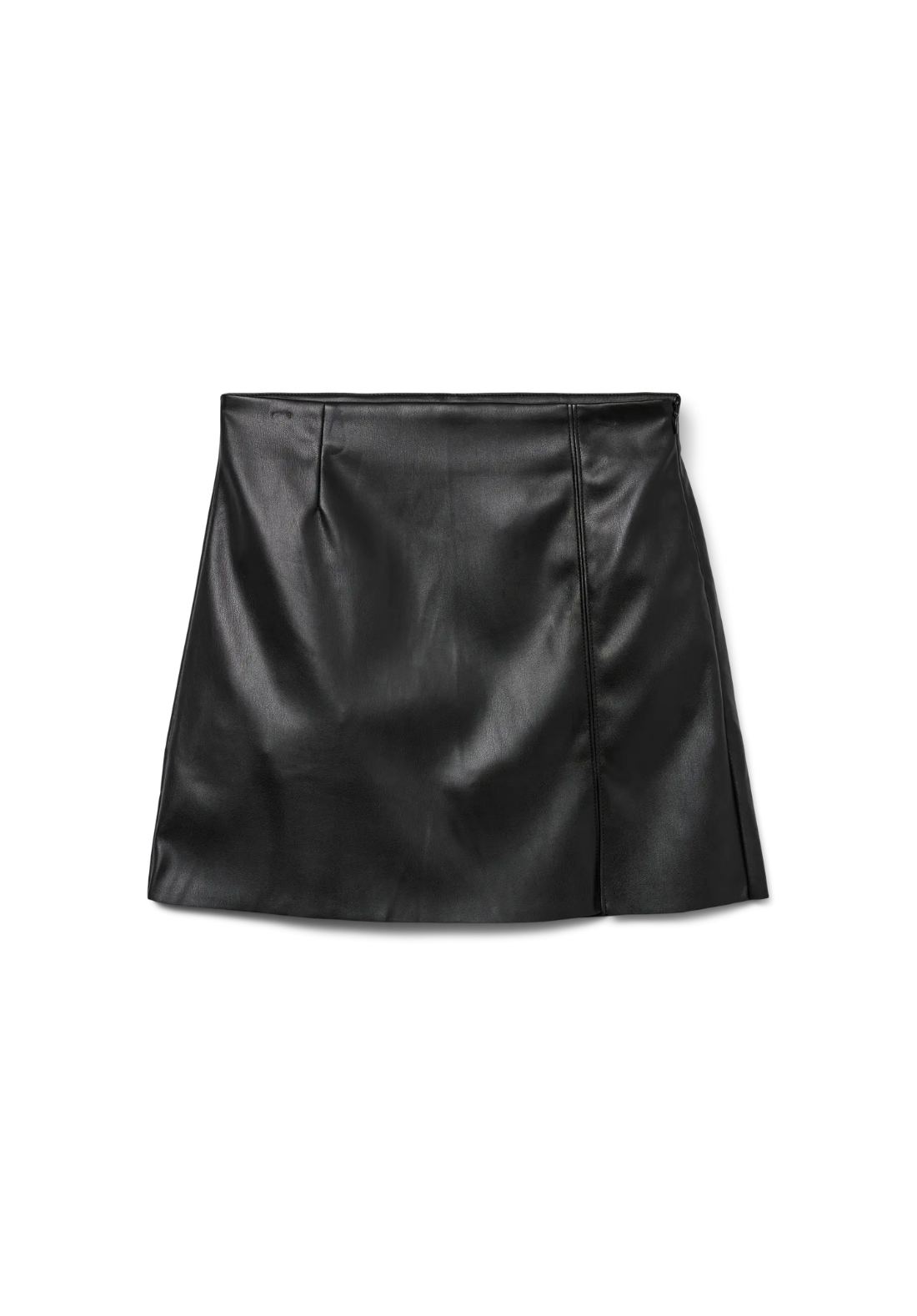 Falda corta, de talle alto, con cremallera lateral oculta. Tiene abertura lateral en la pierna izquierda.