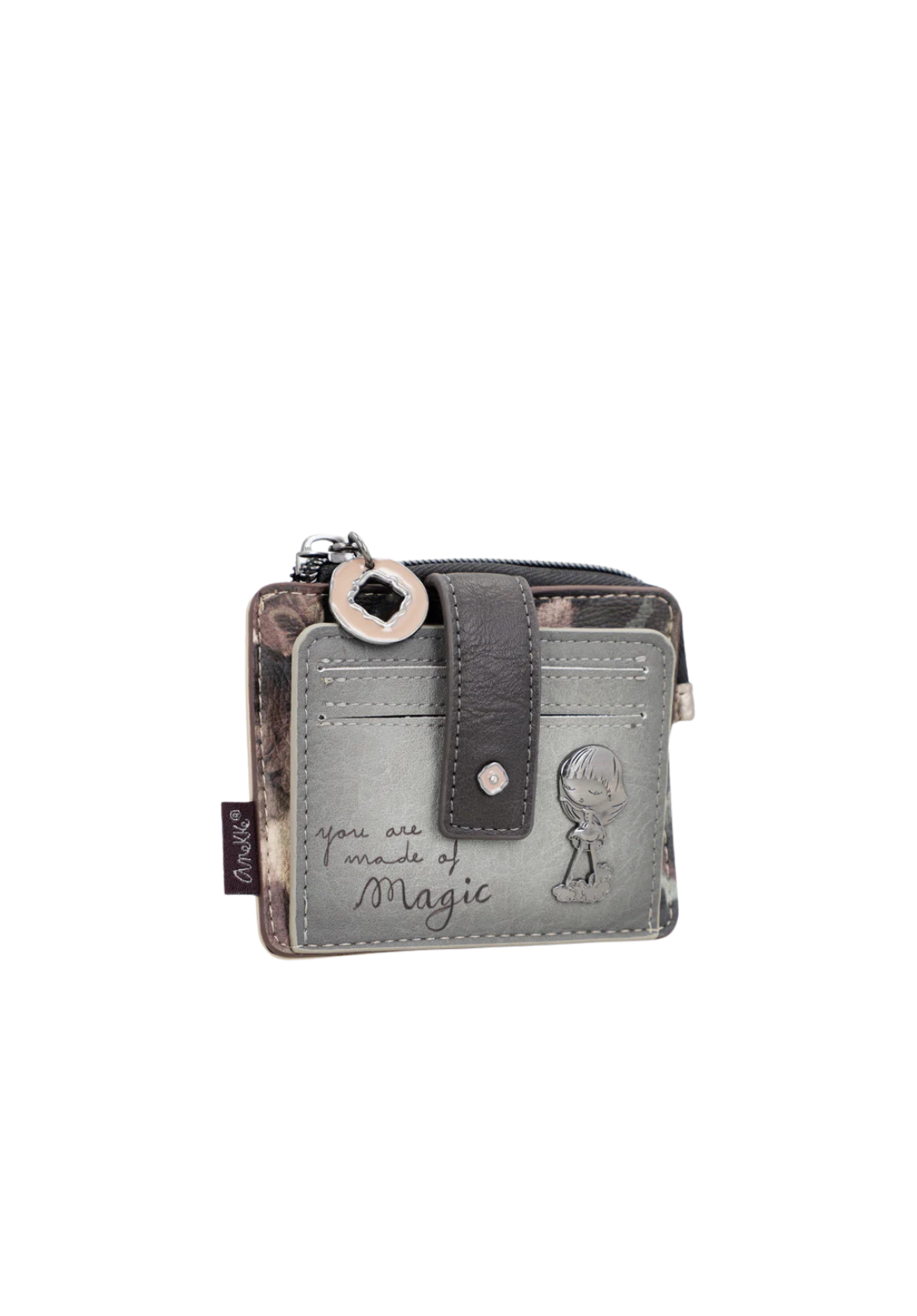 Tarjetero con cierre de solapa y múltiples bolsillos interiores.