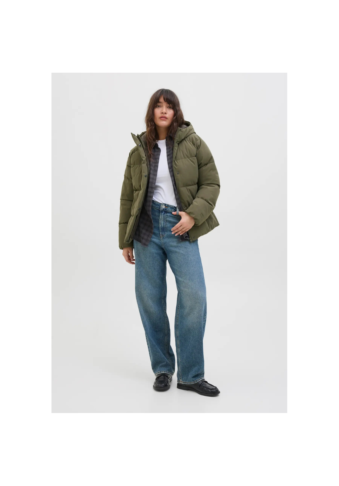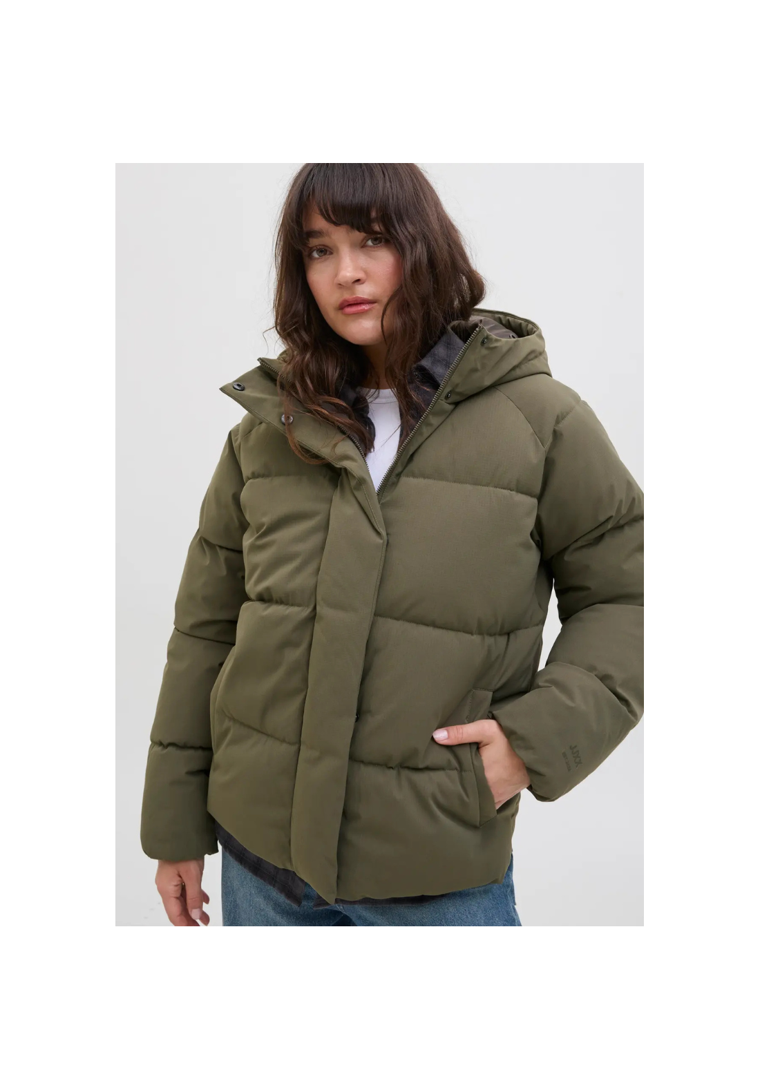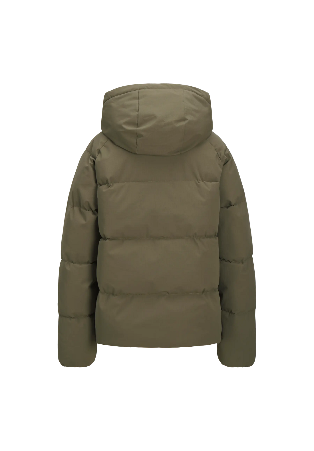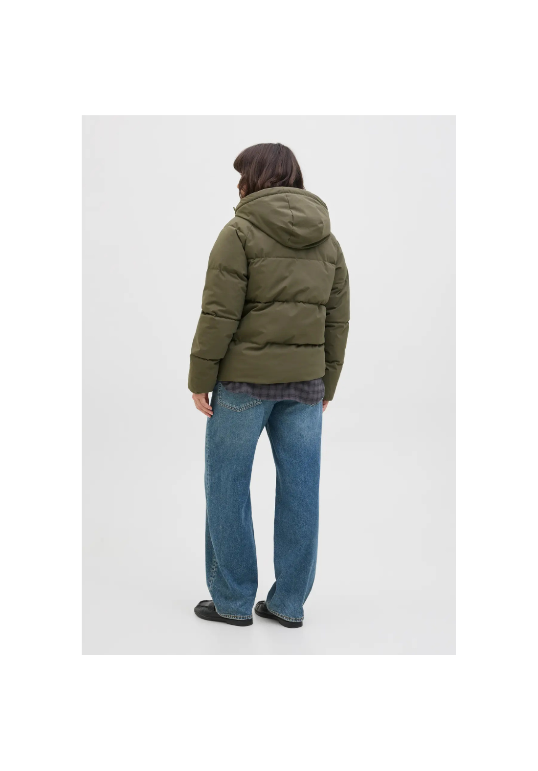 Chaqueta corta acolchada, con capucha con cordón ajustable. Cierre de botones a presión y cremallera.
