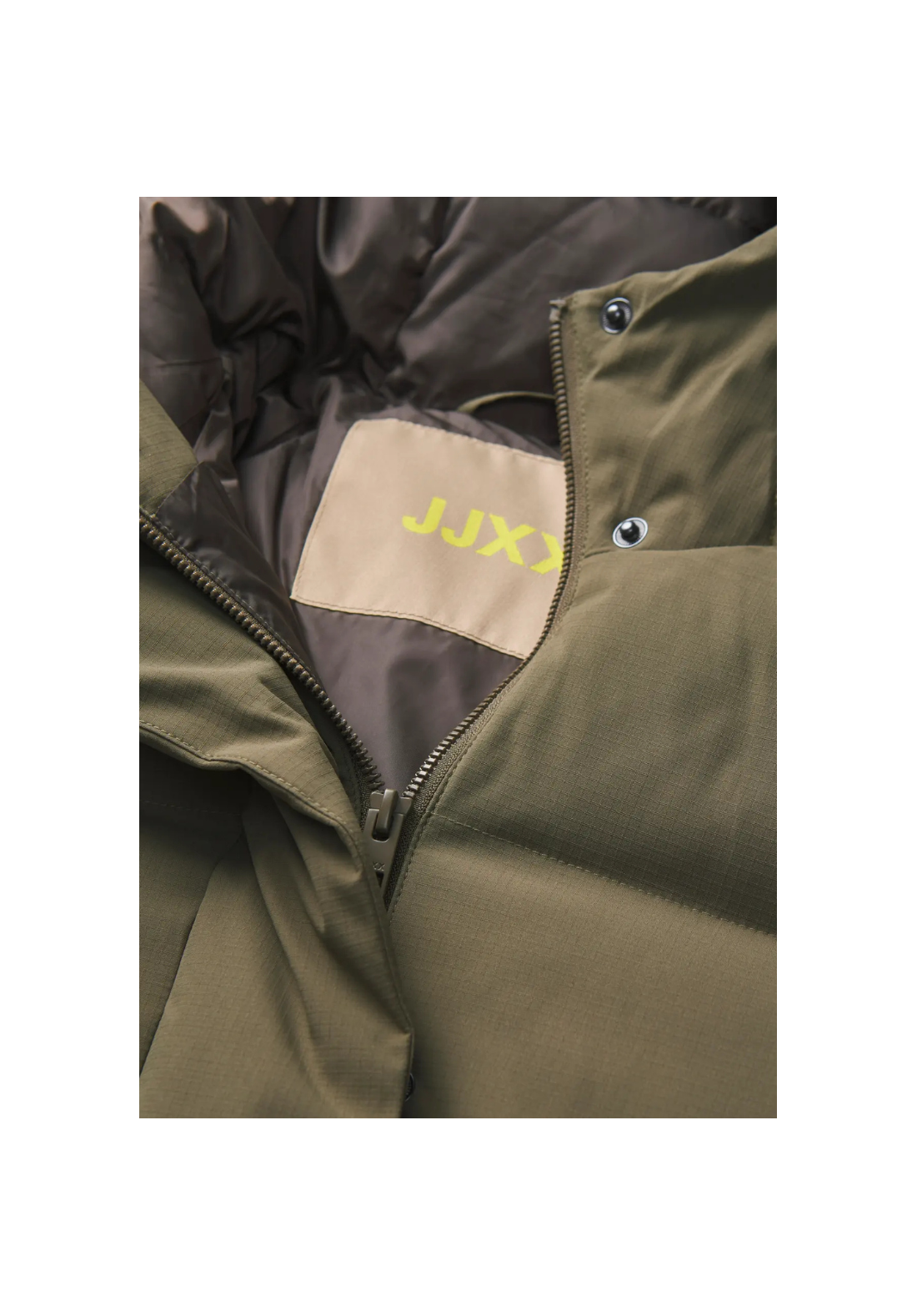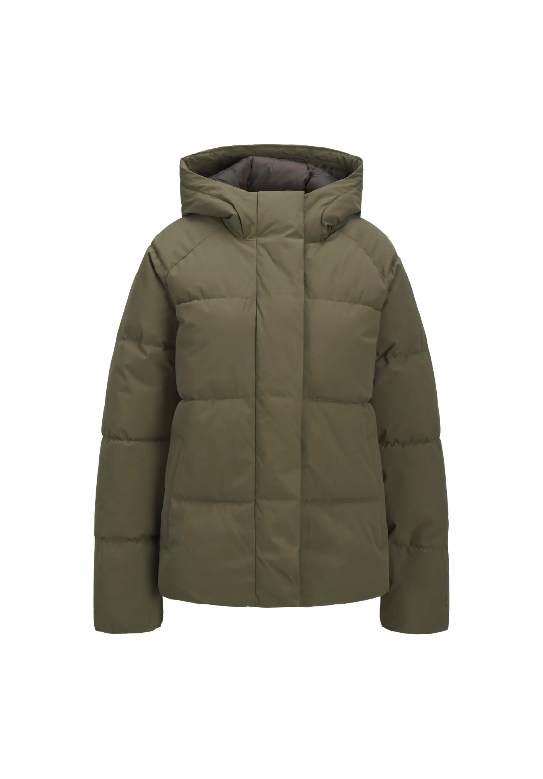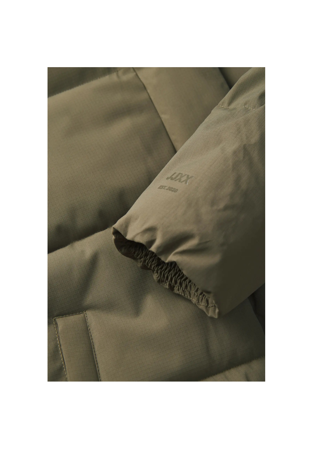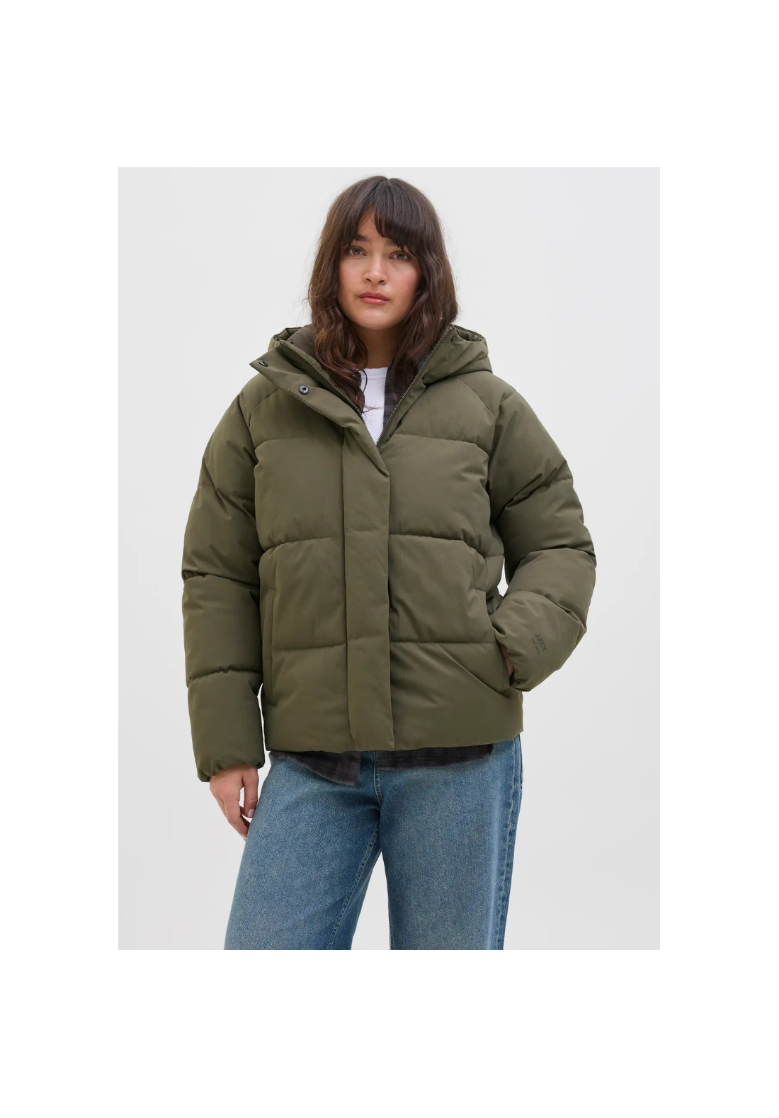 Chaqueta corta acolchada, con capucha con cordón ajustable. Cierre de botones a presión y cremallera.
