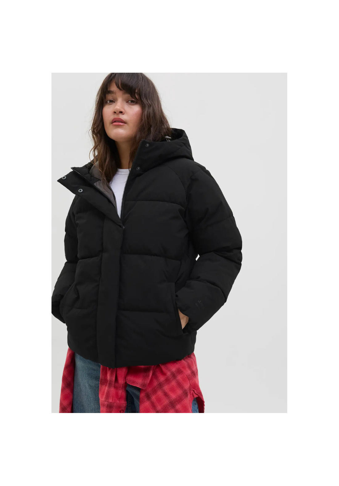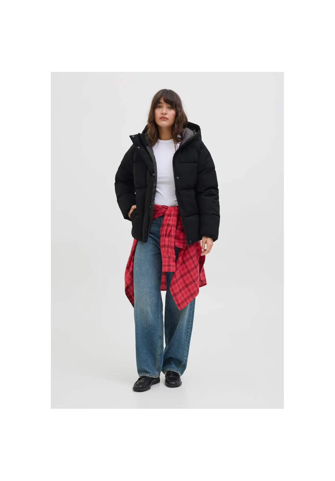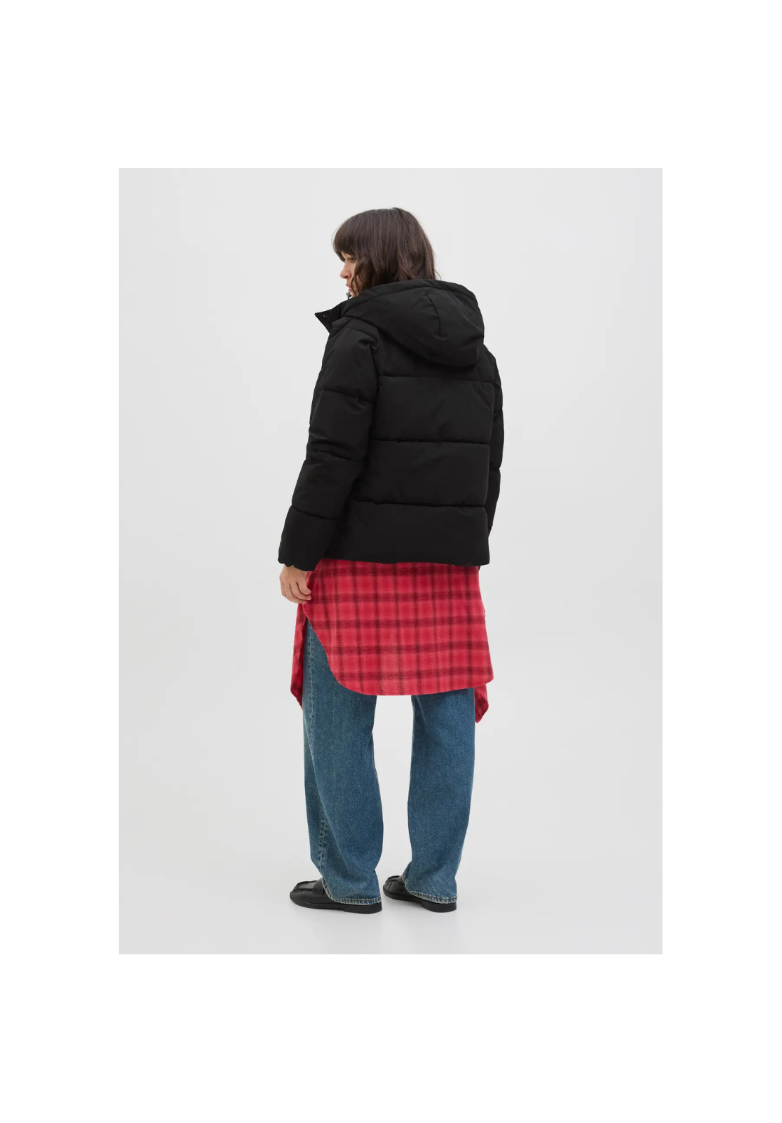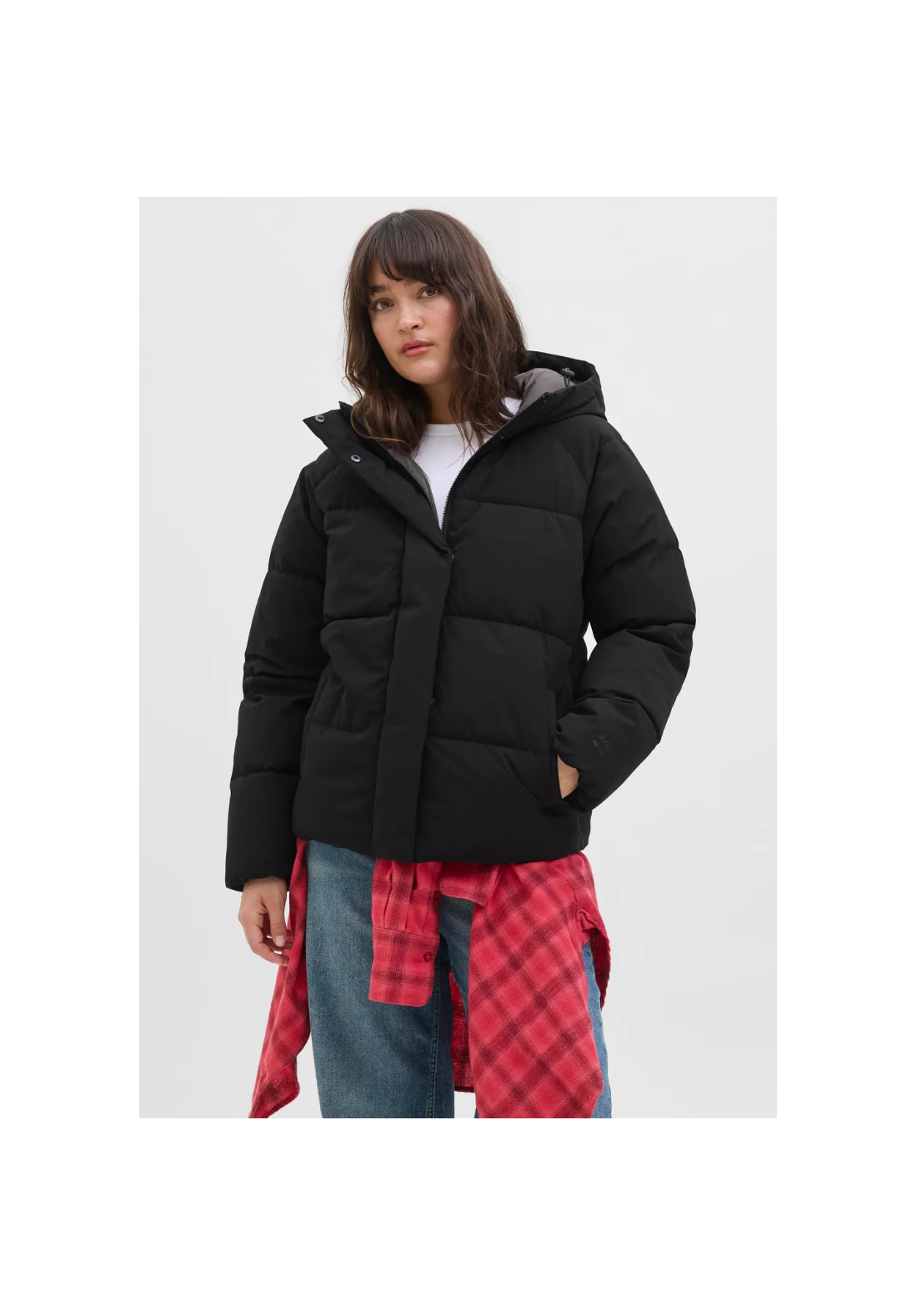Chaqueta corta acolchada, con capucha con cordón ajustable. Cierre de botones a presión y cremallera.