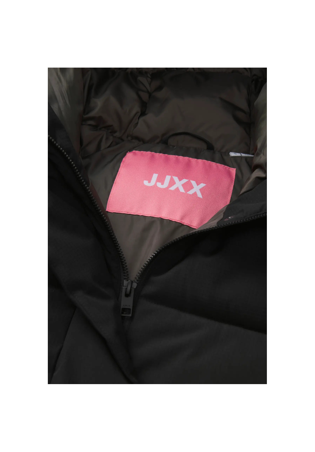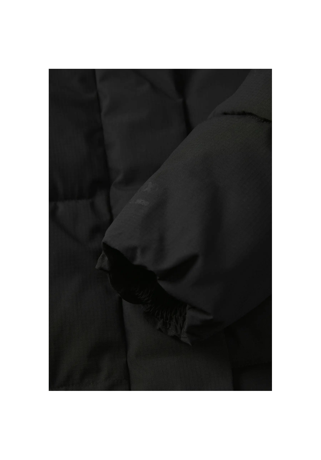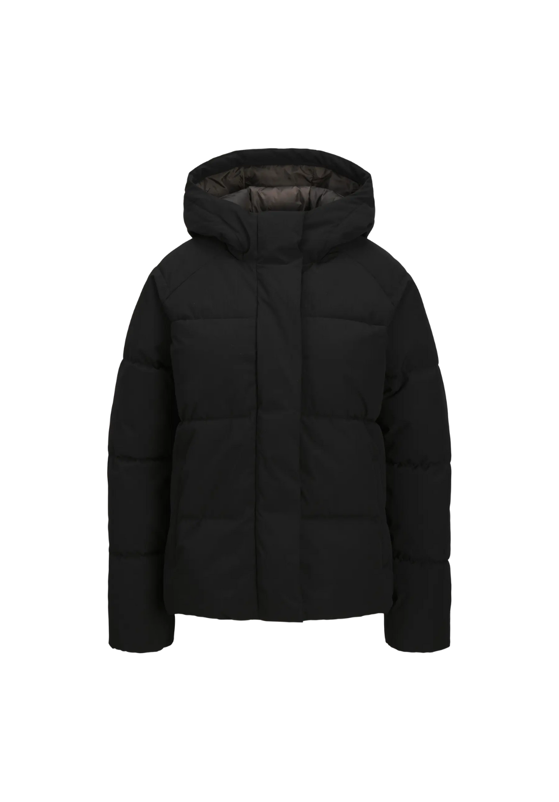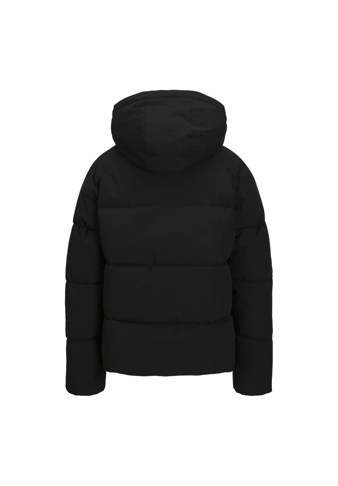 Chaqueta corta acolchada, con capucha con cordón ajustable. Cierre de botones a presión y cremallera.