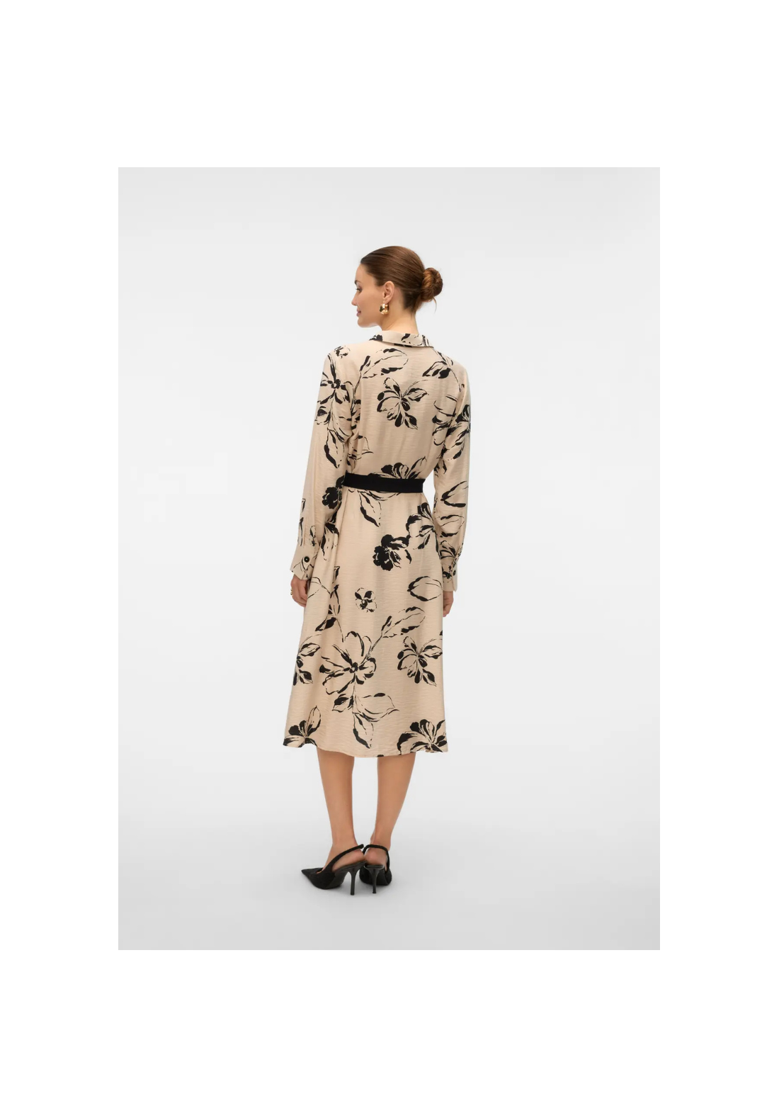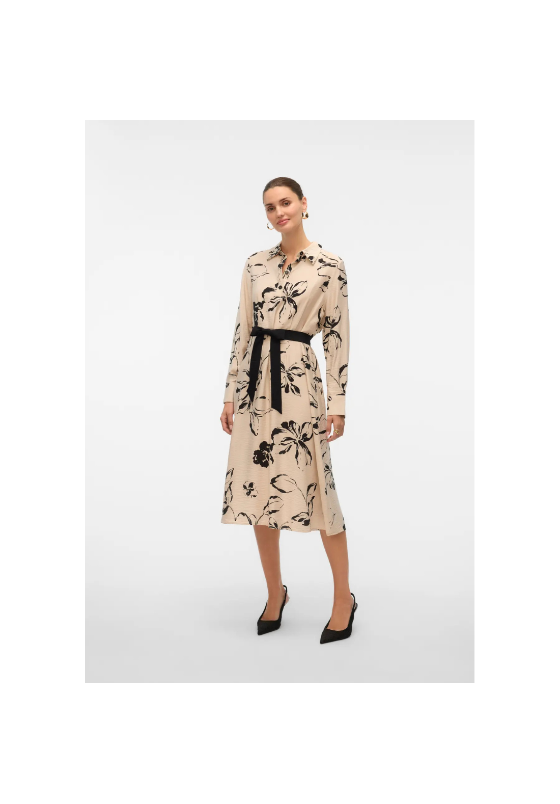 Vestido camisero, de manga larga, con cuello camisero y puños abotonados. Cierre con un cuarto de botón y cinturón en la cintura. El largo es midi.
