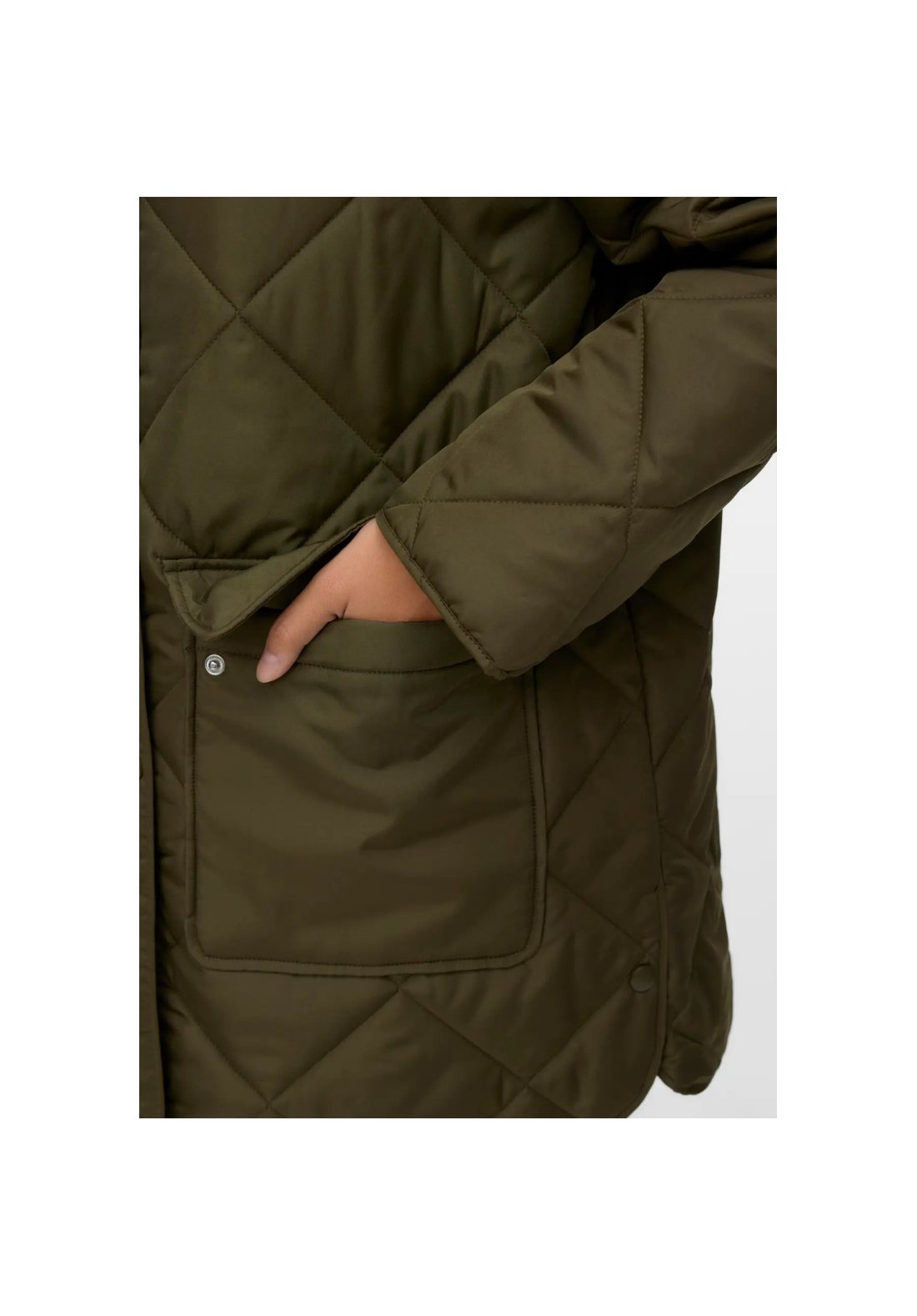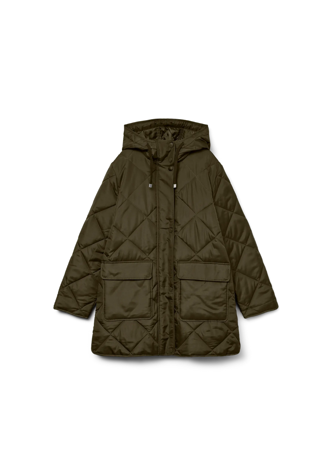 Abrigo con capucha, cierre de botones a presión y bolsillos delanteros. Tiene un cordón ajustable en la capucha.