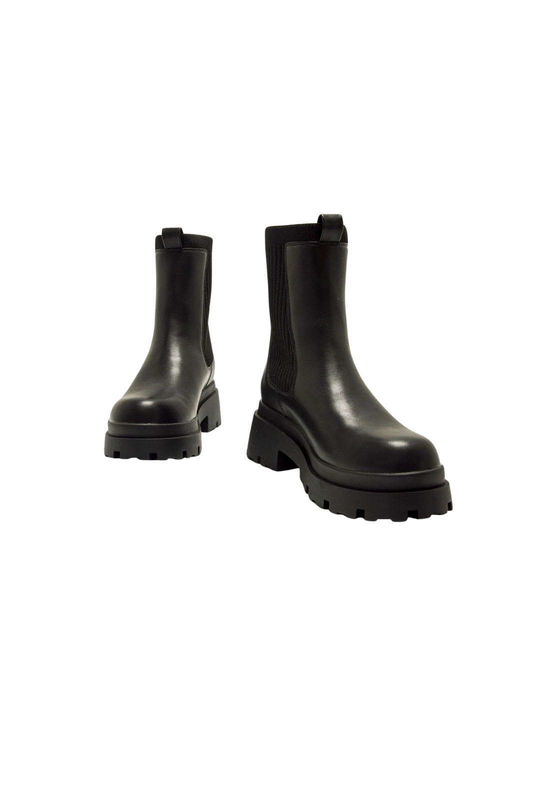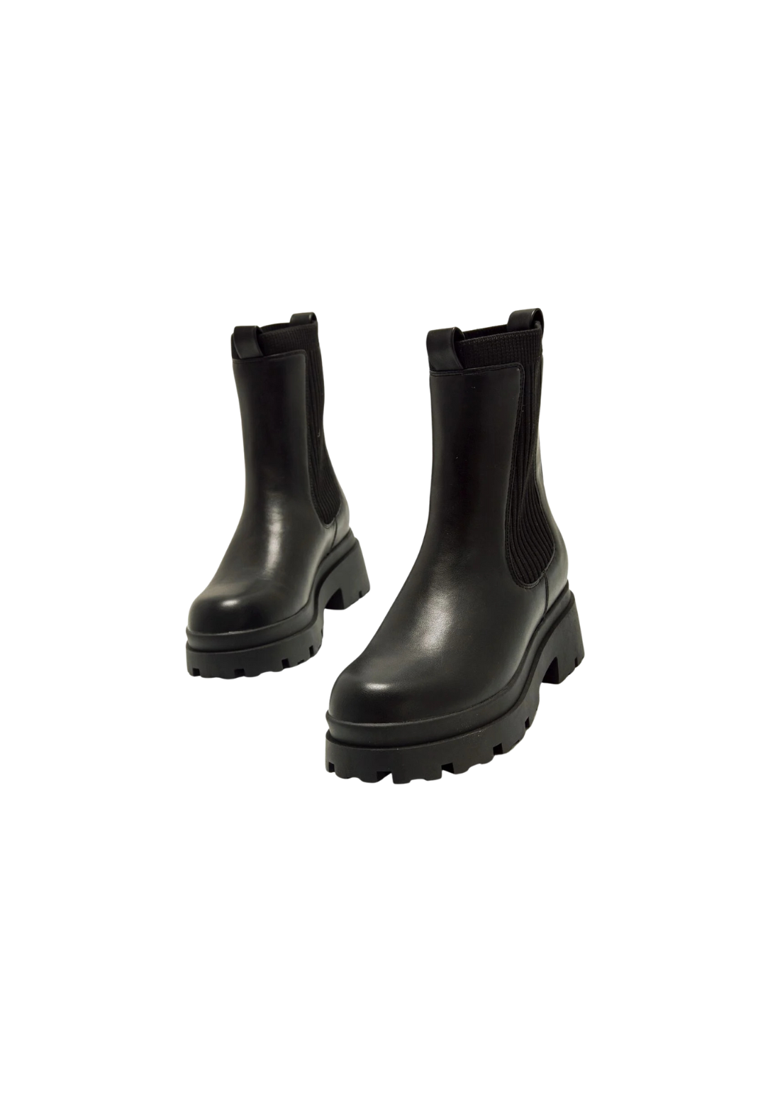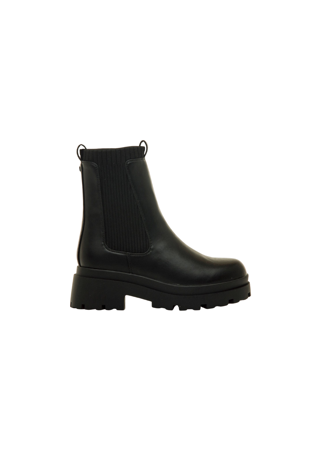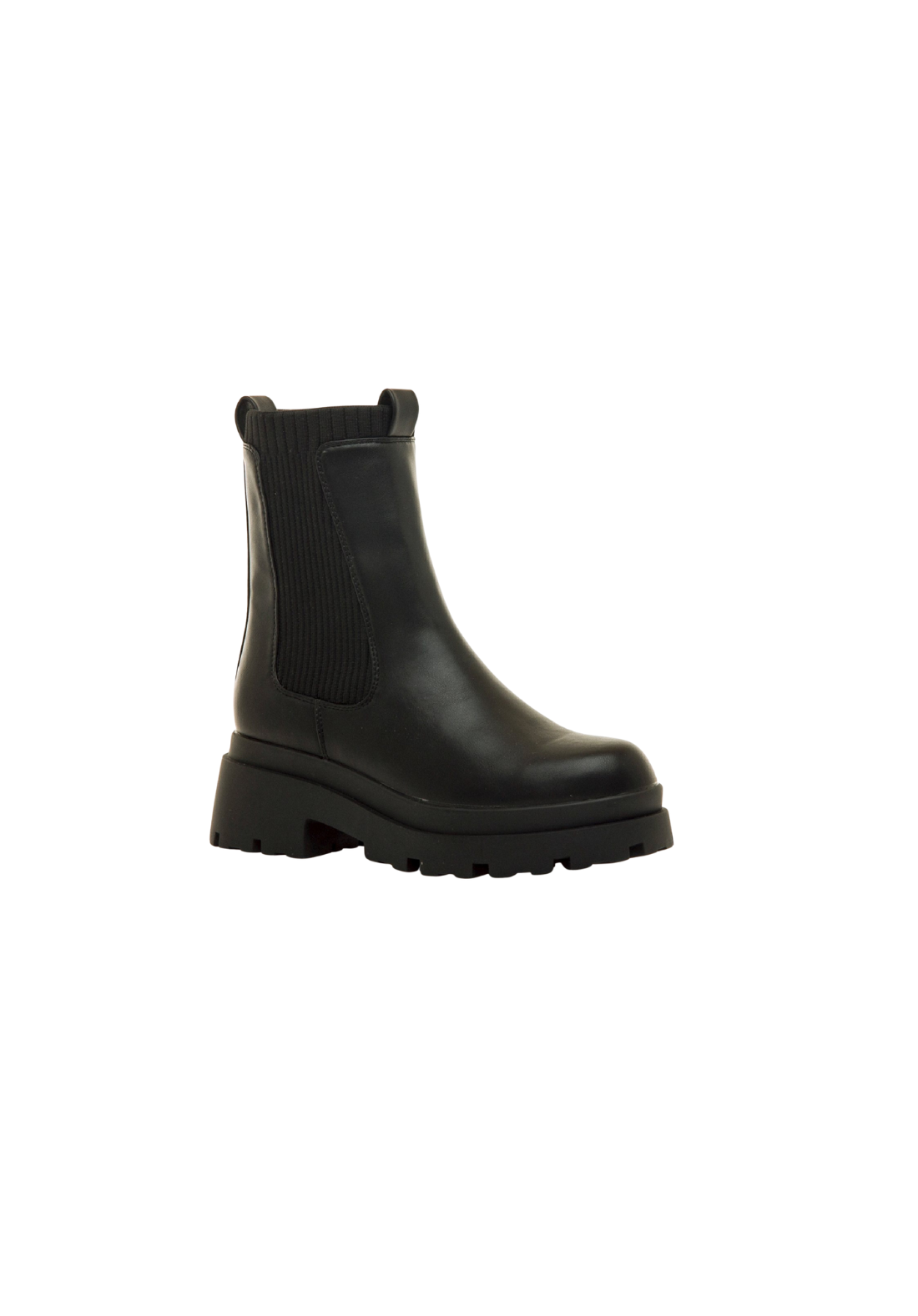 Bota plana. de caña media, con un poco de plataforma, de punta redonda. La suela es de goma.