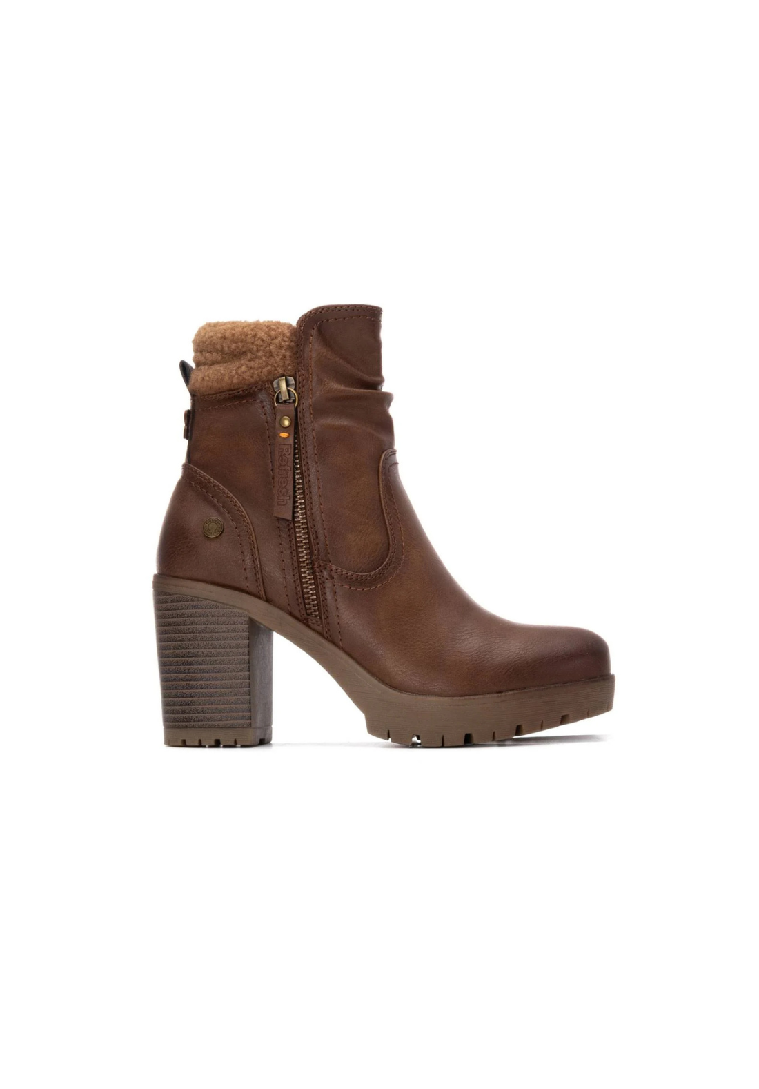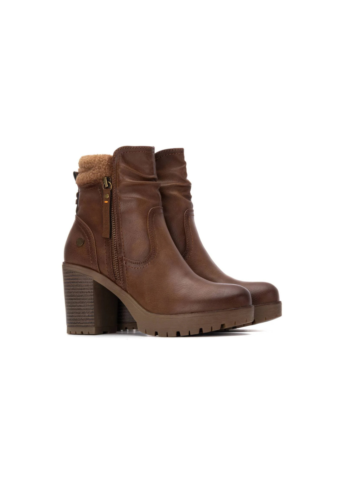 Botín fabricado en material que imita a la piel con acabado cepillado. Cremallera lateral decorativa. Cierre mediante cremallera interior. Tacón de 9 cm con suela de goma. Plantilla extraíble. Este modelo ha obtenido el certificado vegano por la organización mundial PETA (Organización de los derechos de los animales).