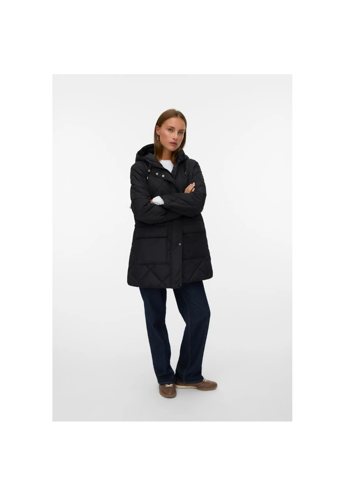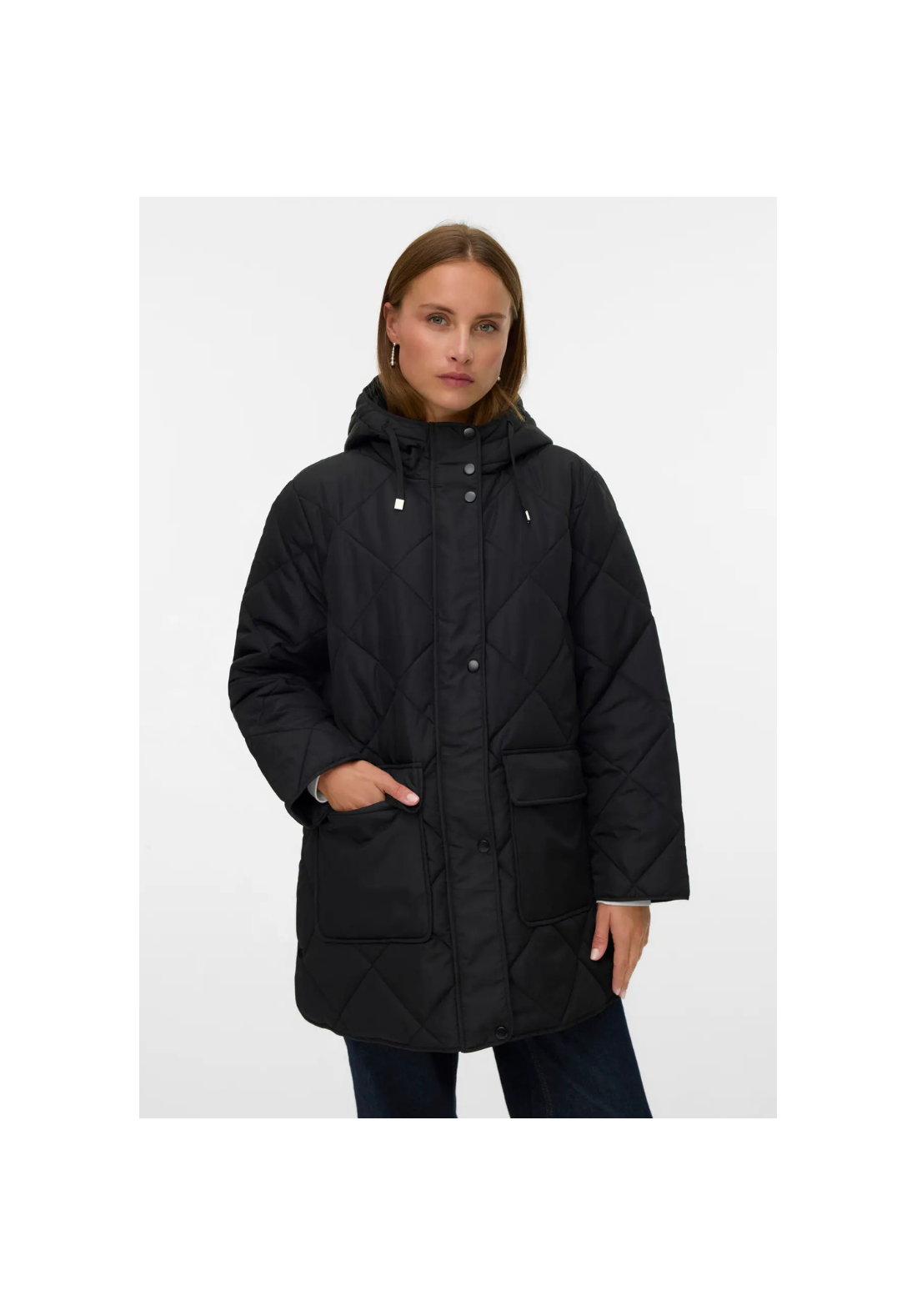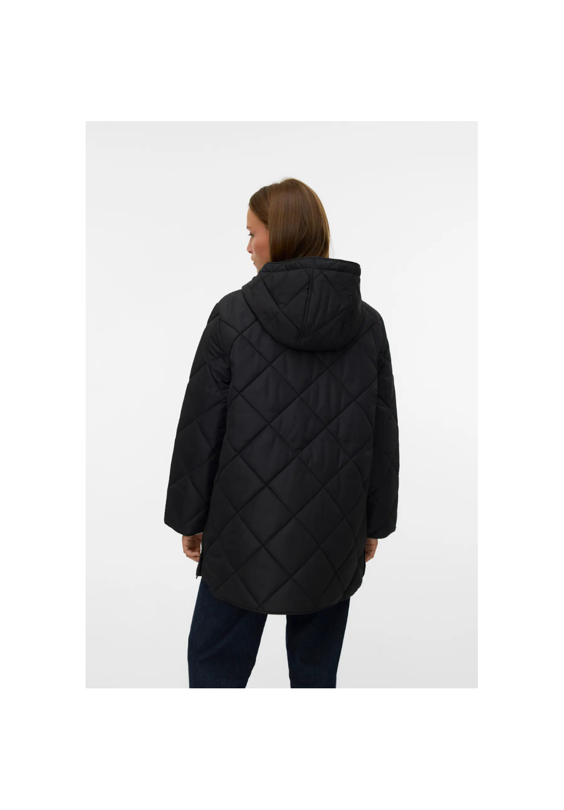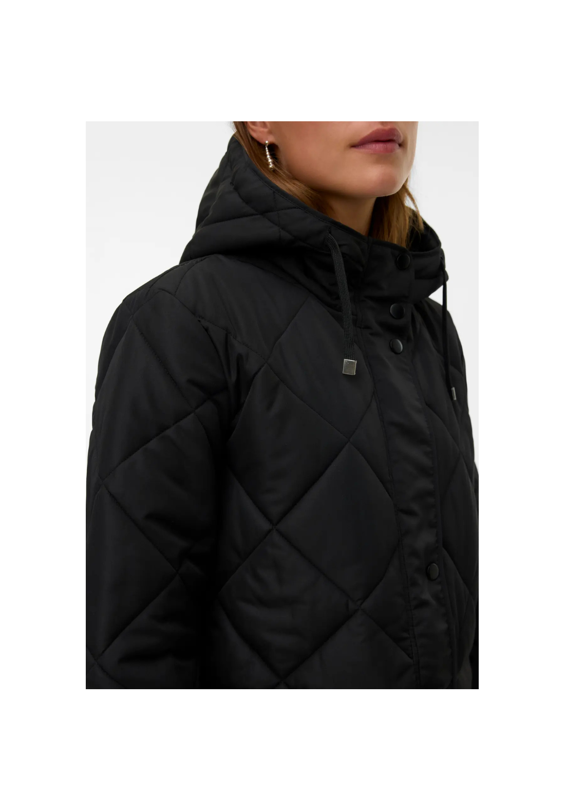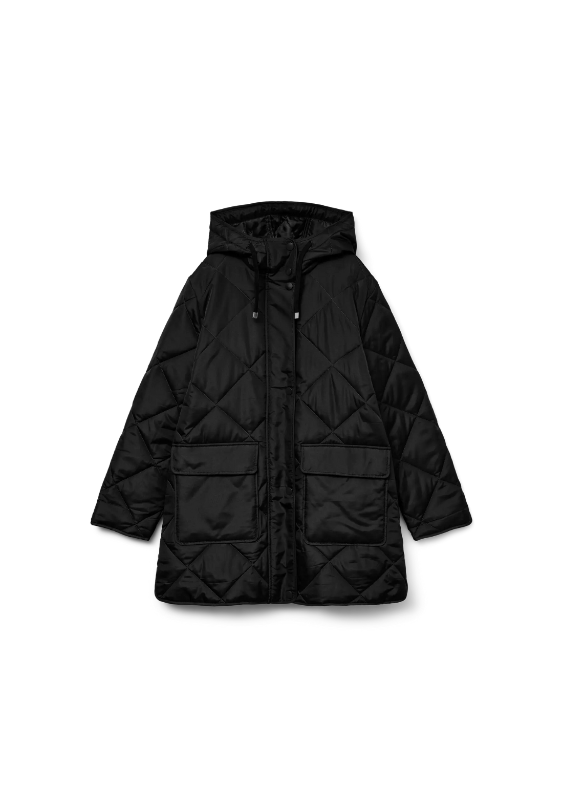 Abrigo con capucha, cierre de botones a presión y bolsillos delanteros. Tiene un cordón ajustable en la capucha.
