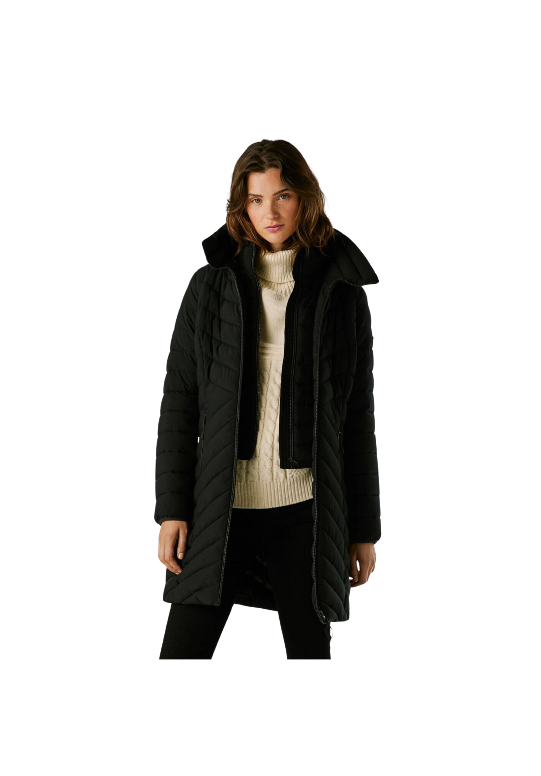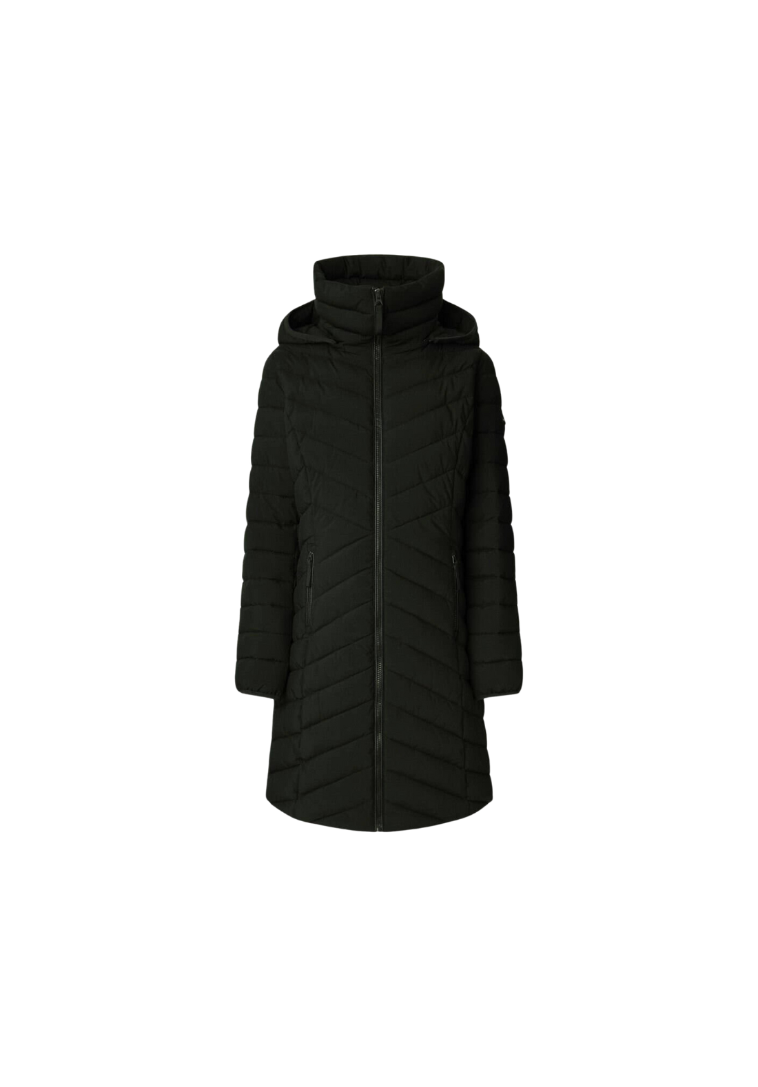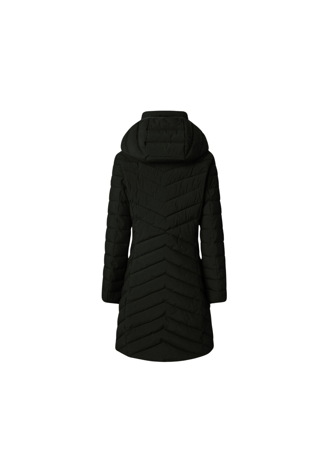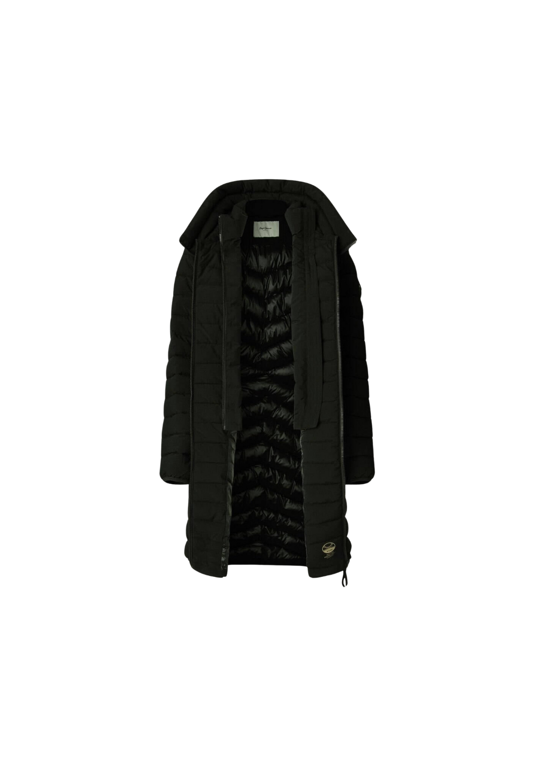 Abrigo plumífero largo, con paneles acolchados en forma de espiga. Tiene el cuello alto y capucha. El cierre es frontal y de cremallera. Tiene una capa interior con cremallera y bolsillos laterales también con cierre de cremallera.