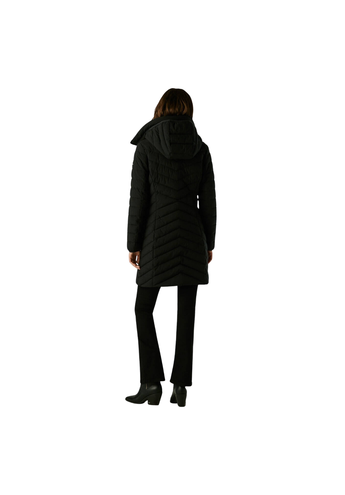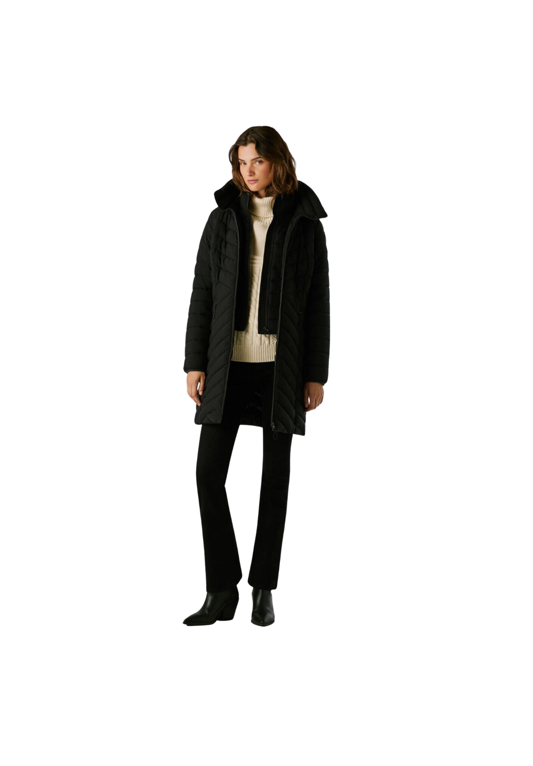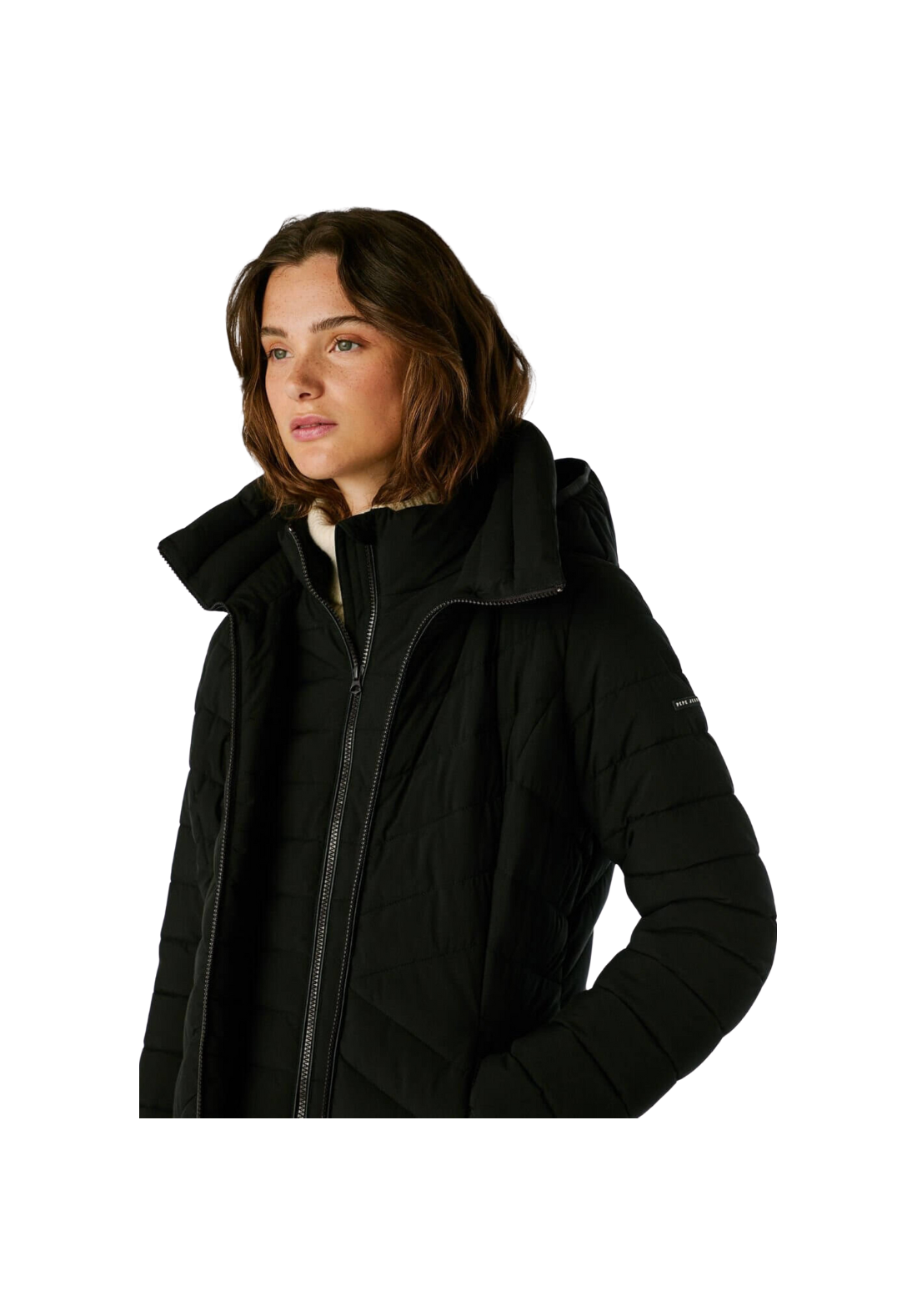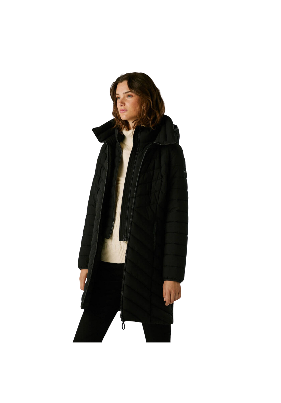 Abrigo plumífero largo, con paneles acolchados en forma de espiga. Tiene el cuello alto y capucha. El cierre es frontal y de cremallera. Tiene una capa interior con cremallera y bolsillos laterales también con cierre de cremallera.