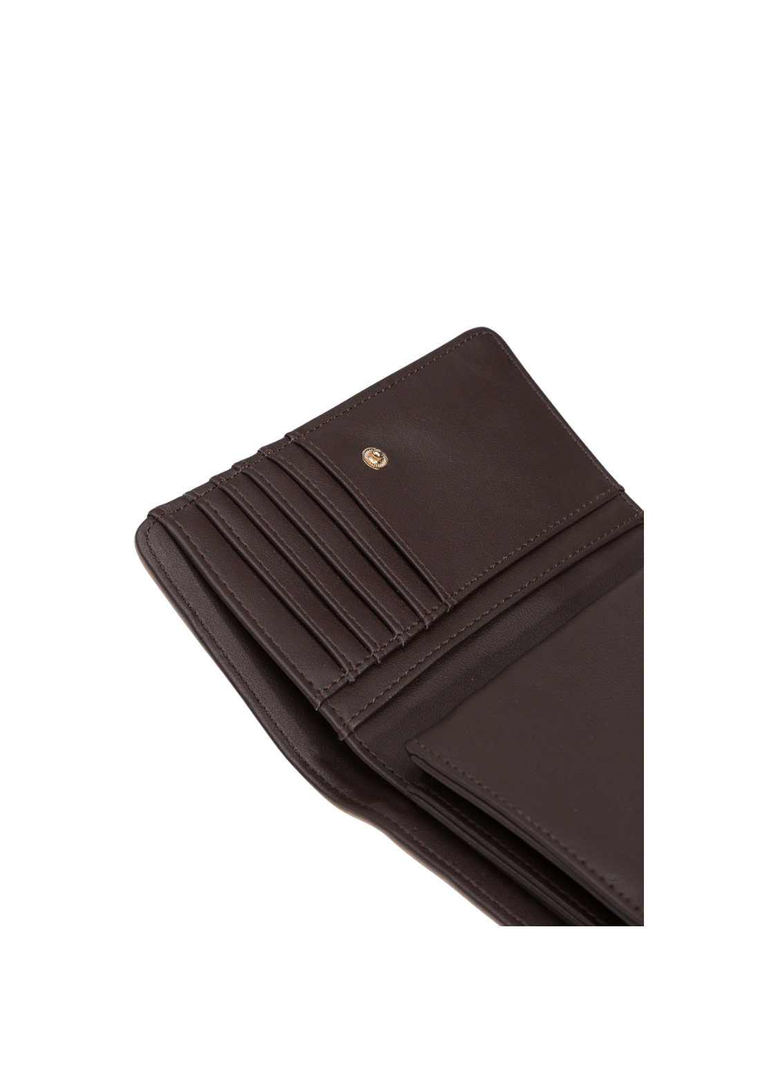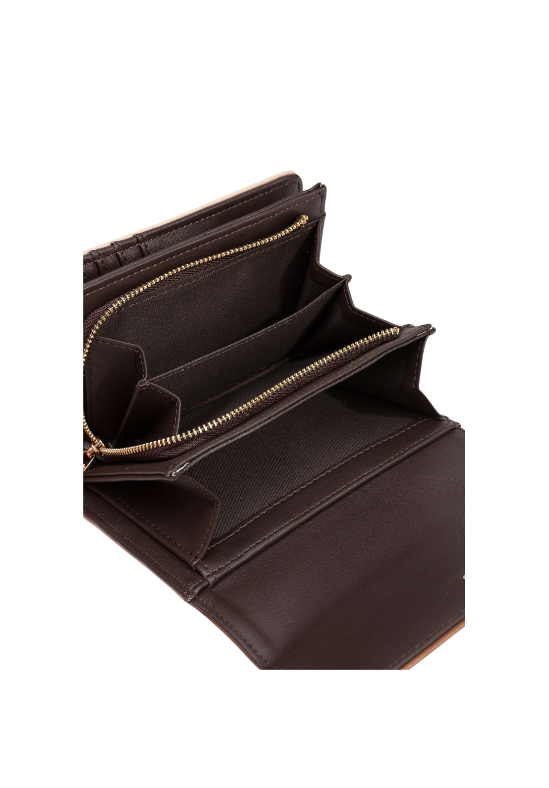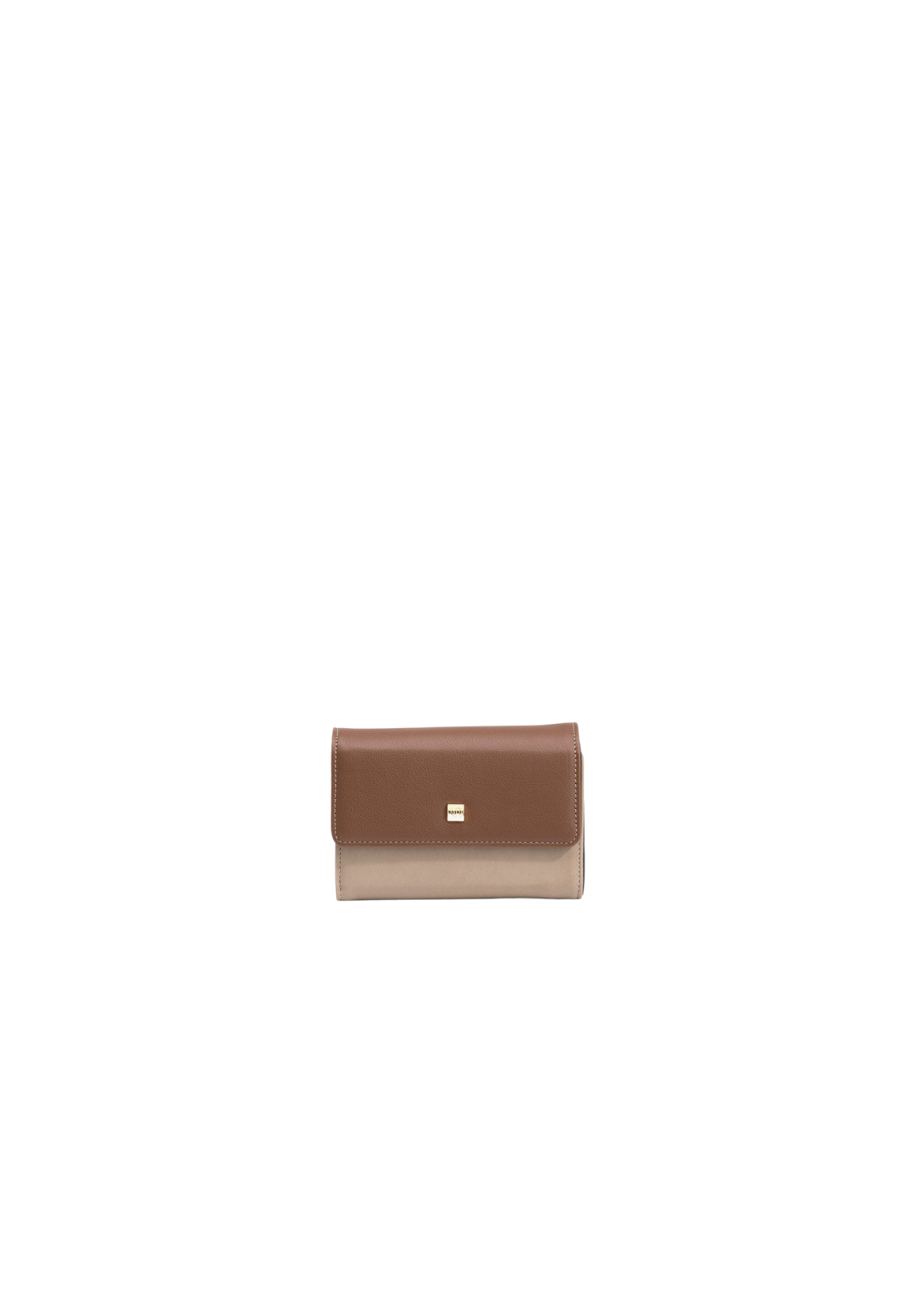Monedero bicolor en efecto ante, con solapa en efecto piel y botón de presión. Compartimentos y bolsillos interiores para billetes, tarjetas y monedas. Tamaño mediano.