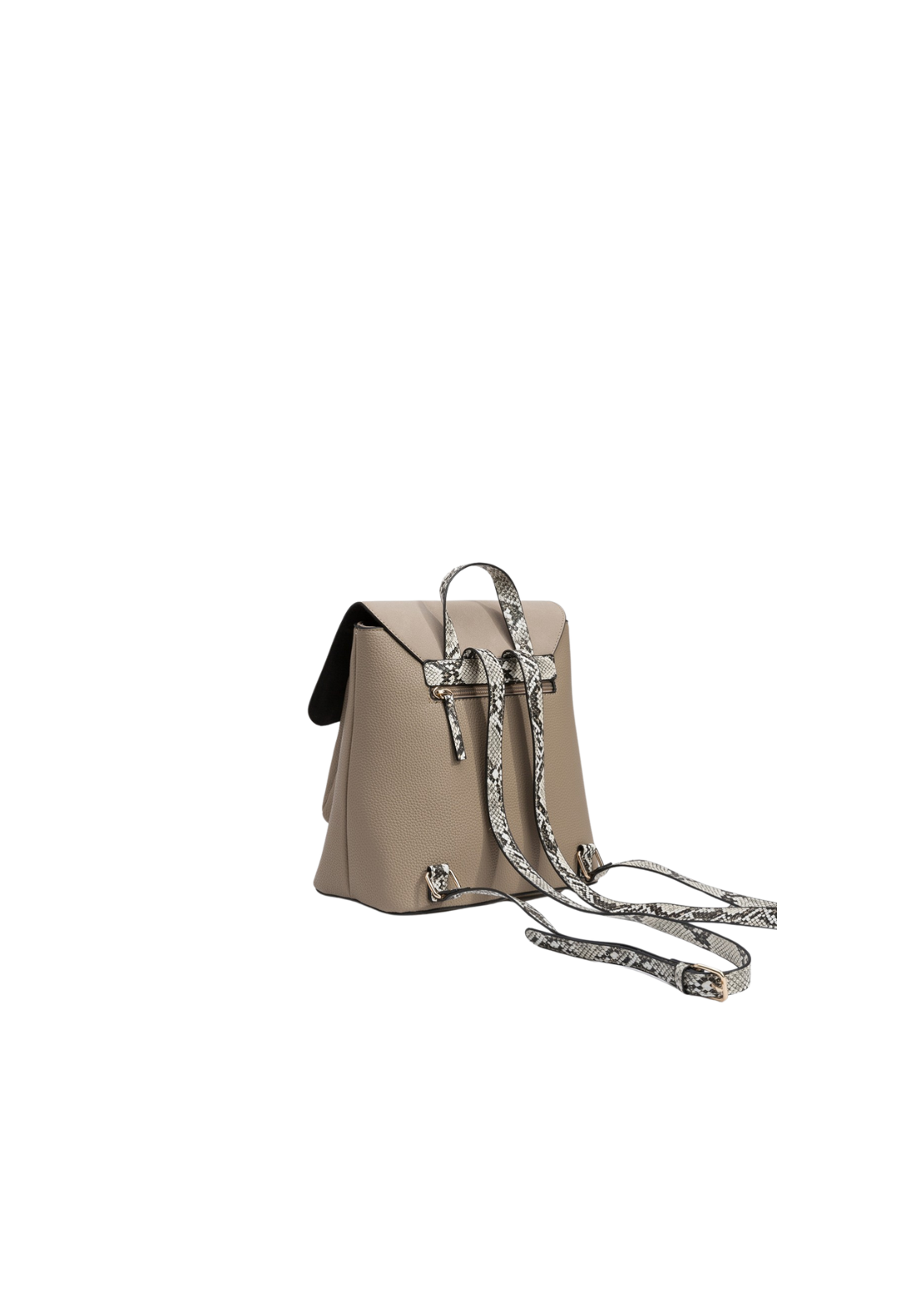 Mochila tipo bucket en efecto piel con bolsillo delantero, solapa en efecto ante y cierre magnético. Asa de mano fija y asas de hombro ajustables en efecto serpiente. Bolsillo trasero y bolsillo interior con cremallera. Tamaño mediano.