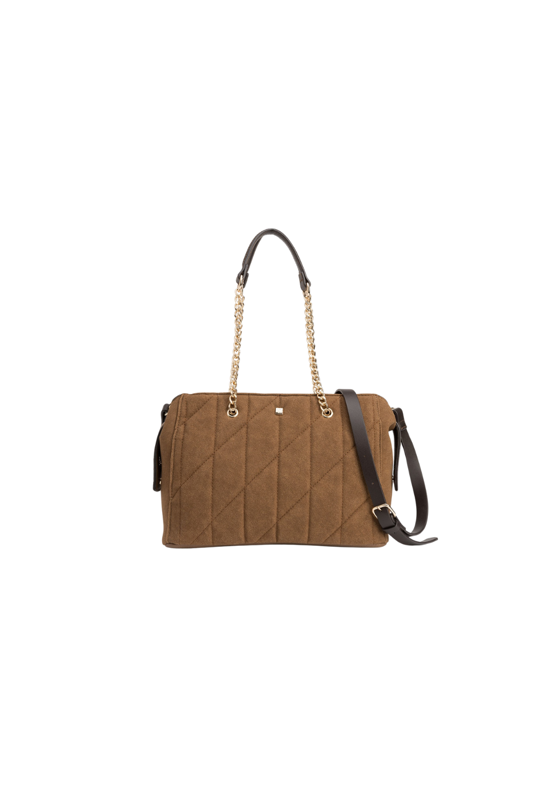 Bolso city efecto ante acolchado con cierre de cremallera superior y asas de hombro combinadas con cadena. Correa bandolera ajustable y extraíble. Bolsillo interior con cierre de cremallera.