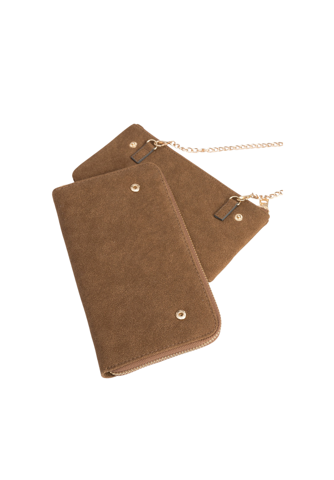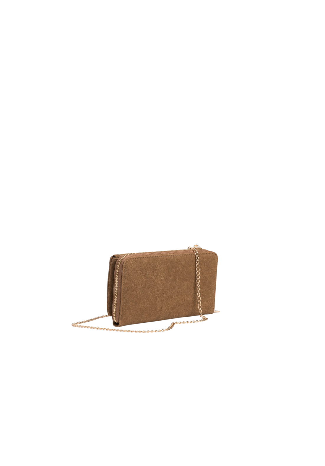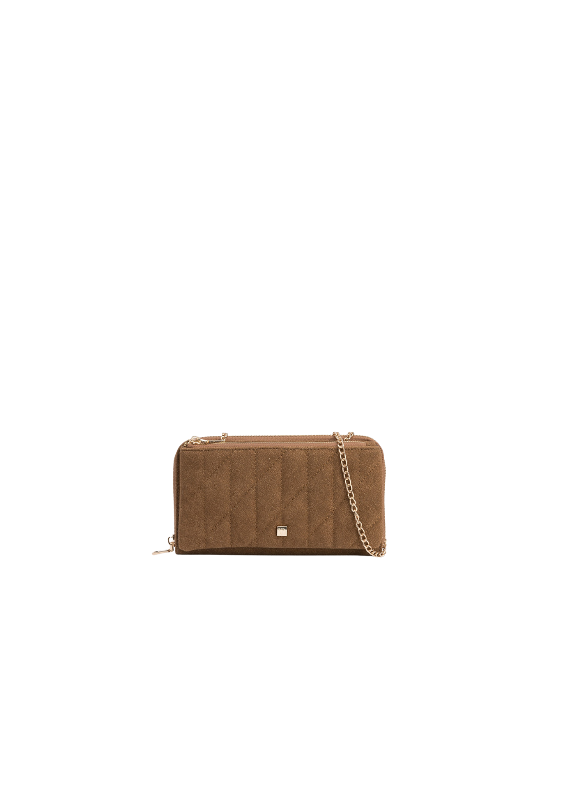 Monedero efecto ante acolchado, con bolsillo frontal extraíble, correa de cadena desmontable y cierres de cremallera superiores. Interior con bolsillo para monedas, compartimentos para tarjetas y billetes. Tamaño grande.