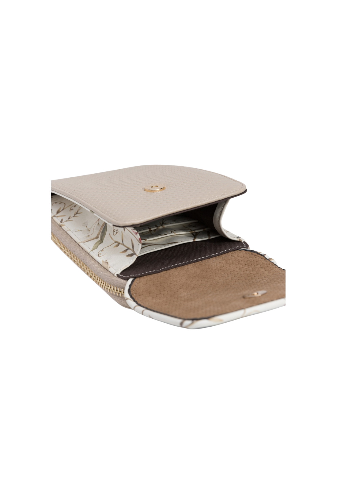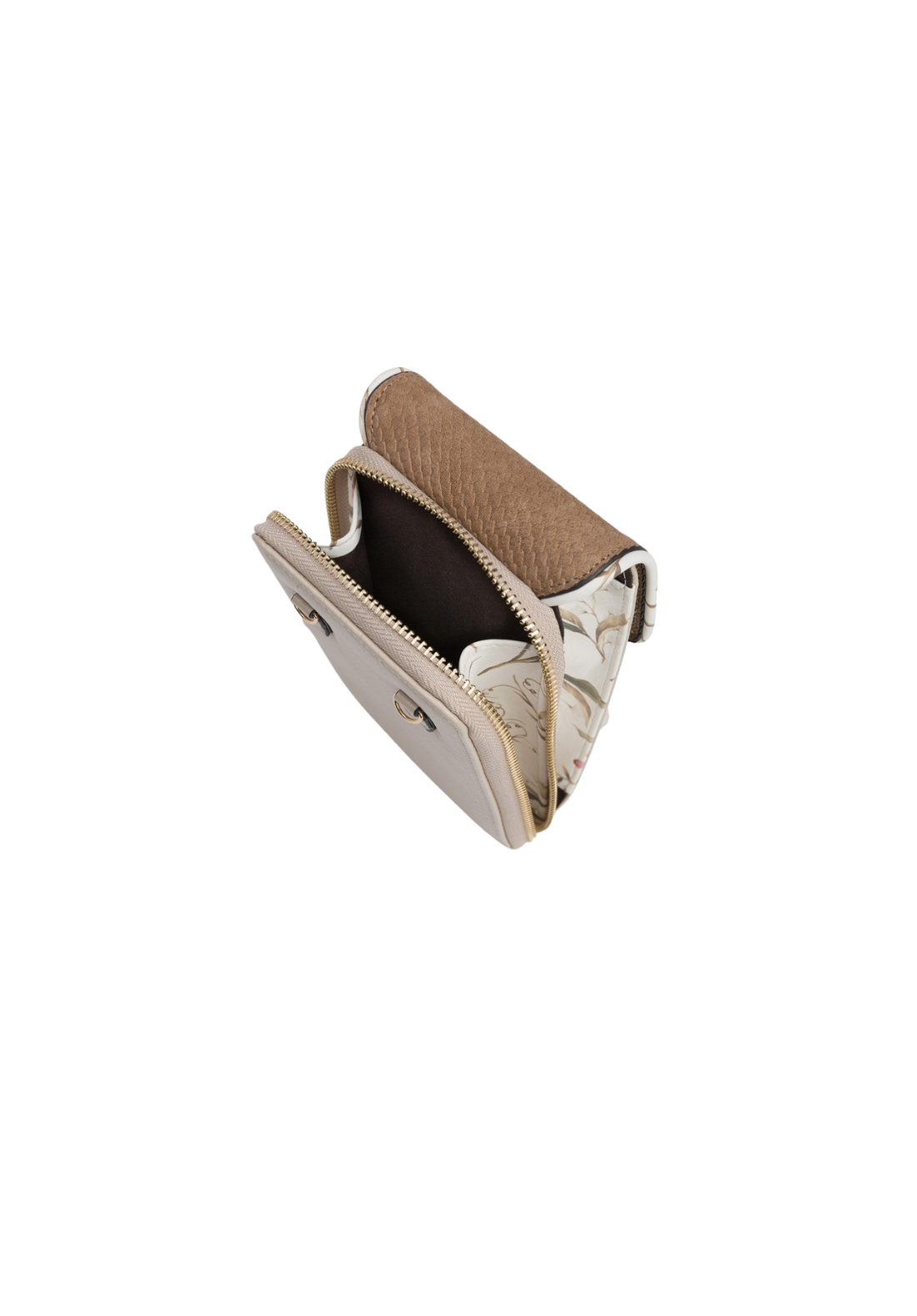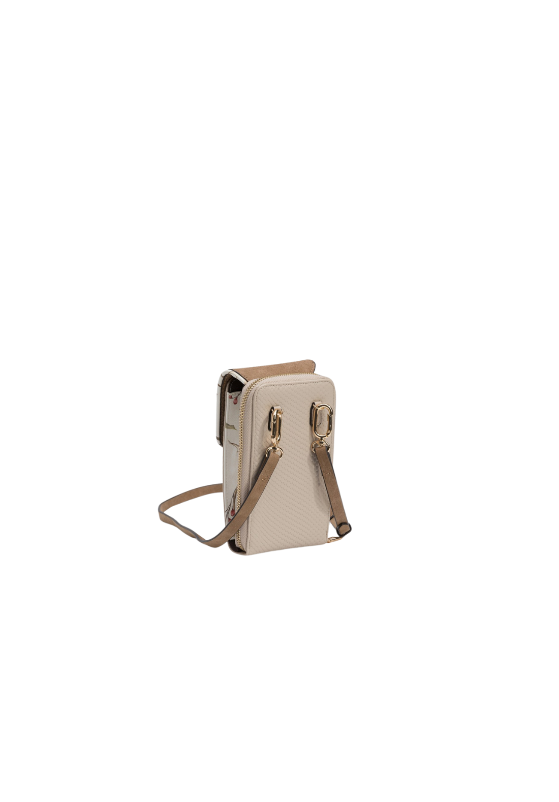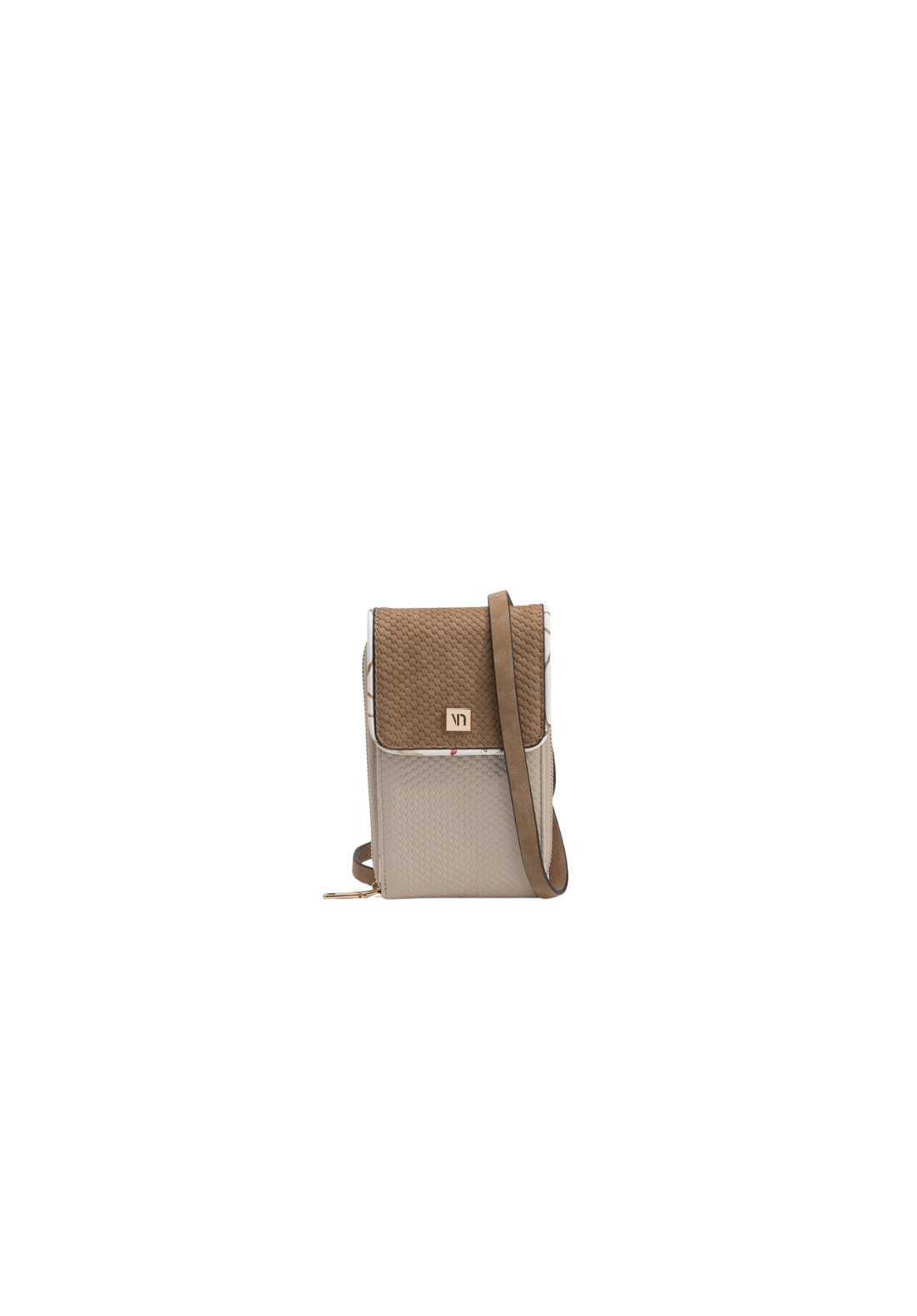 Bolsa para móvil en efecto piel bicolor, con textura, solapa y correa bandolera ajustable y desmontable. Compartimentos interiores para tarjeta y cierre superior de cremallera.