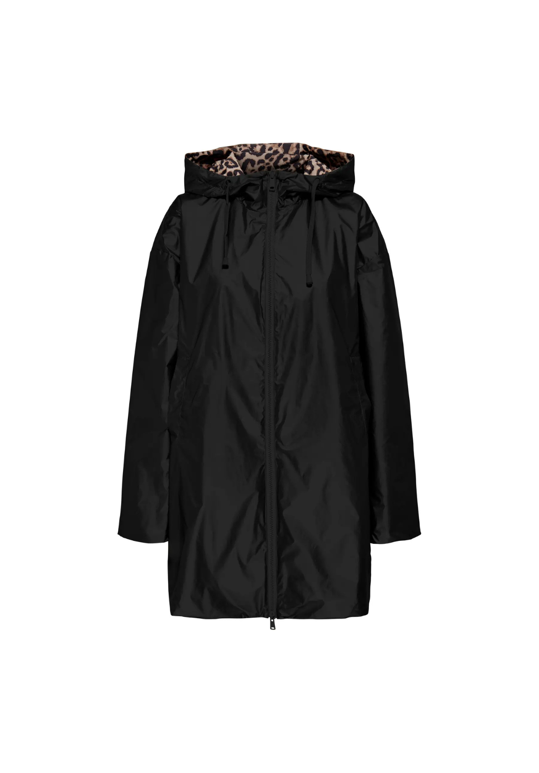 Abrigo reversible, con capucha, bolsillos laterales y cierre con cremallera.