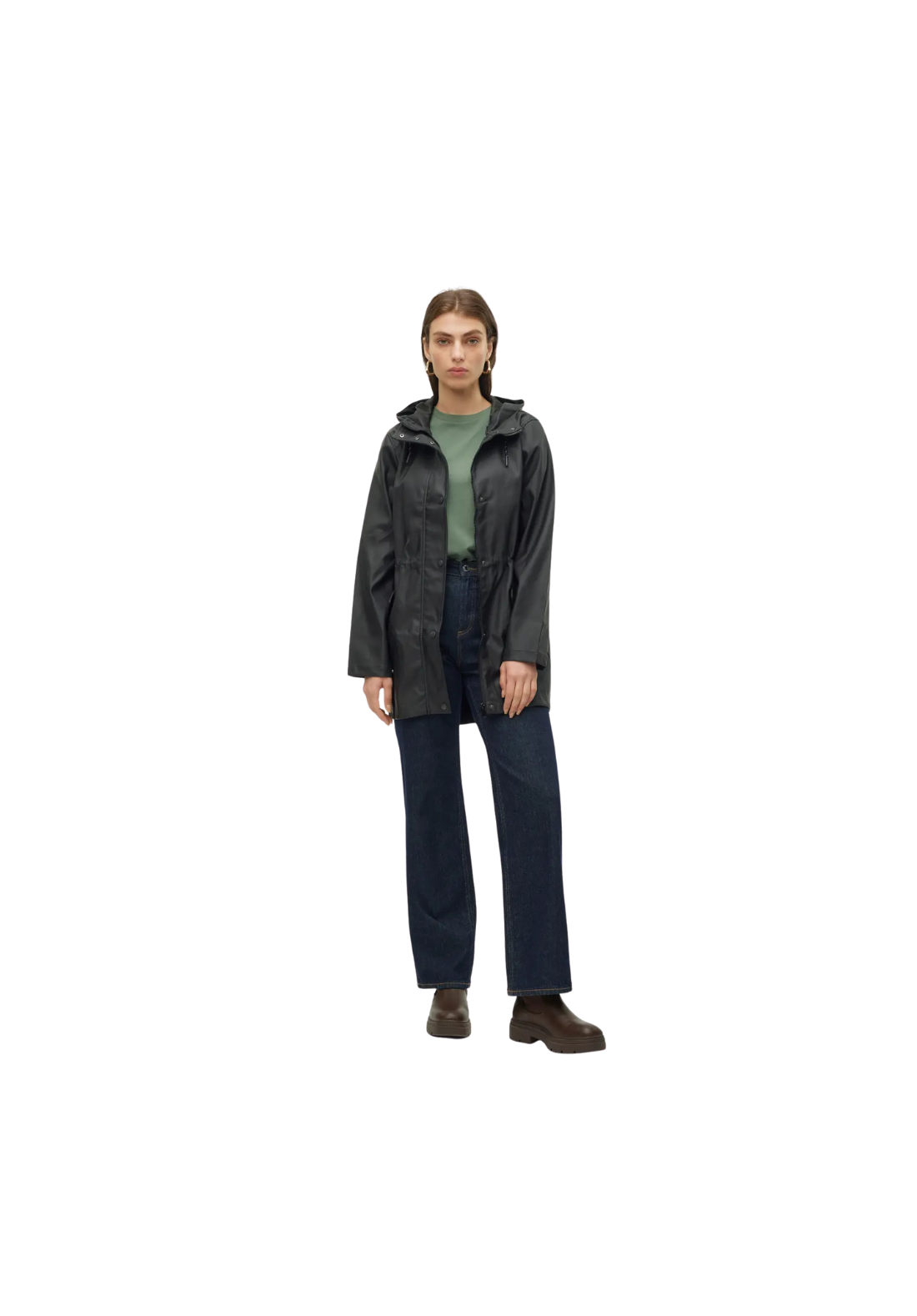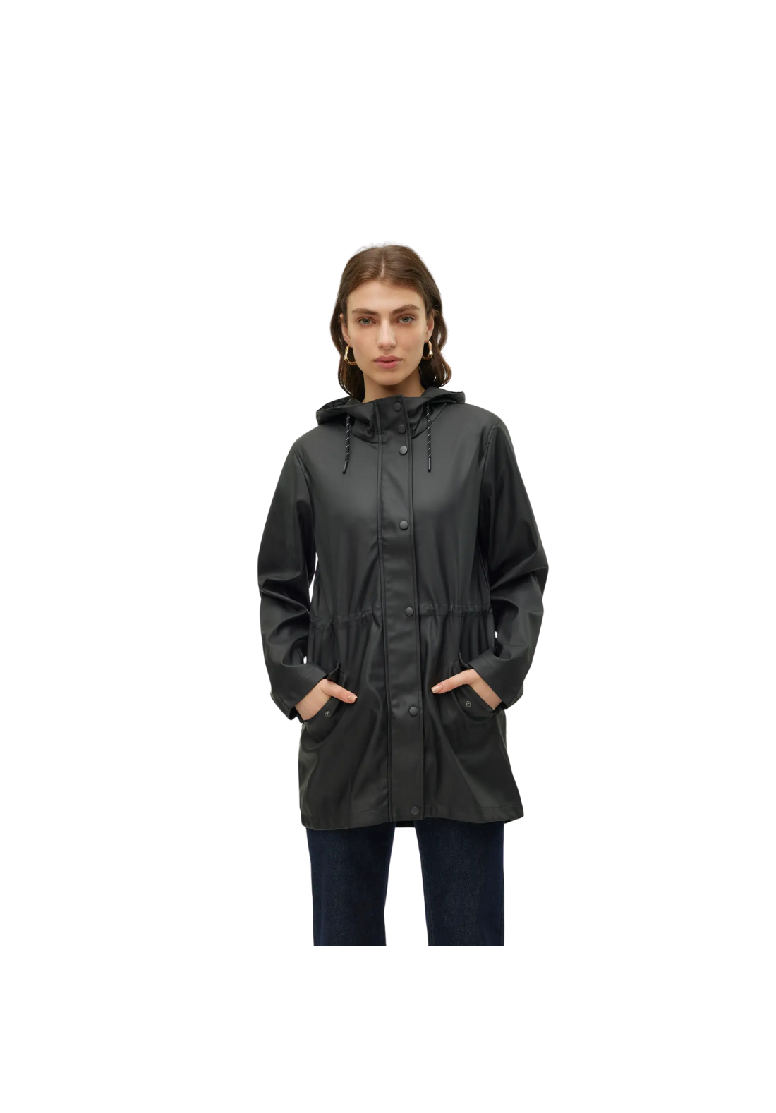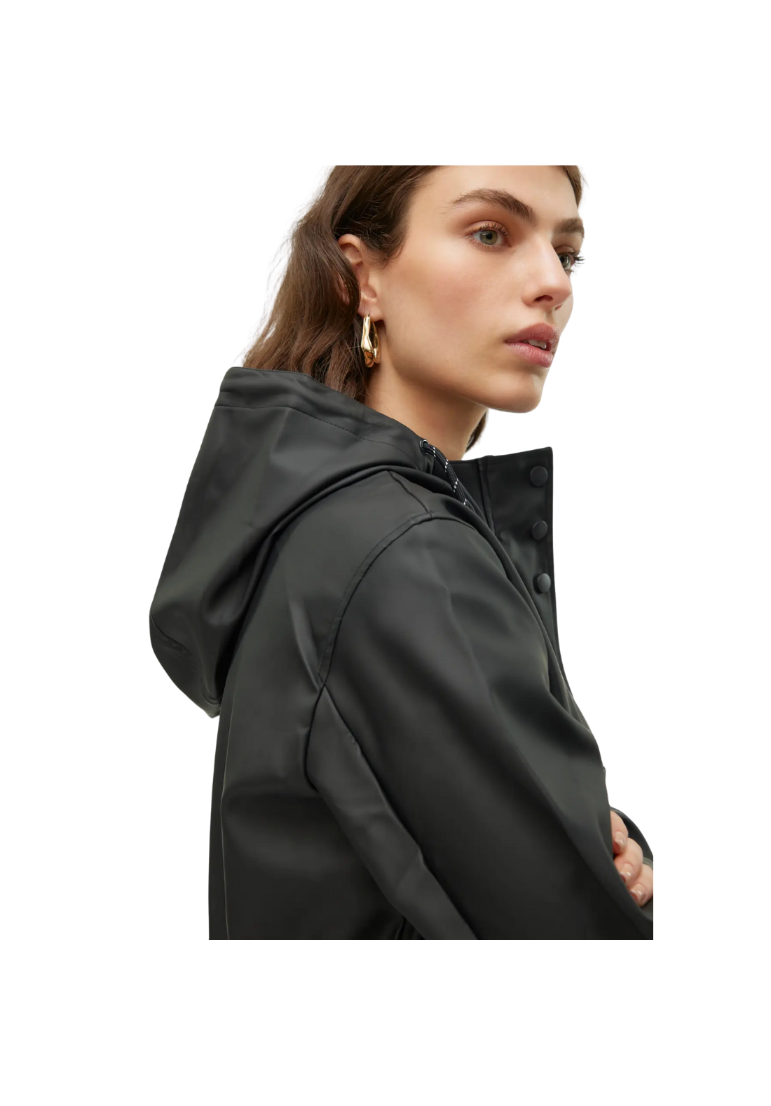Chaqueta impermeable con capucha. Tiene bolsillos laterales con cierre de botón a presión y un cordón en la cintura para ajustarla.