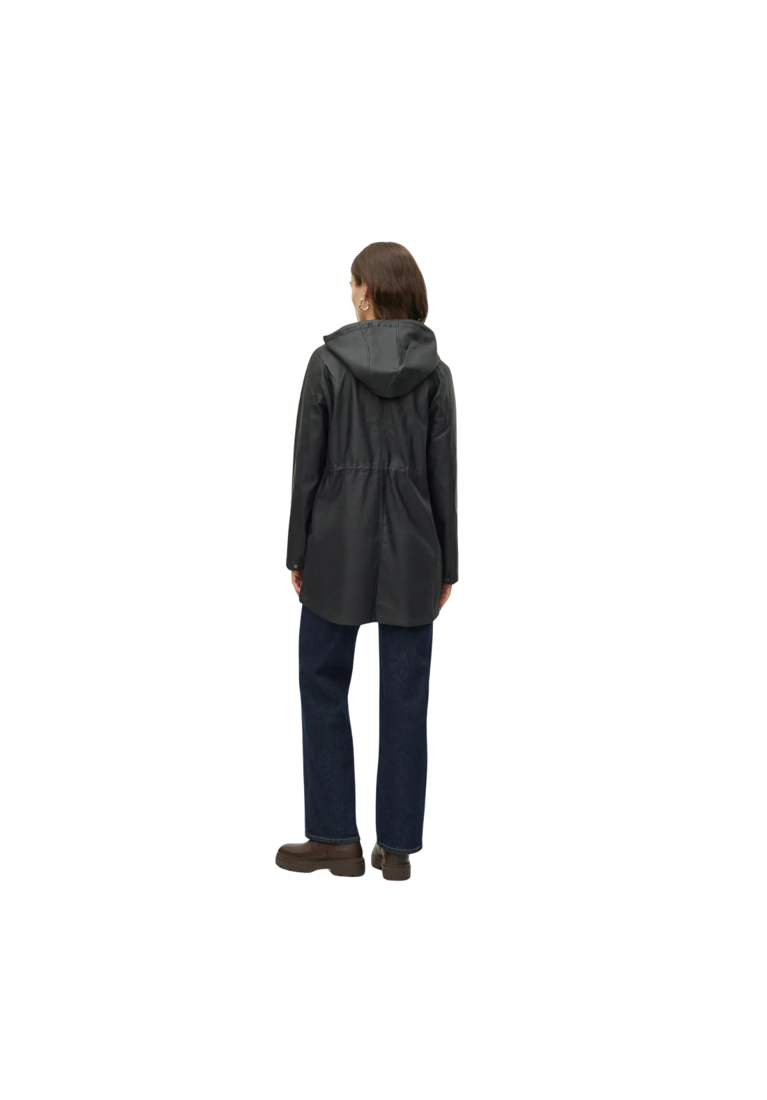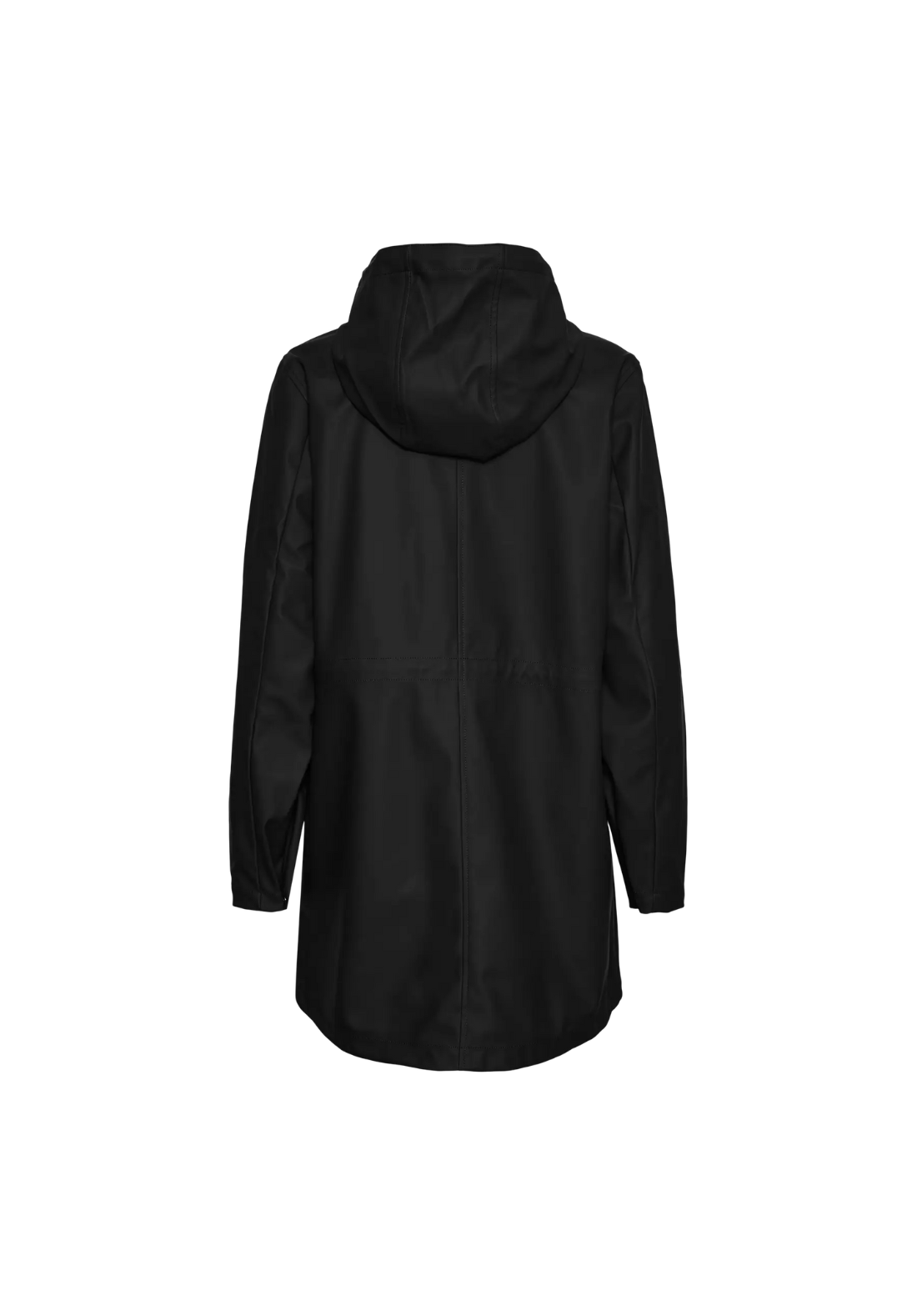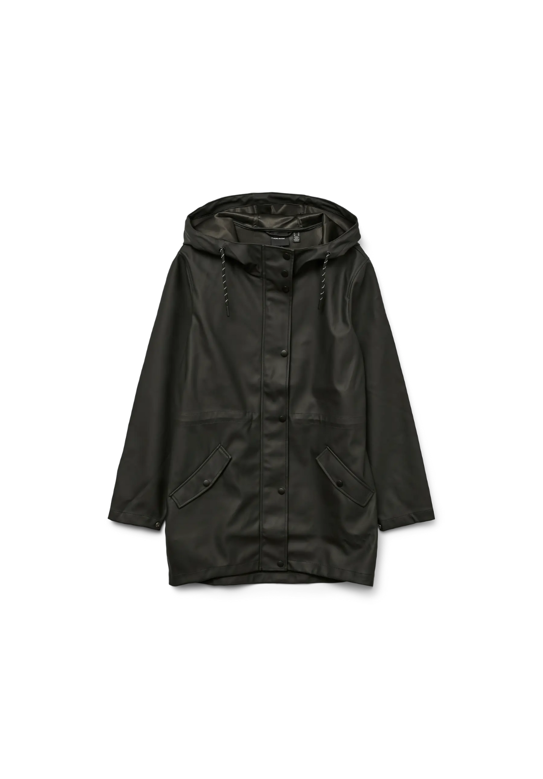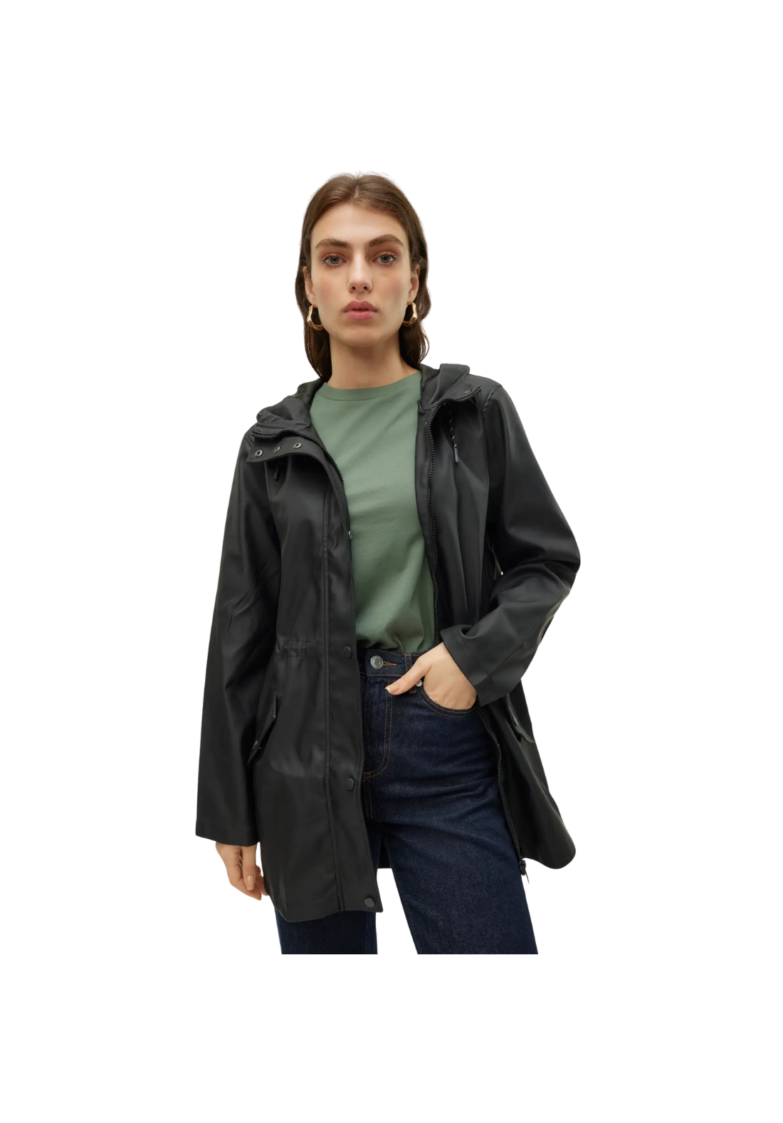 Chaqueta impermeable con capucha. Tiene bolsillos laterales con cierre de botón a presión y un cordón en la cintura para ajustarla.