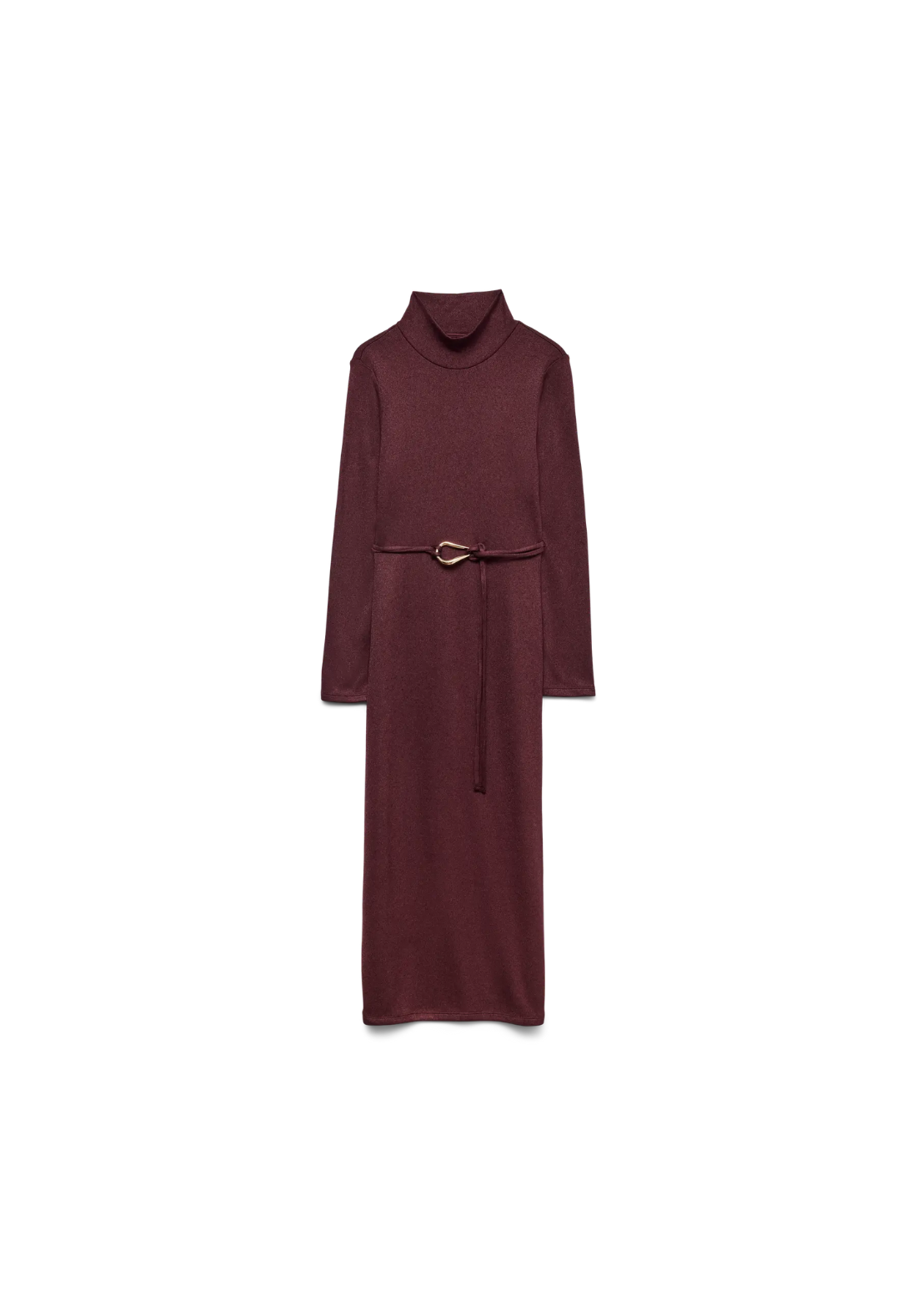 Vestido de manga larga, con cuello alto y lazada en la cintura. Detalle de broche en el cinturón.
