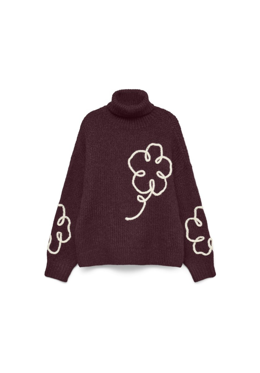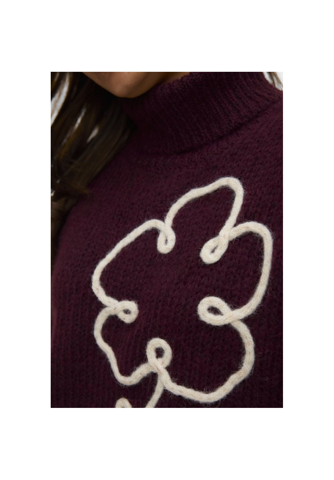 Jersey de punto, de cuello vuelto, mangas largas y hombros caídos. Detalle de bordado y puños acanalados.