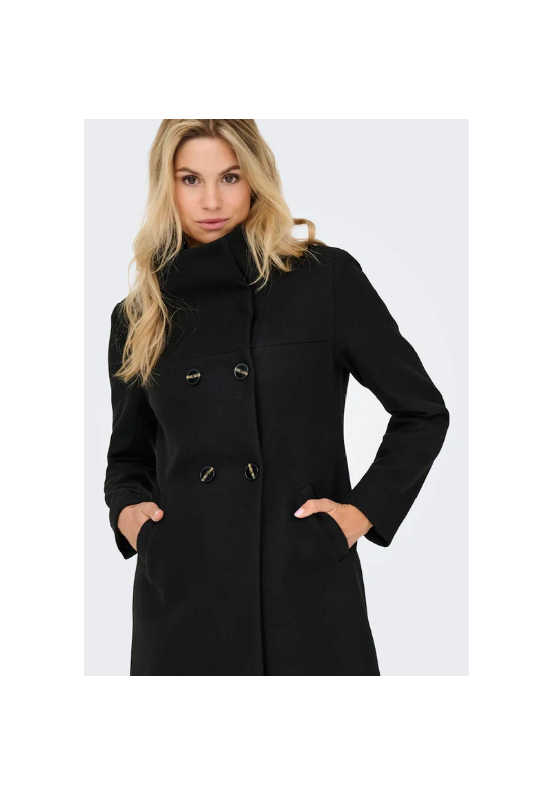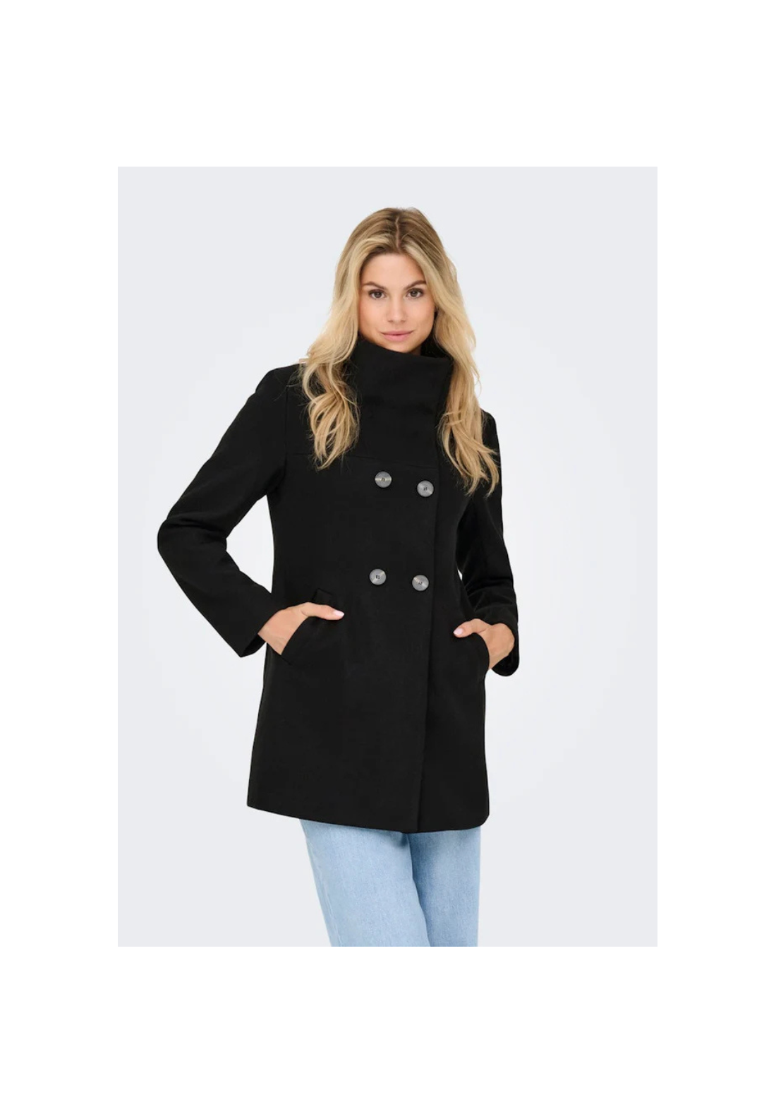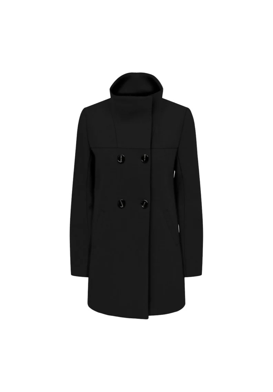 Abrigo de cuello reverso, con cierre de doble botonadura. Tiene bolsillos laterales