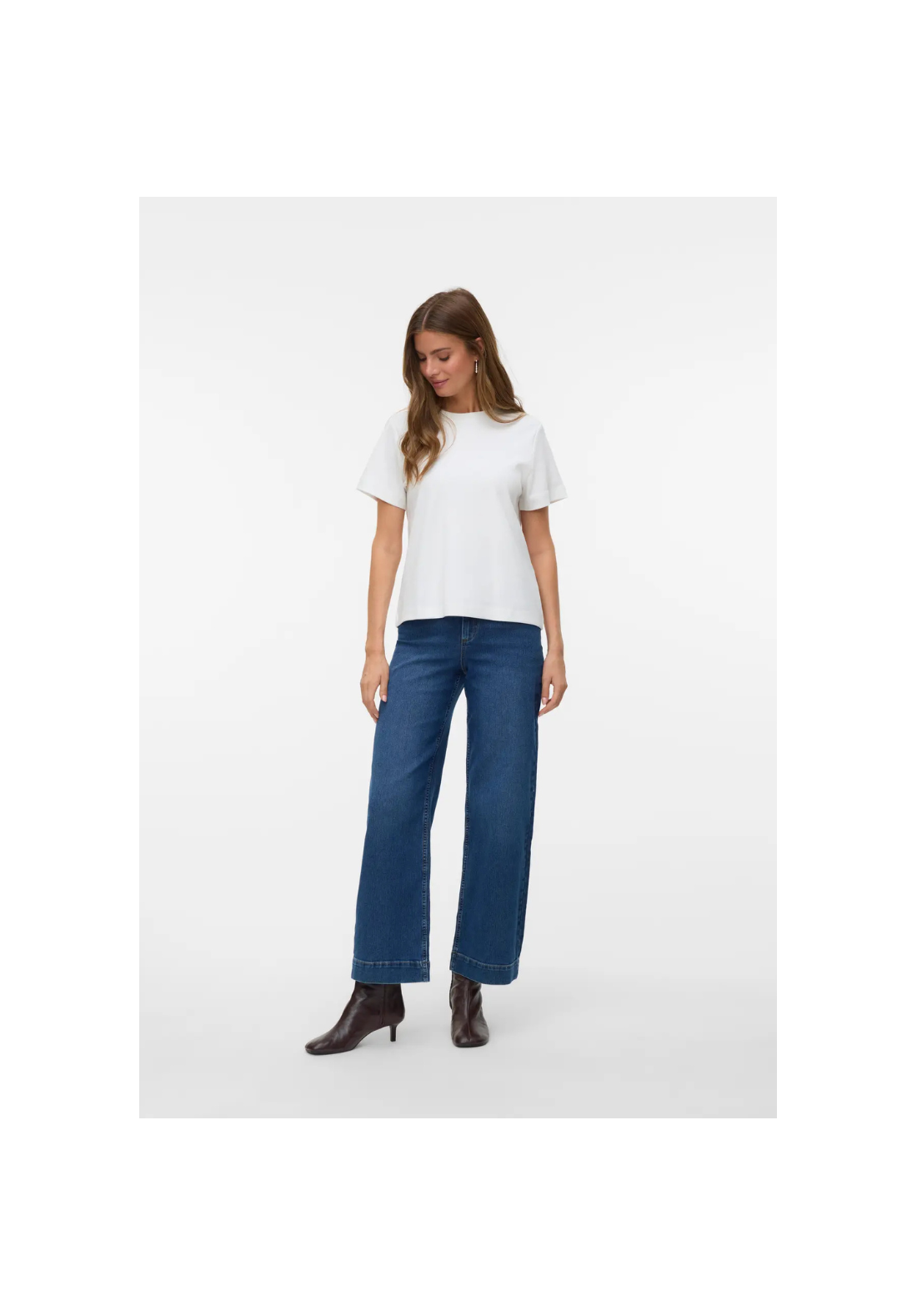 Vaqueros de cintura alta, de corte ancho, con cierre de botón y cremallera. Tiene bolsillos traseros y delanteros.