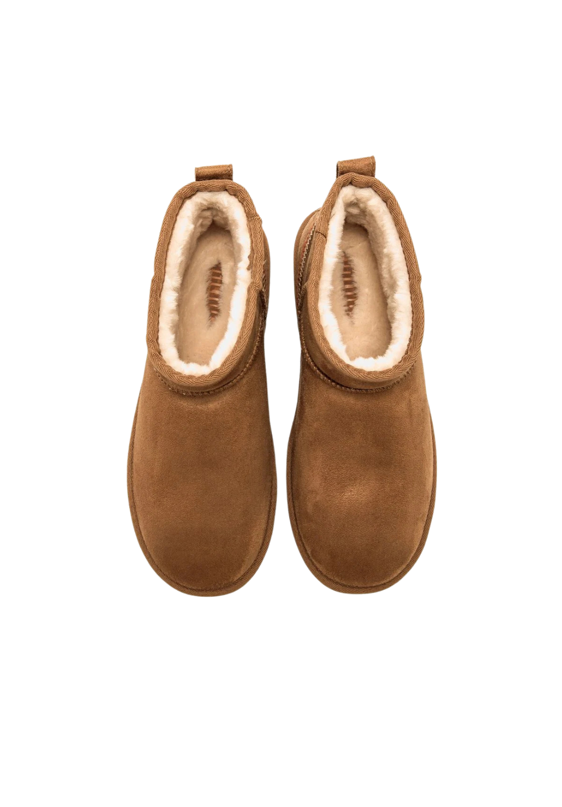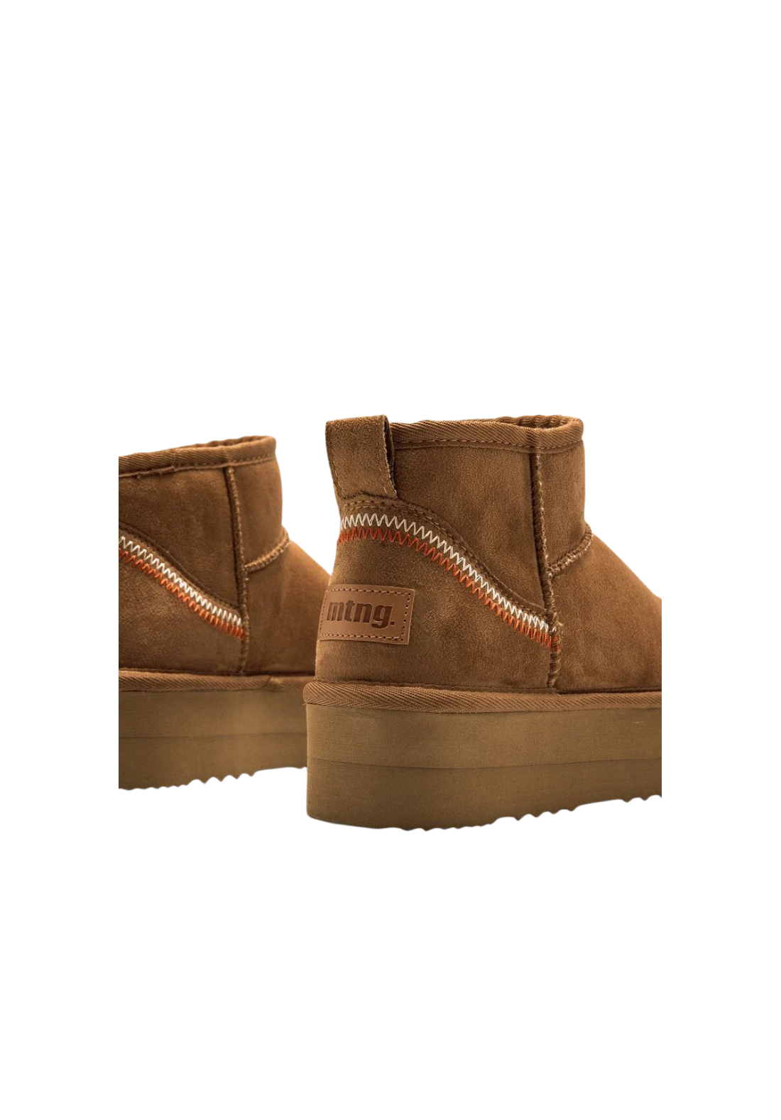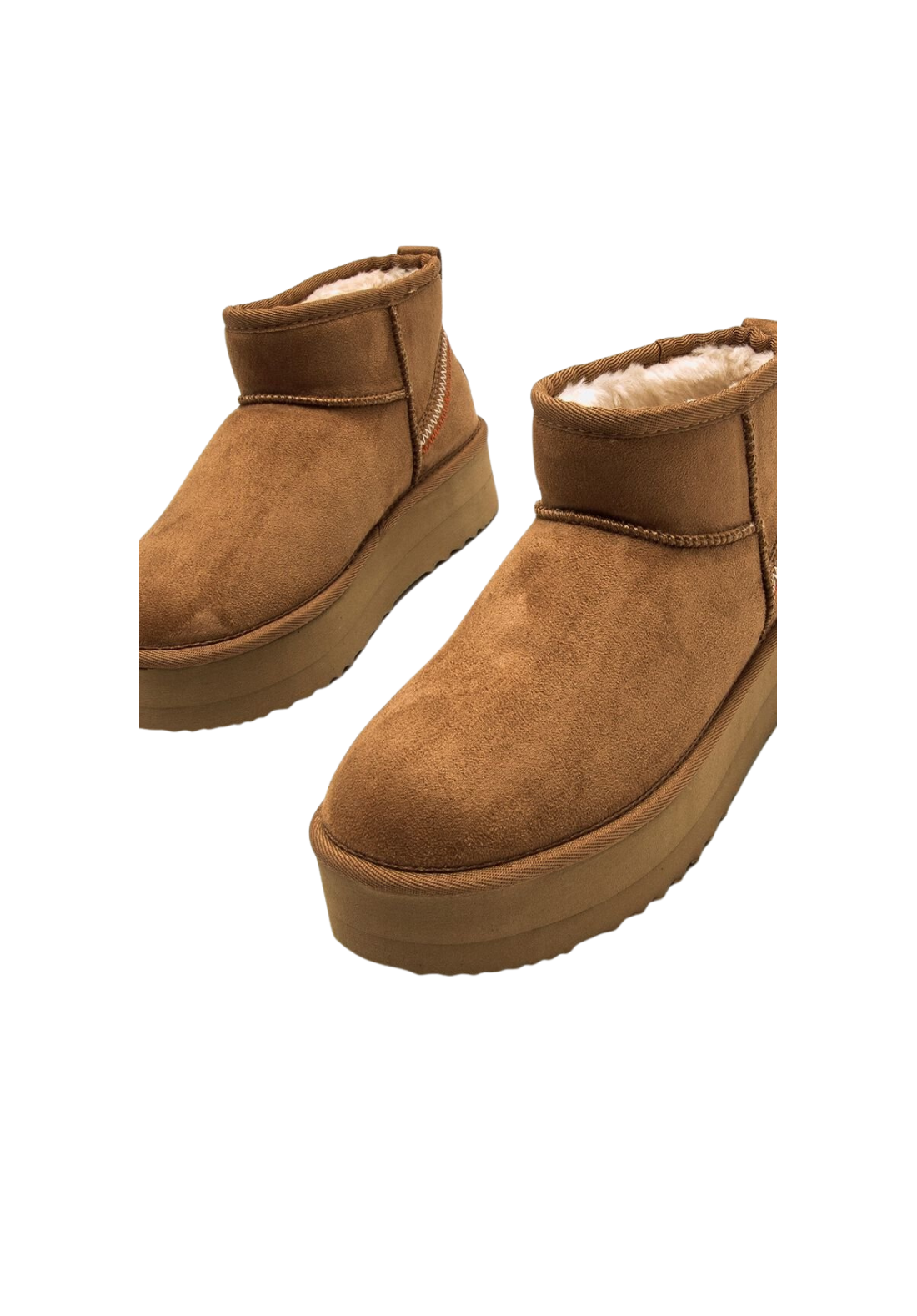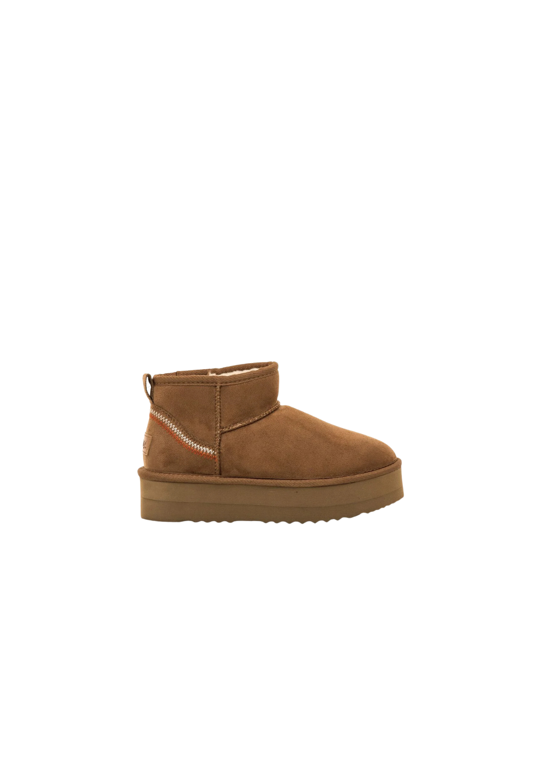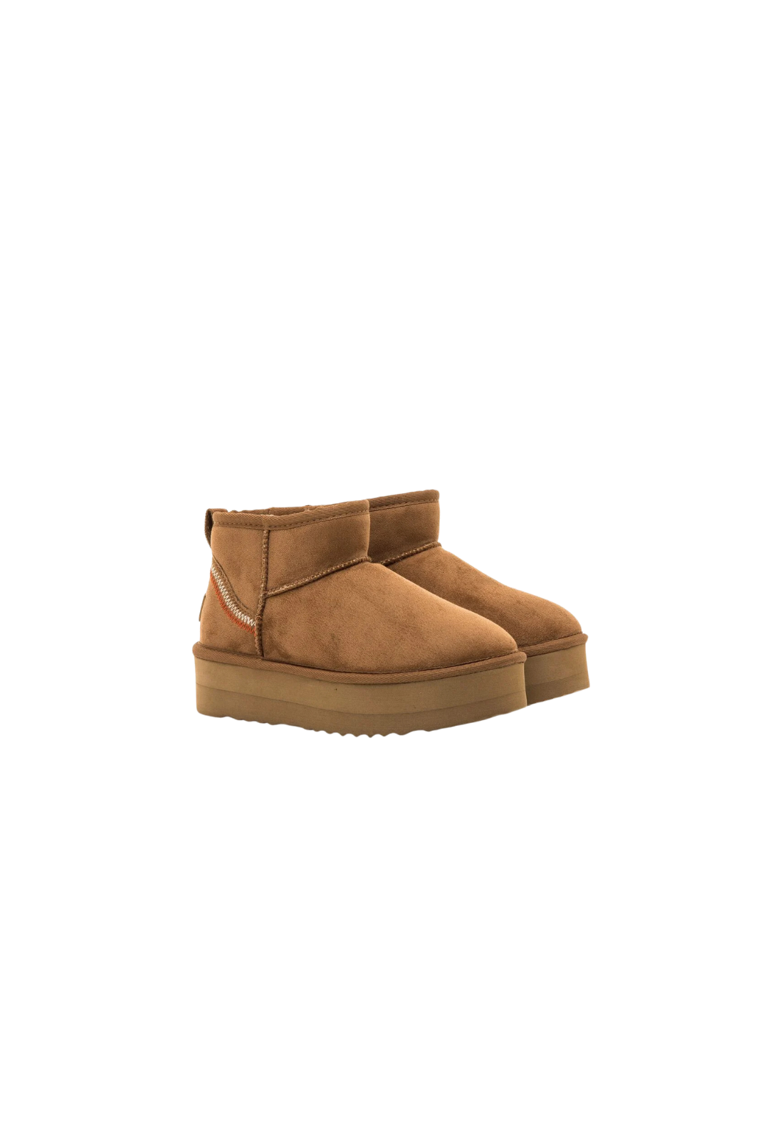 Botín  de estilo australiano con plataforma y caña baja. Interior forrado de borreguillo, suela alta de plataforma. Incluye detalle decorativo de costura en zigzag  en el talón y tirador trasero para facilitar el calce.