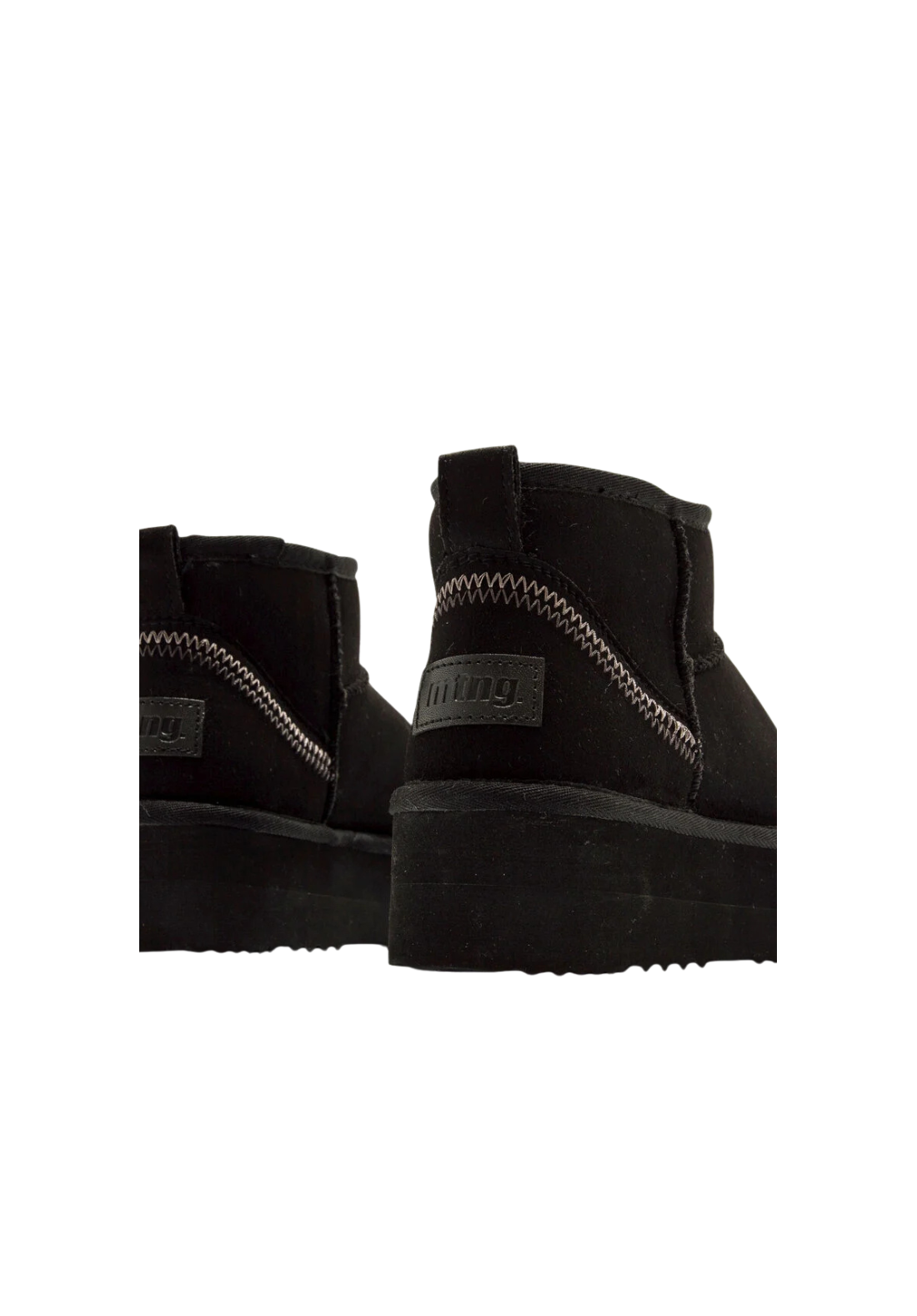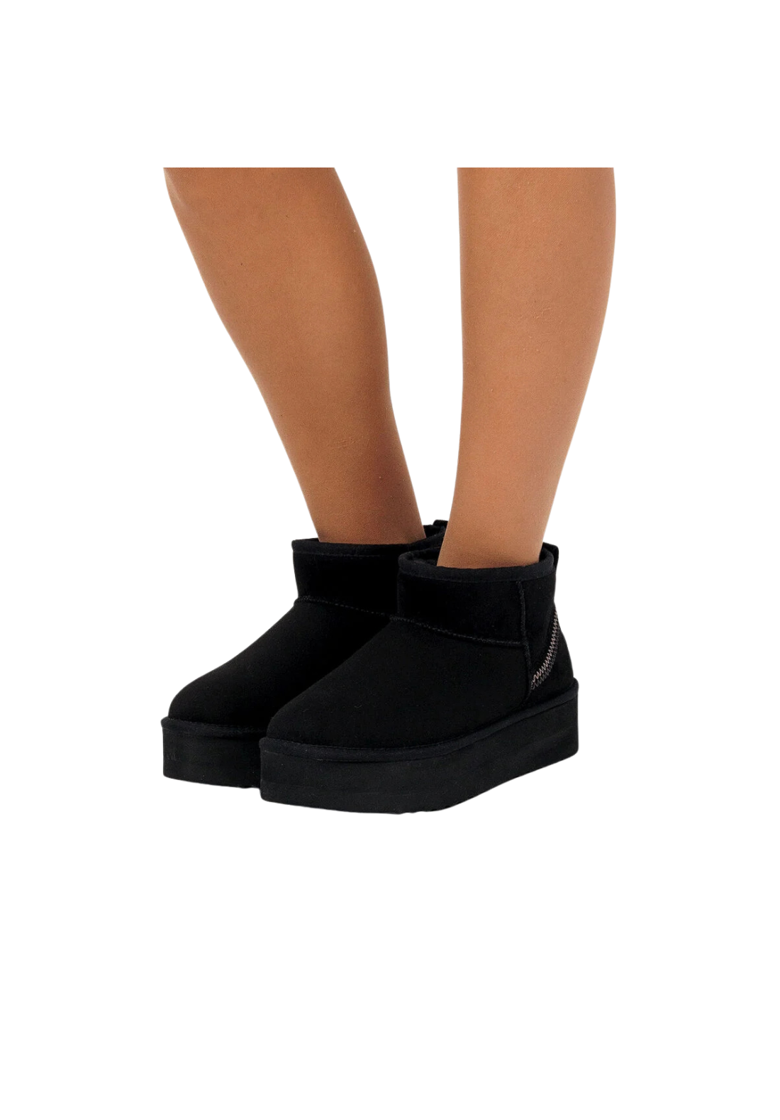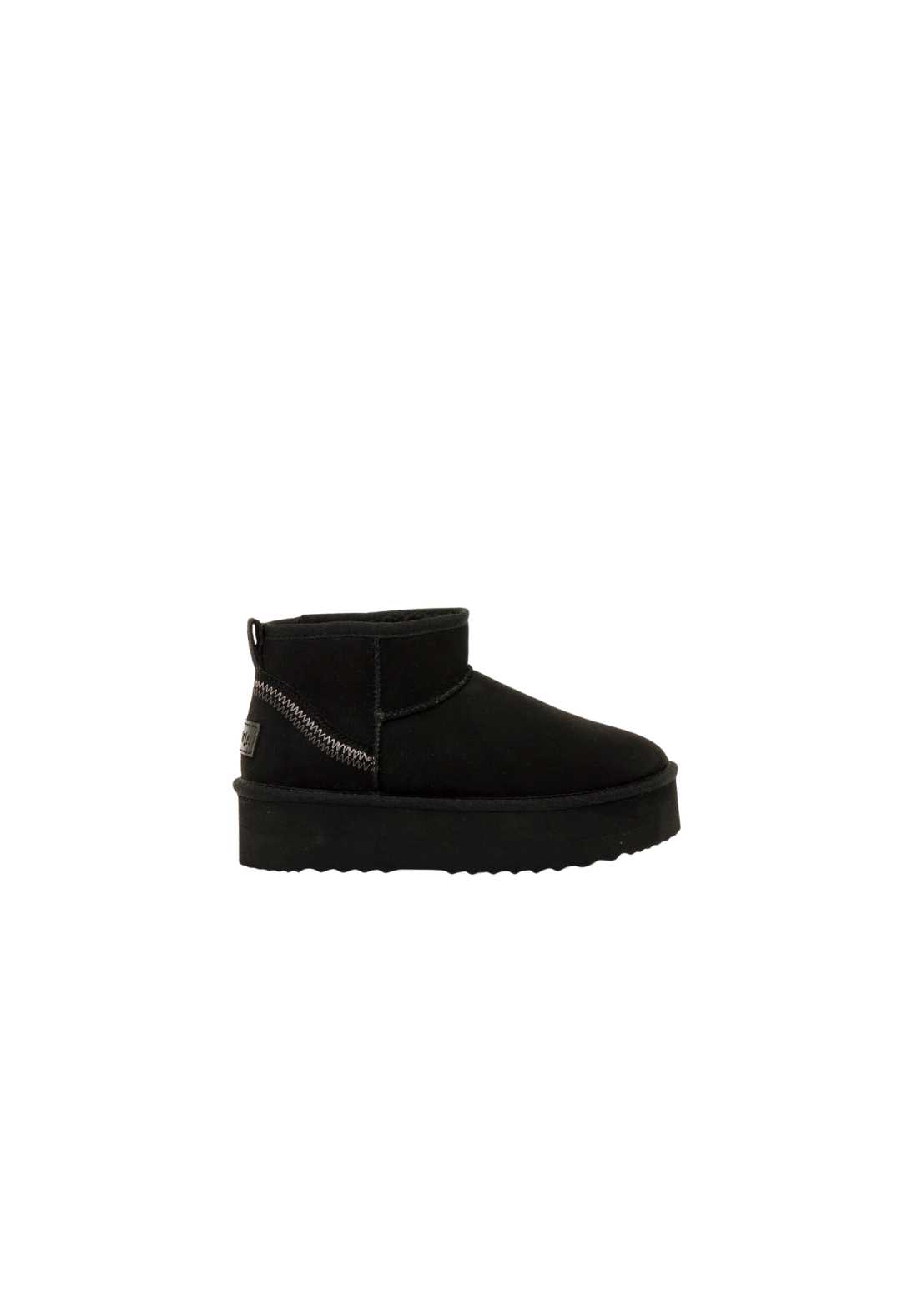Botín  de estilo australiano con plataforma y caña baja. Interior forrado de borreguillo, suela alta de plataforma. Incluye detalle decorativo de costura en zigzag  en el talón y tirador trasero para facilitar el calce.