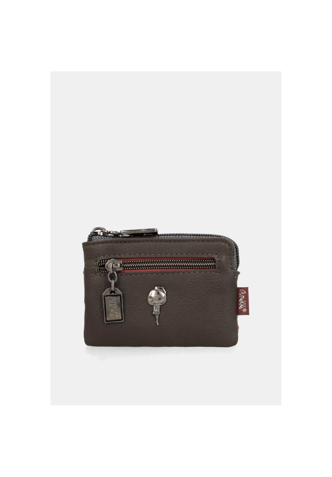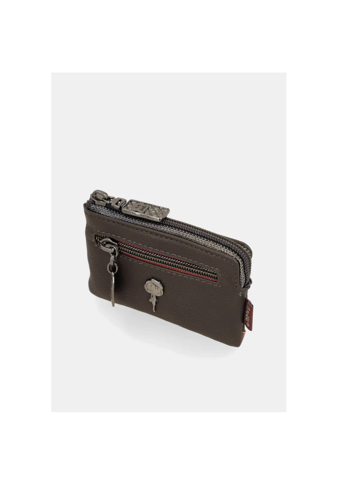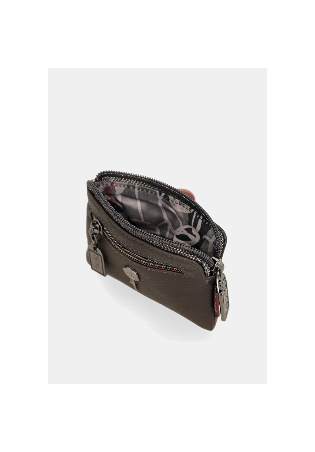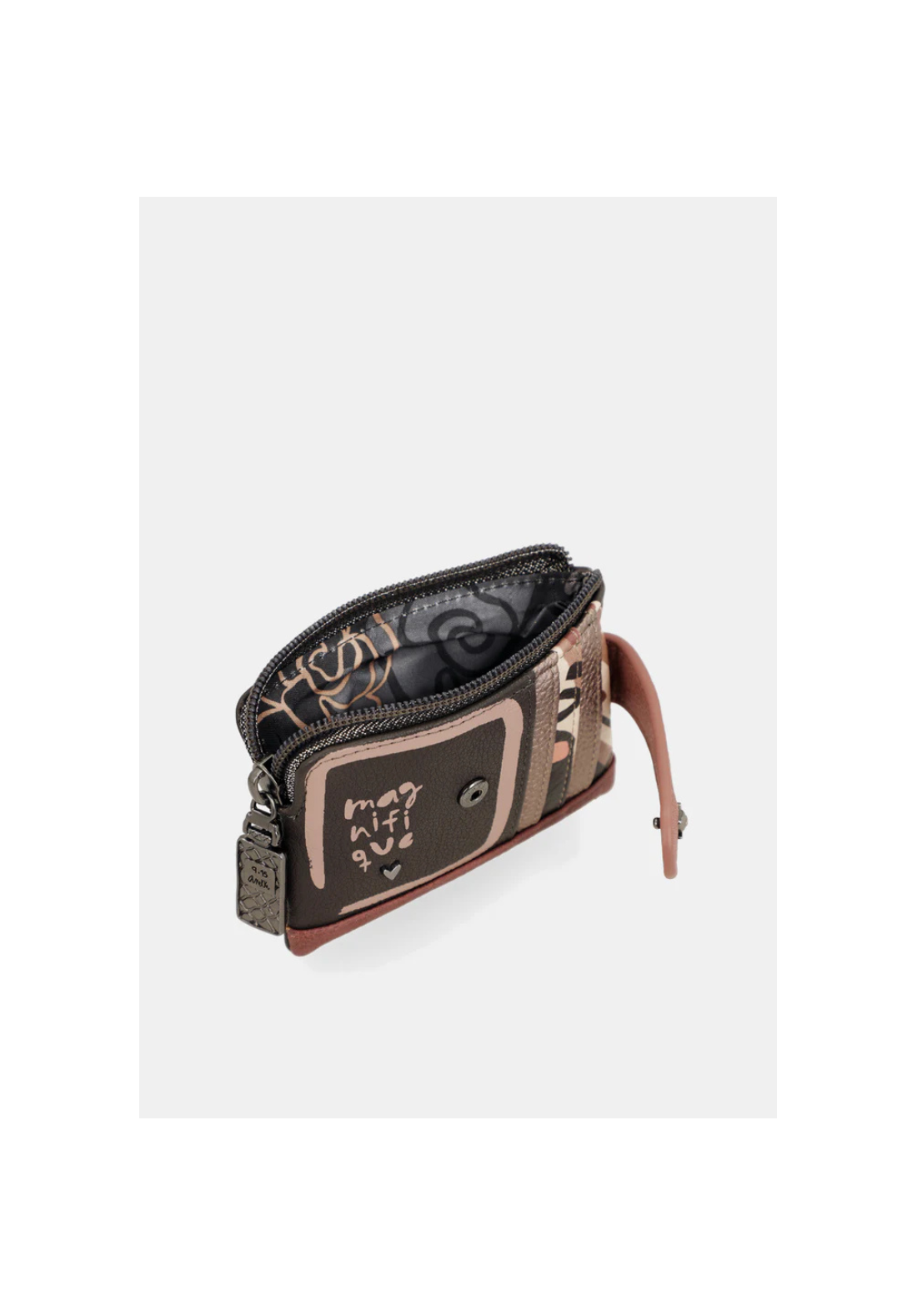 Monedero tarjetero con cierre de cremallera y solapa. Tiene un bolsillo trasero y multitarjetas delante.