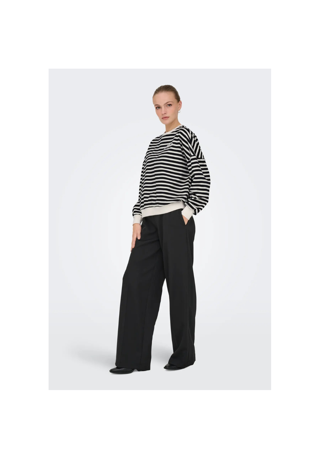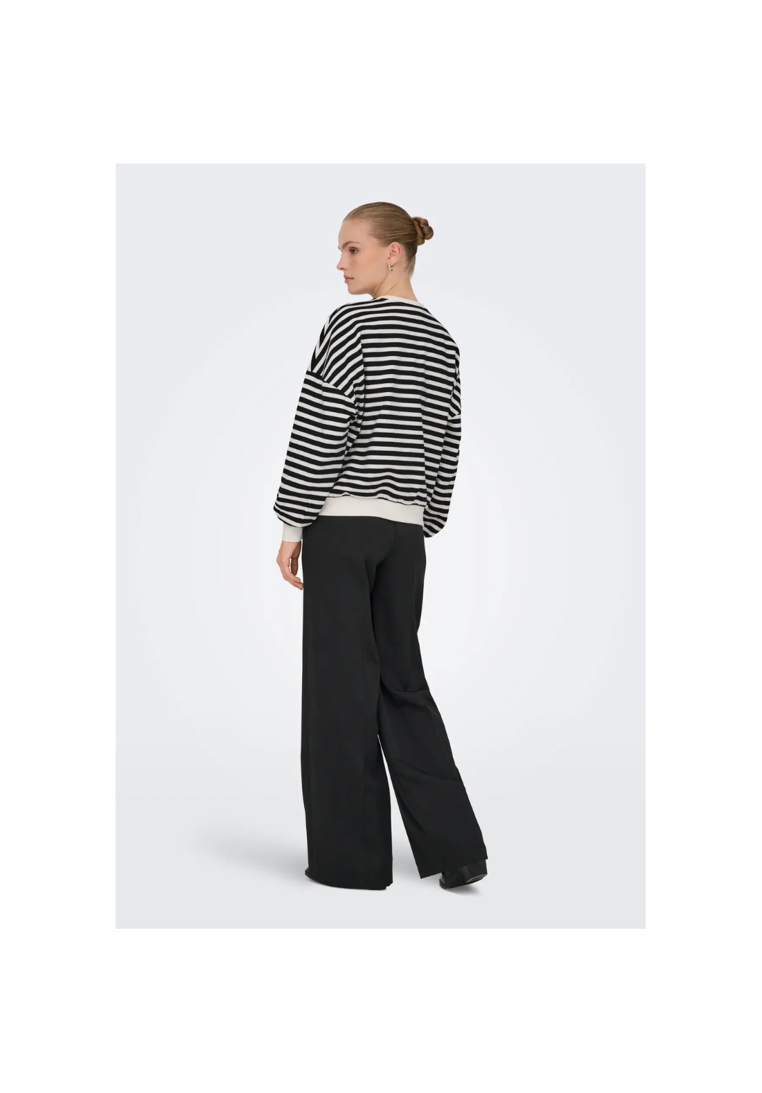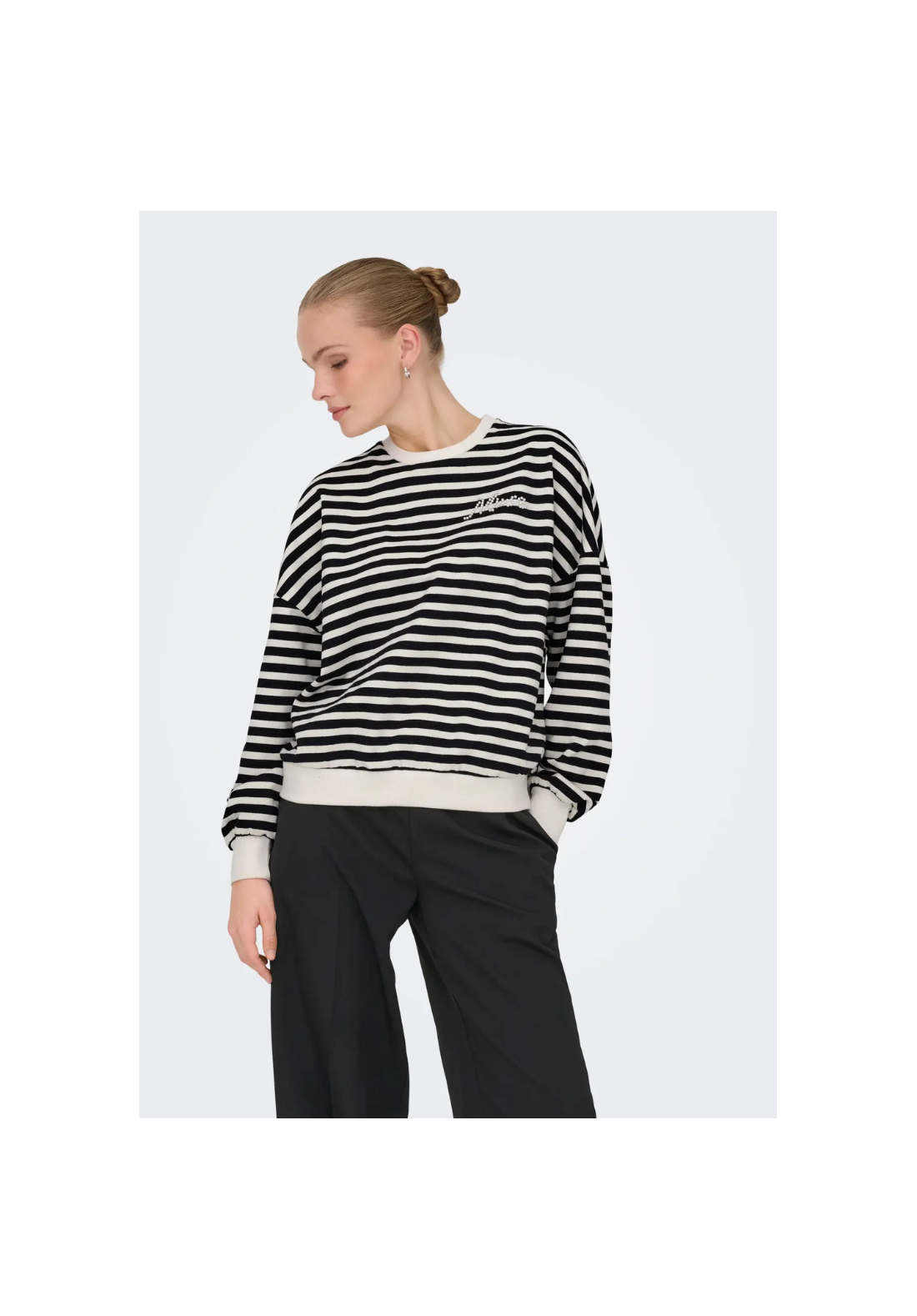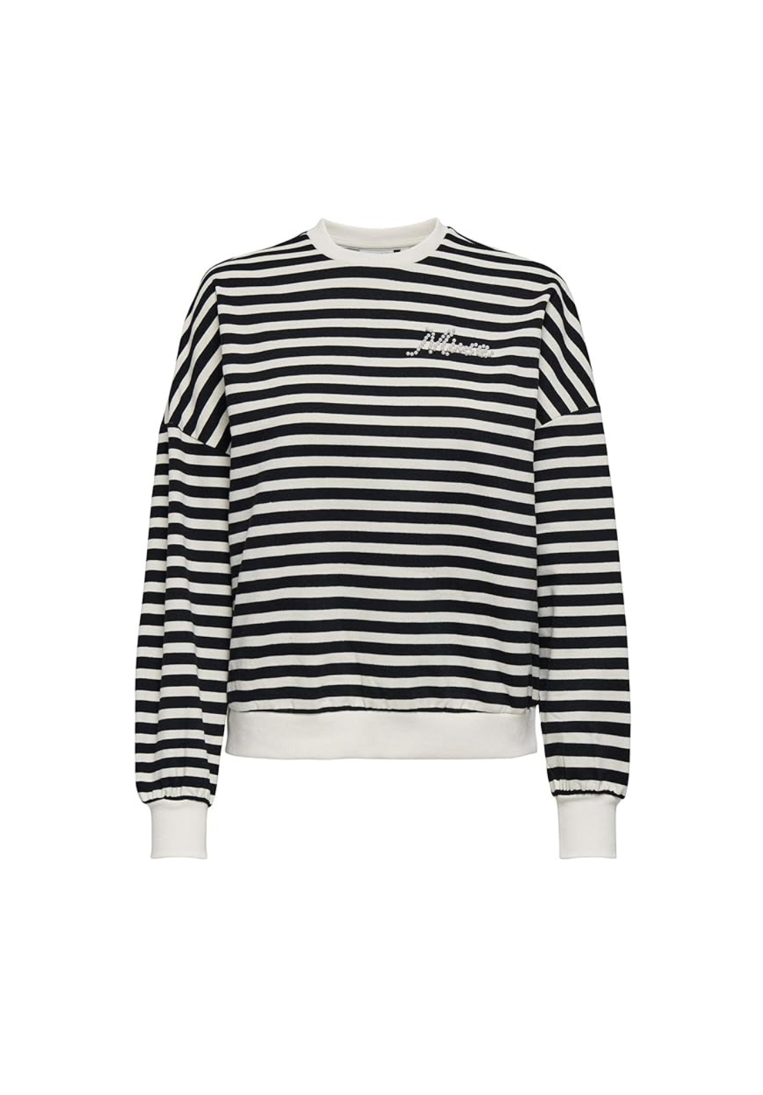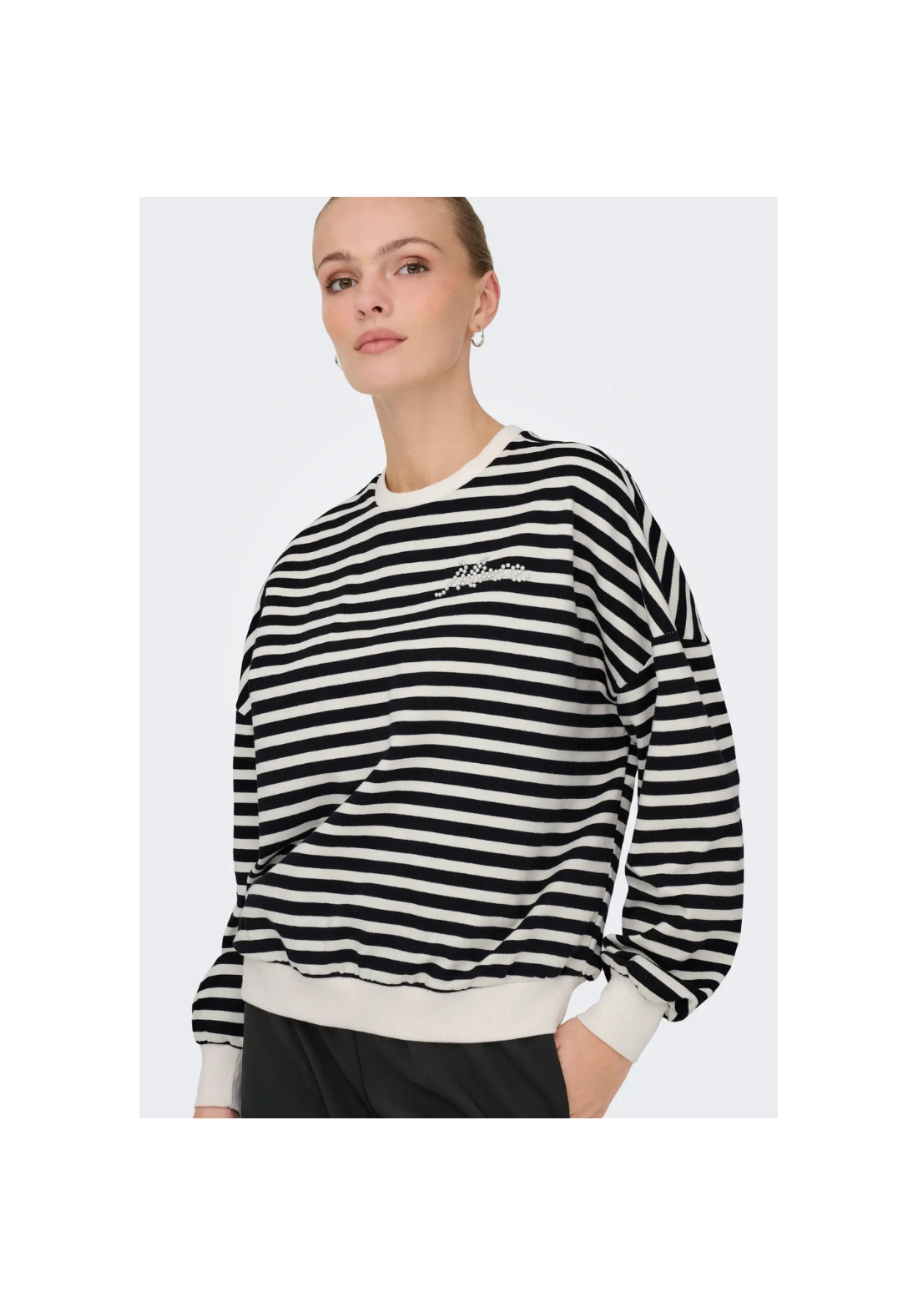 Sudadera a rayas de cuello redondo y con hombros caídos. Detalle de decoración de perlas en pecho.