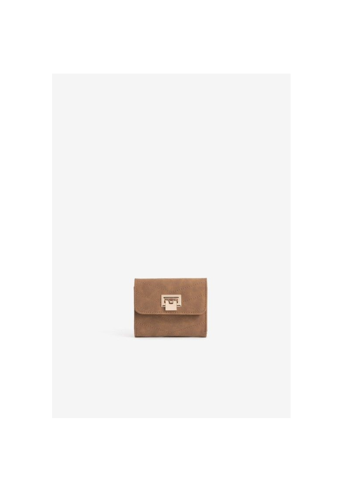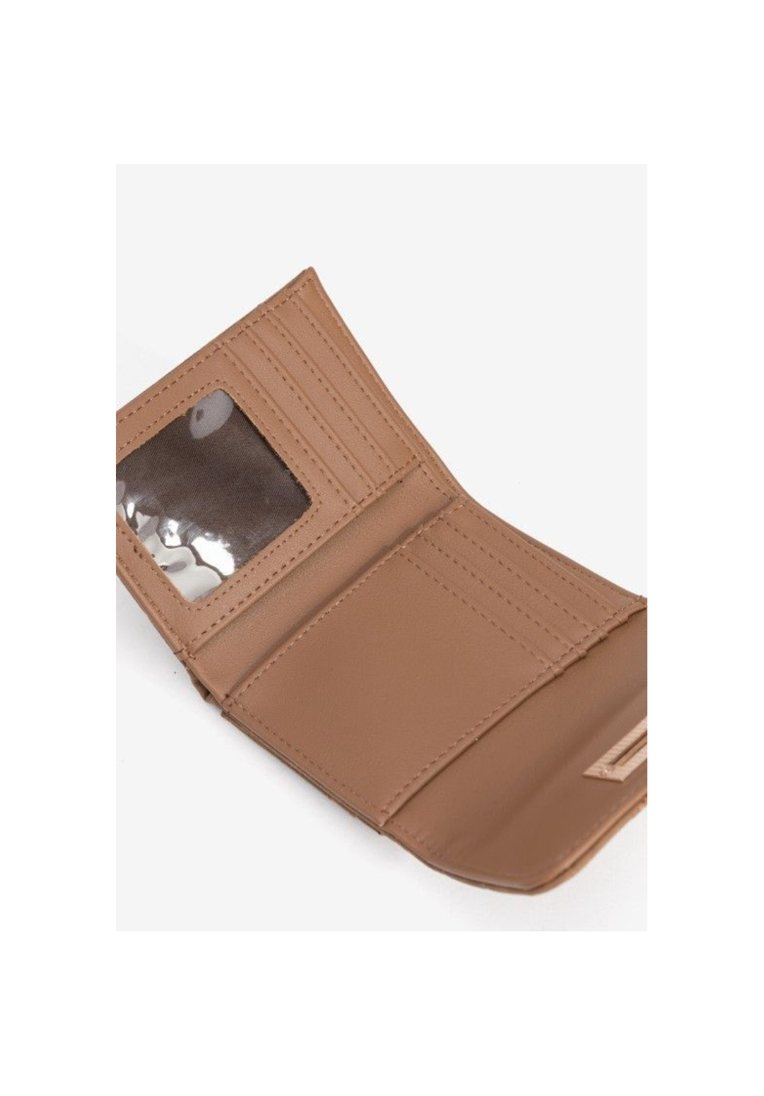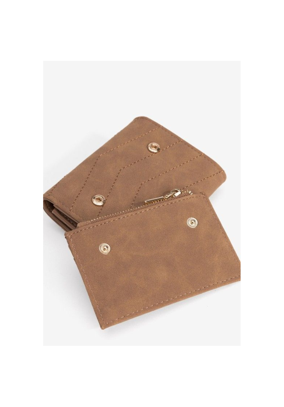 Porta monedas con cierre metálico dorado, costuras visibles y compartimentos prácticos para tarjetas.
