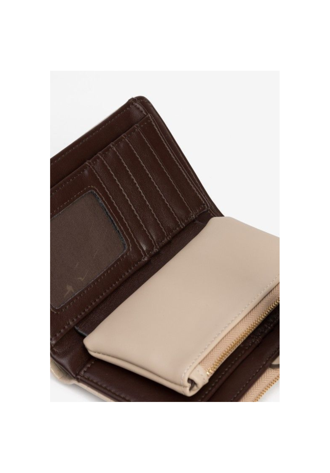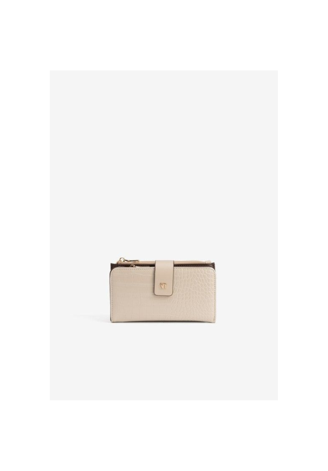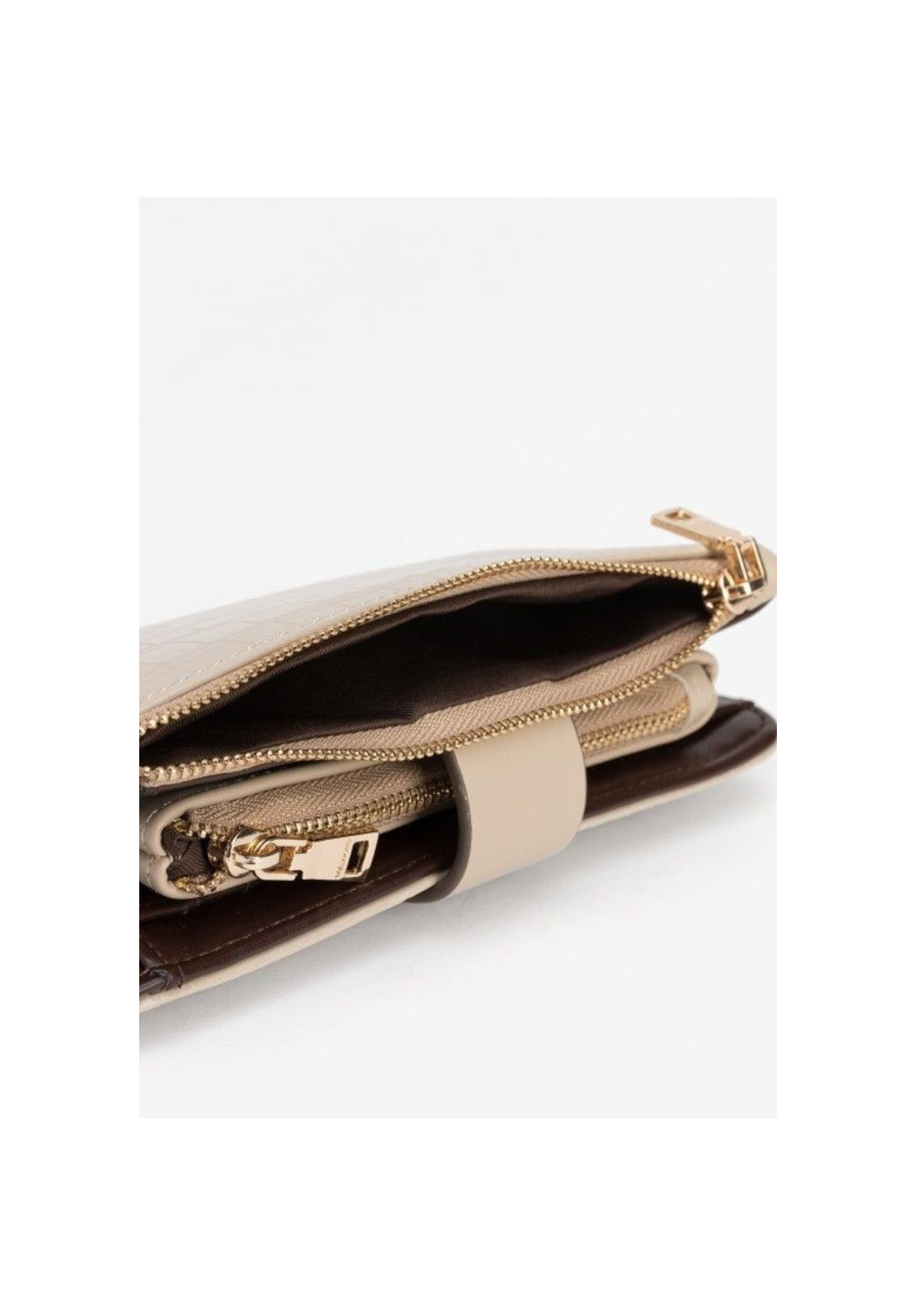 Porta monedas con textura imitación cocodrilo y cierre de botón metálico dorado.