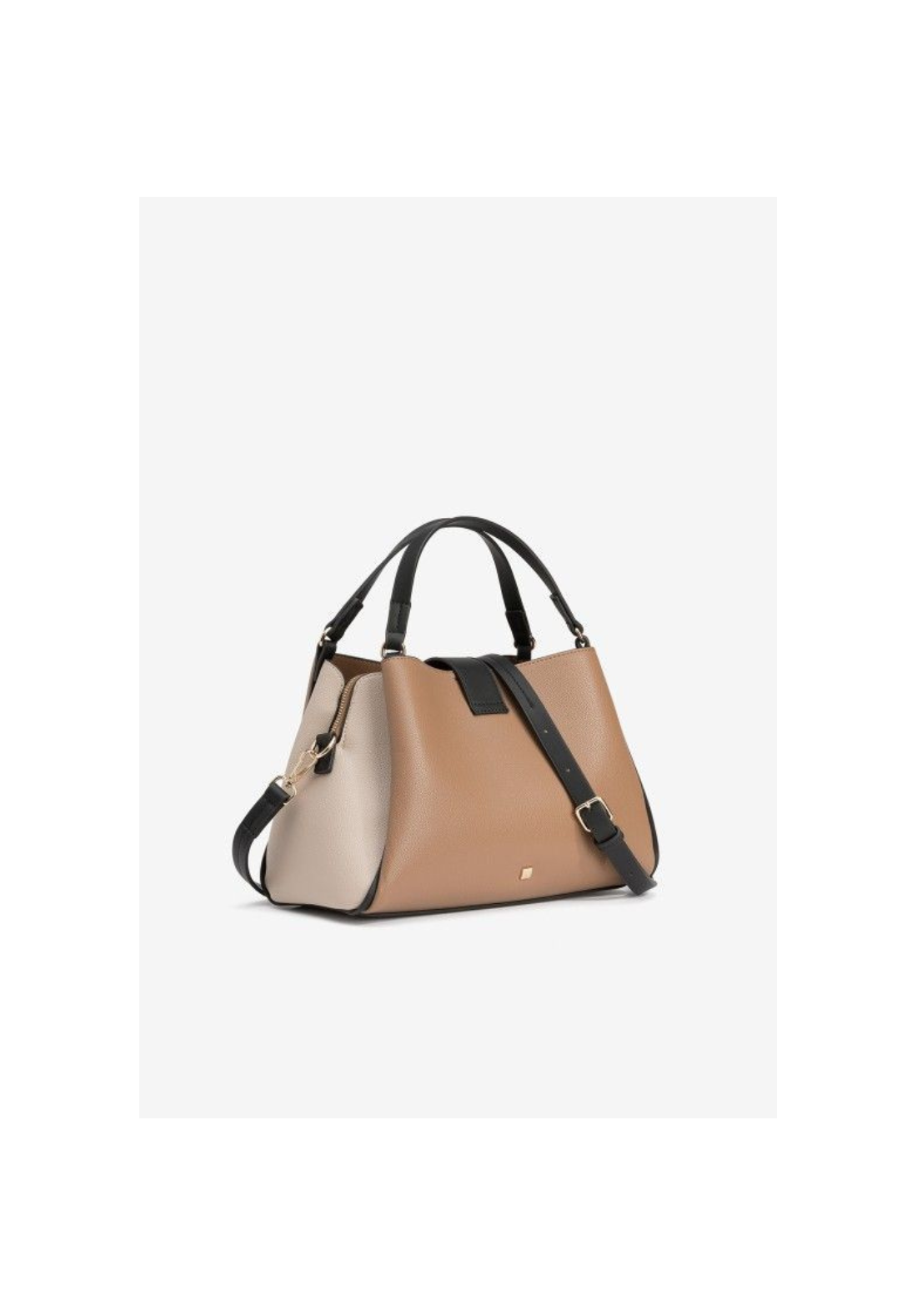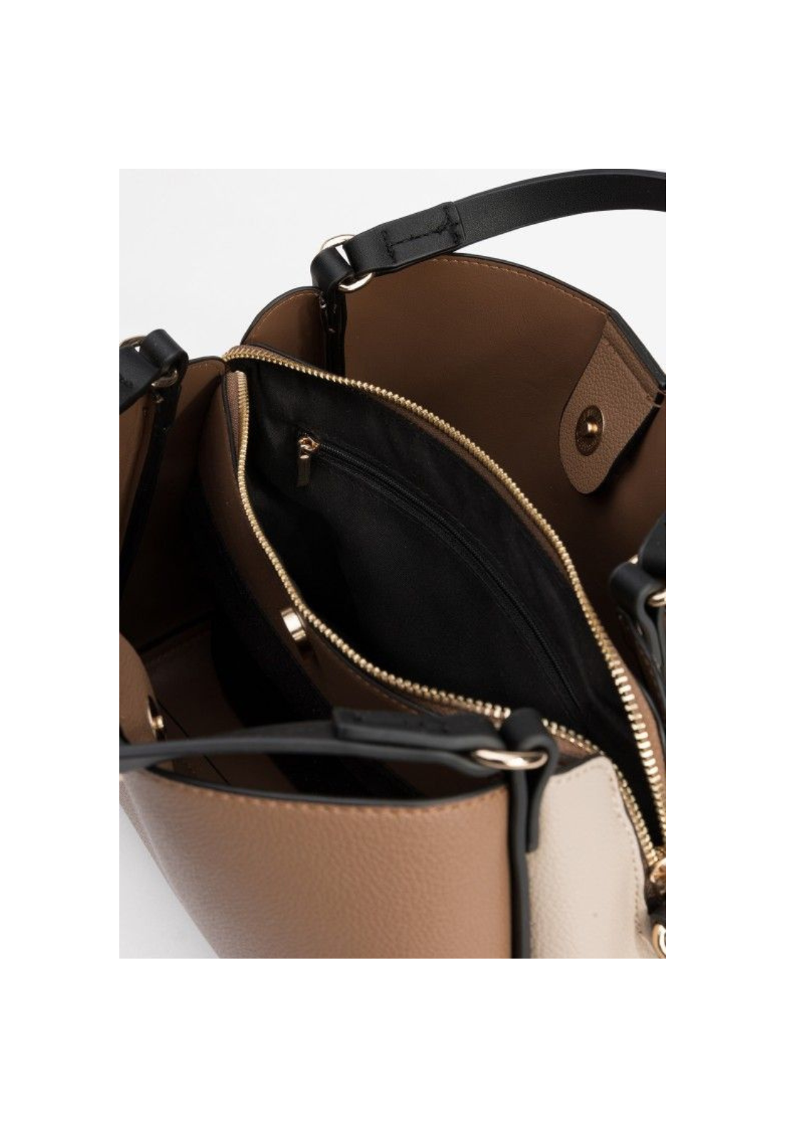 Bolso con asas negras y cierre de cremallera dorado.