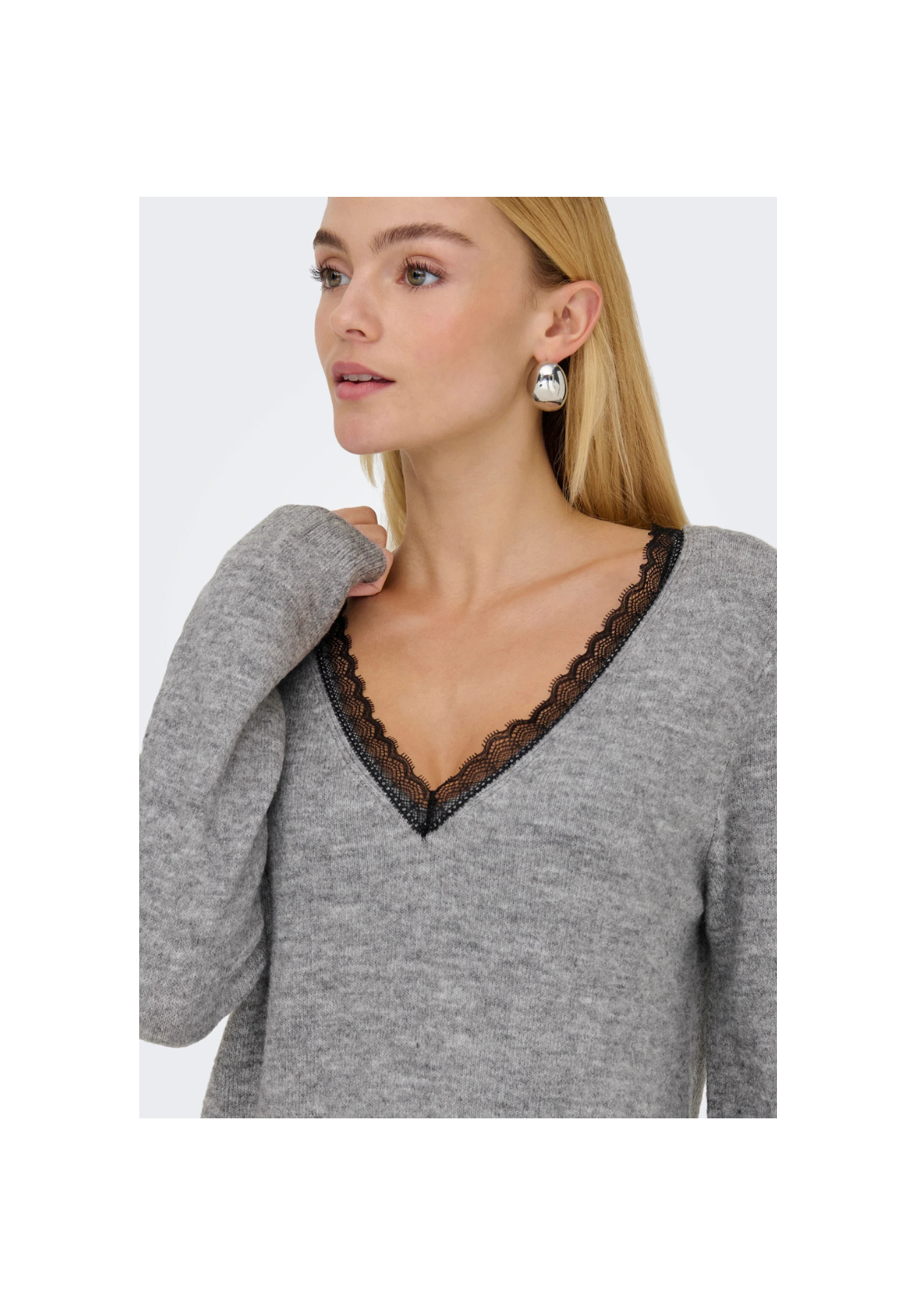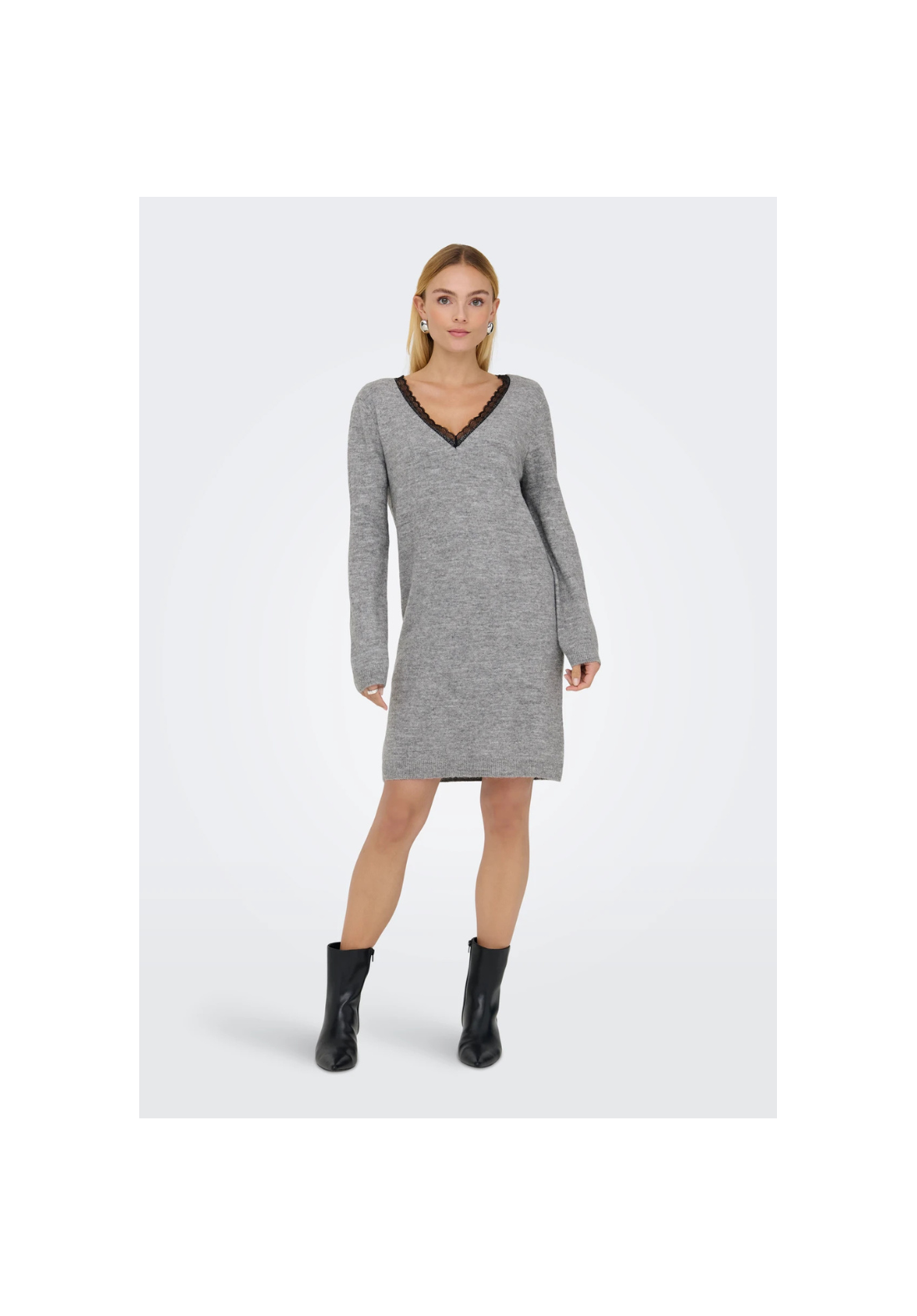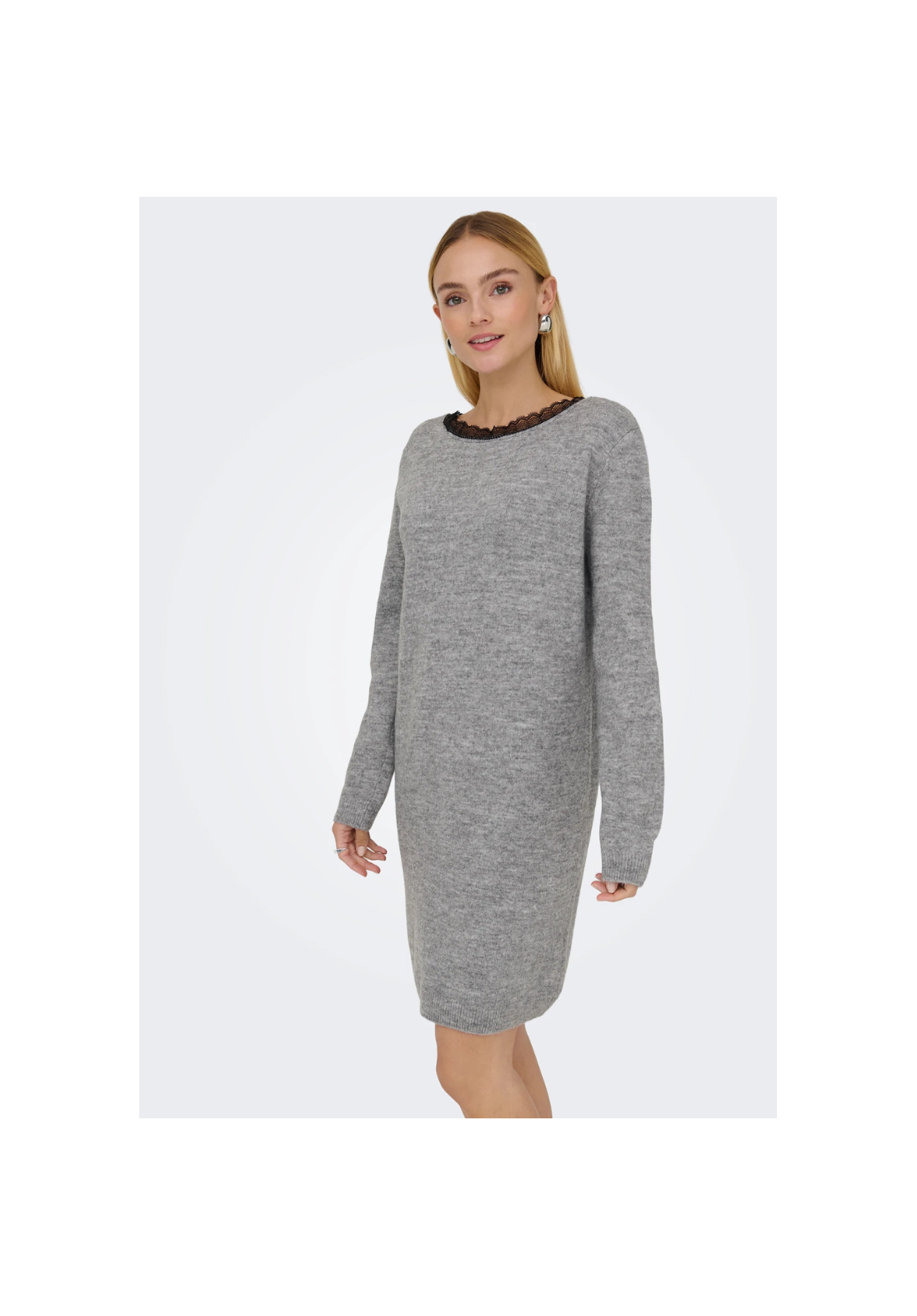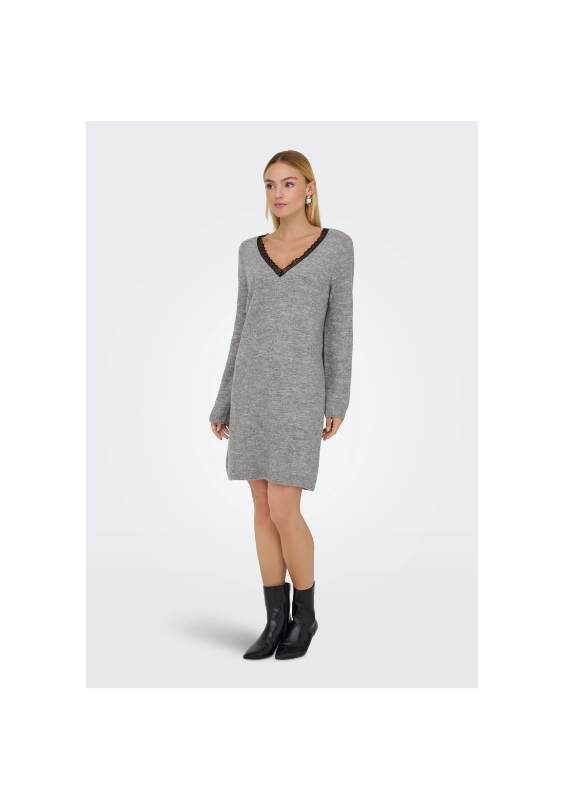 Vestido de punto, de manga larga y cuello en V. Es reversible y tiene detalle de encaje.